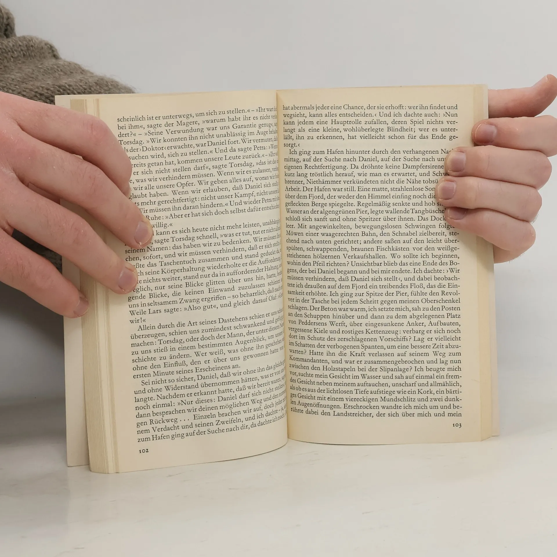 Ein Mann steht vor einer schwerwiegenden Entscheidung. Die Stadt liegt an einem Fjord, ihre Bewohner tragen nordische Namen. Im übrigen ist es eine Stadt wie viele andere. Das Leben in ihr geht seinen geordneten Gang. Nur einmal riß ein Ereignis die Stadt aus ihrem Dahinleben. Und dieses Ereignis wurde zum Inhalt des Stadtgesprächs, das nicht verstummen wollte und im Laufe der Jahre viele Veränderungen erfuhr. Zur Zeit der Besetzung waren nach einem Attentat vierundvierzig Geiseln festgenommen worden. Daniel, der junge Chef des Widerstandes, sollte auf diese Weise gezwungen werden, sich der Besatzungsmacht zu stellen. Er stand damals vor der Entscheidung, die Freunde zu opfern oder den Widerstand zu beenden. Der Erzähler Tobias erinnert sich an jene Tage und versucht, die Haltung der Betroffenen gerecht zu beurteilen. Unaufdringlich bringt der Autor den Leser in Beziehung zu den Geschehnissen. Er macht deutlich, daß es keine Moral gibt, die für sich beanspruchen kann, in dieser Ausnahmesituation eine schnelle Antwort bereit zu haben.