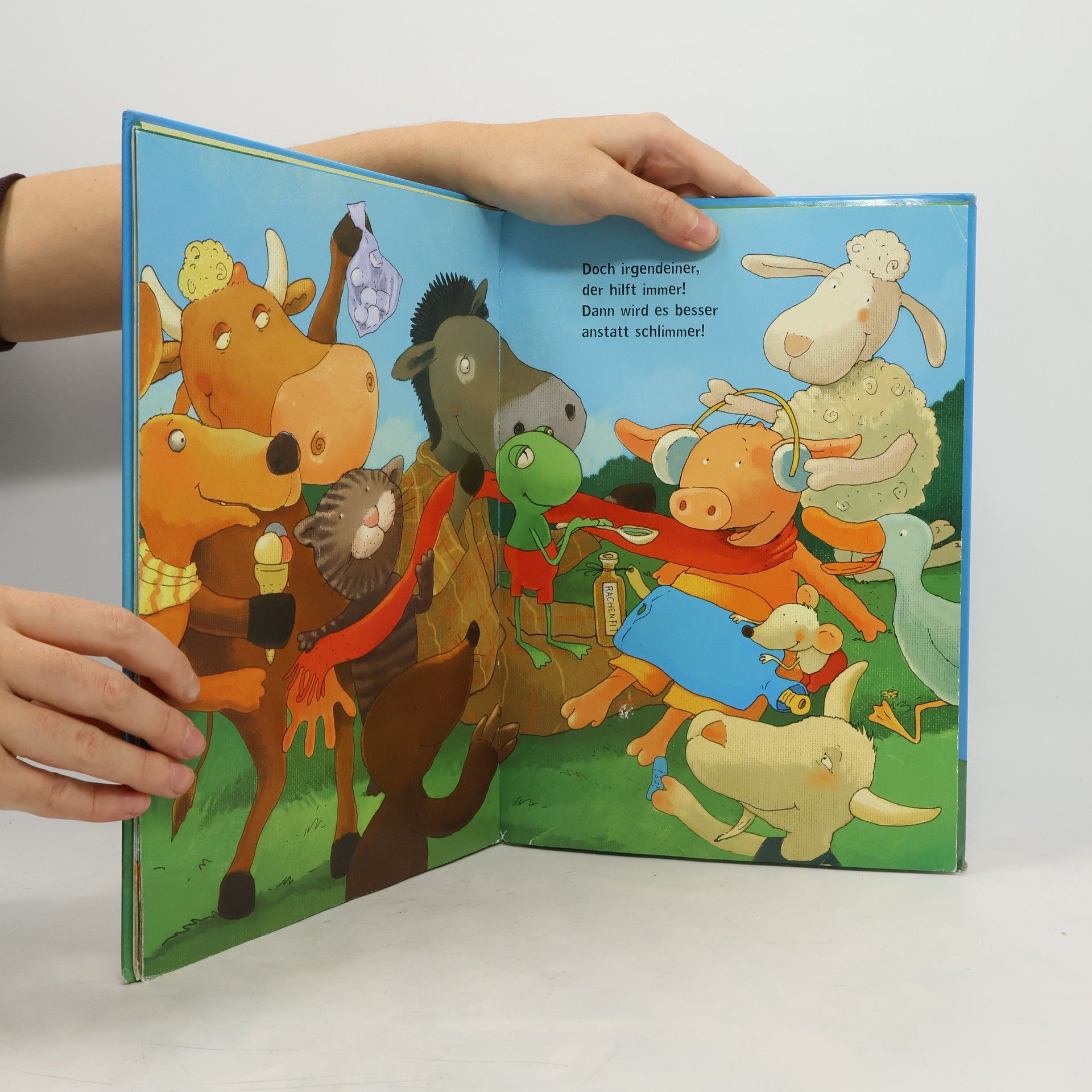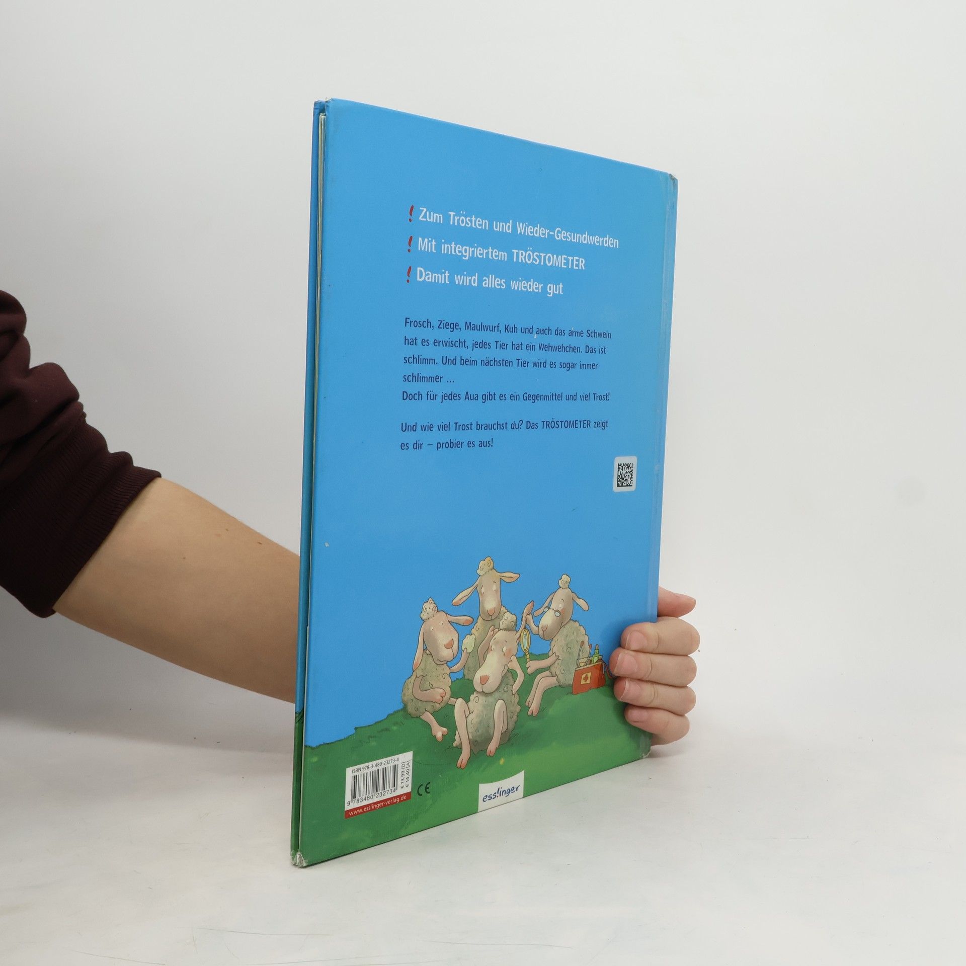 Damit wird alles wieder gut! Frosch, Ziege, Maulwurf, Kuh und auch das arme Schwein hat es erwischt, jedes Tier hat ein Wehwehchen. Und bei jedem Tier ist es ganz schön schlimm, und beim nächsten wird es sogar noch schlimmer. Doch für jedes Aua gibt es viel Trost und ein Gegenmittel – und so heißt es zum Schluss: „Doch irgendeiner, der hilft immer! Dann wird es besser anstatt schlimmer!“ Mit dem integrierten TRÖSTOMETER am Ende des Buches können die Kinder selbst einstellen, wie viel Trost sie gerade benötigen: Reicht einmal feste Knuddeln oder schon eine Vorlesegeschichte oder sogar ein freier Wunsch ...
