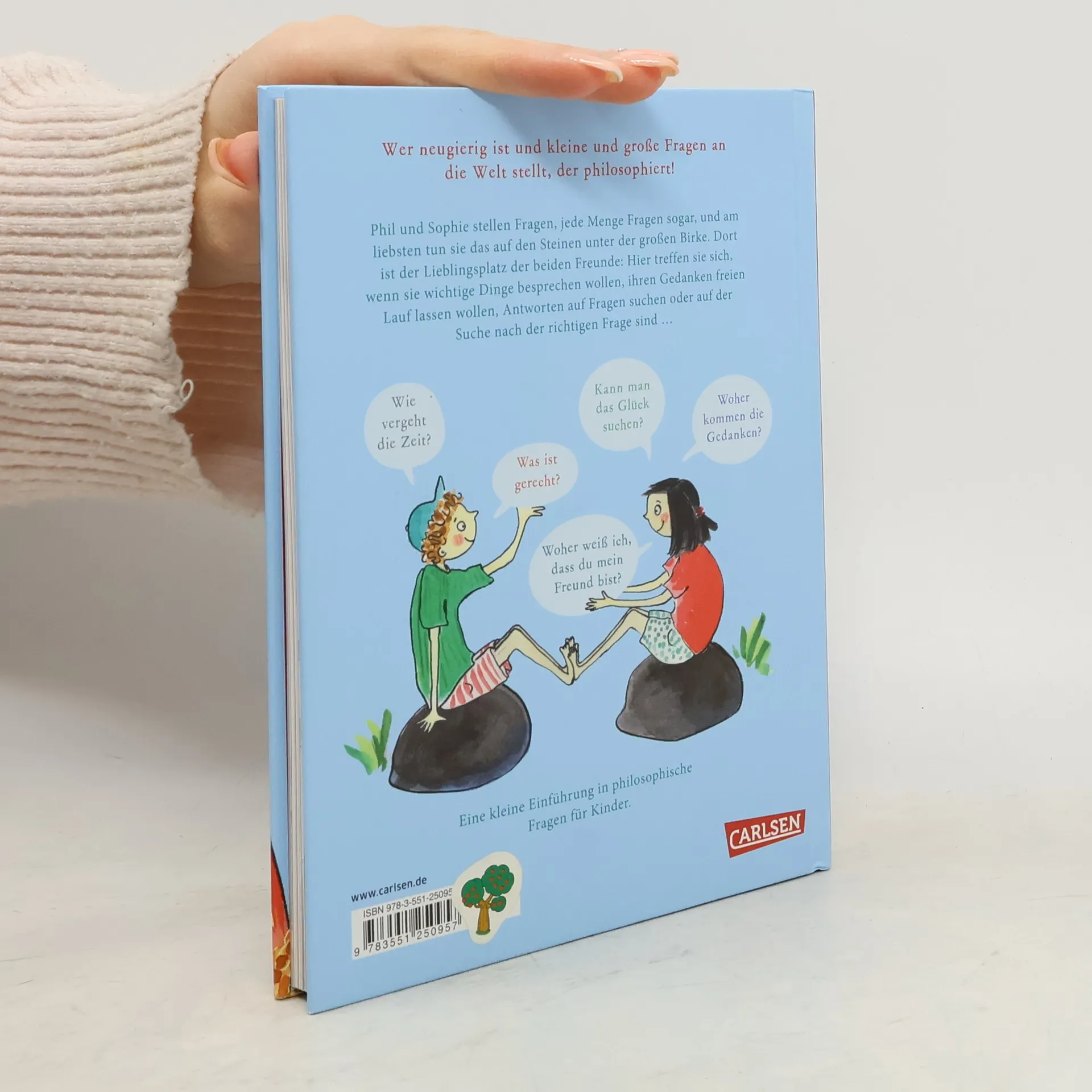 13 kurze philosophische Geschichten, die zum Mitdenken, Nachdenken und Neugierig sein einladen! Woher weiß ich, dass du mein Freund bist? Wie vergeht die Zeit? Was ist gerecht? Kann man das Glück suchen? Über diese und weitere große und kleine Fragen des Lebens sprechen Phil und Sophie. Sie sind beste Freunde, ihr Lieblingsplatz sind die beiden Steine unter der großen Birke. Hier treffen sie sich, wenn sie wichtige Dinge zu besprechen haben, ihren Gedanken freien Lauf lassen wollen oder Antworten auf ihre Fragen suchen – Fragen, mit denen sich nicht nur Phil und Sophie, sondern viele Kinder beschäftigen. Schon die großen Philosophen wie Platon, Aristoteles, Nietzsche, Leibniz oder Rousseau haben Antworten auf diese und andere Fragen des Lebens gesucht. Dieses Buch ist eine Einladung zum Fragen stellen – und wer neugierig ist und Fragen stellt, der philosophiert.