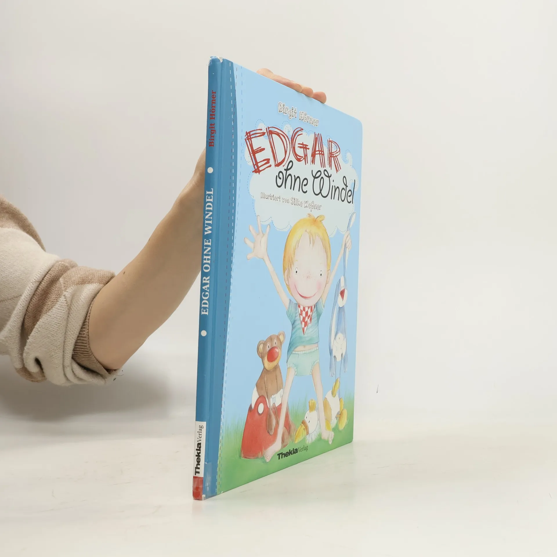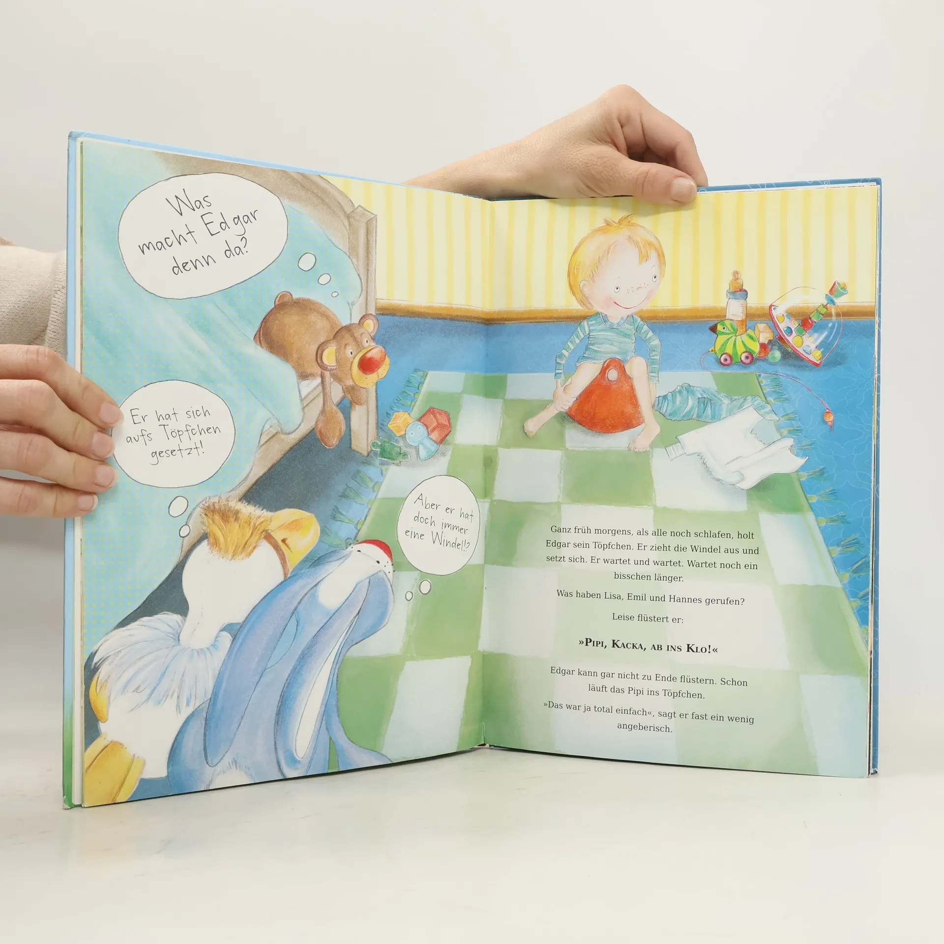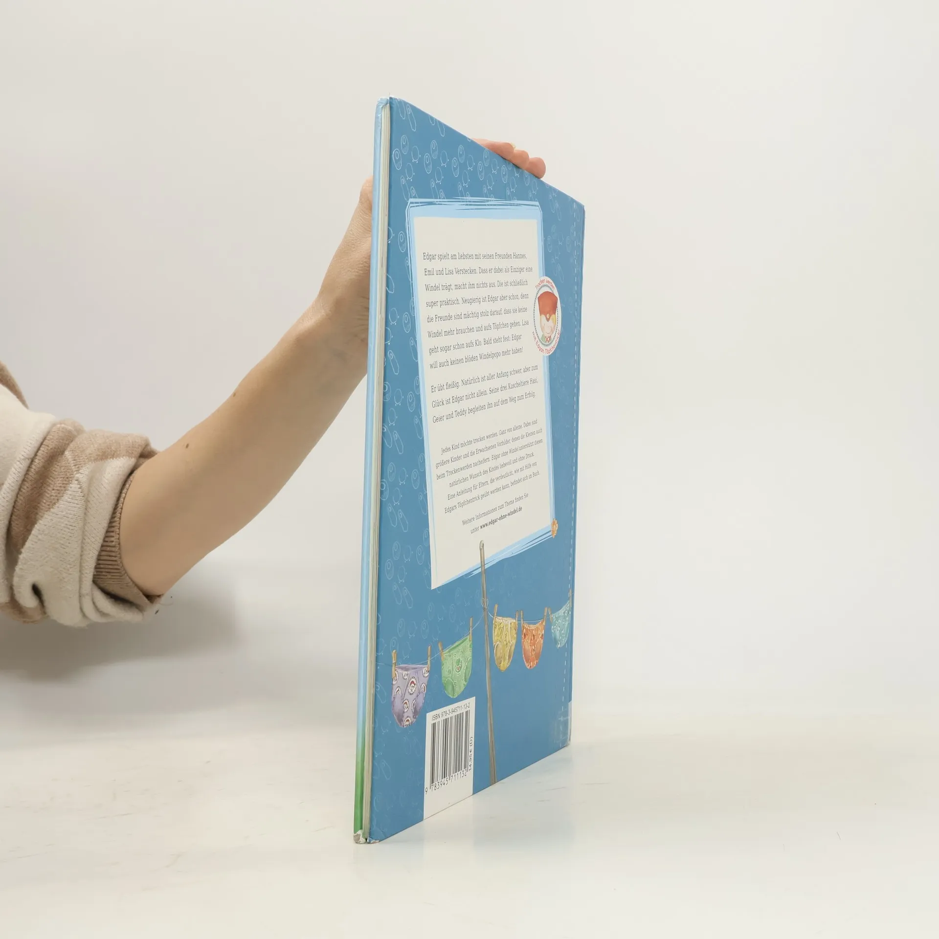 Edgar spielt am liebsten mit seinen Freunden Hannes, Emil und Lisa Verstecken. Dass er dabei als Einziger eine Windel trägt, macht ihm nichts aus. Die ist schließlich super praktisch. Neugierig ist Edgar aber schon, denn die Freunde sind mächtig stolz darauf, dass sie keine Windel mehr brauchen und aufs Töpfchen gehen. Lisa geht sogar schon aufs Klo. Bald steht fest: Edgar will auch keinen blöden Windelpopo mehr haben! Er übt fleißig. Natürlich ist aller Anfang schwer, aber zum Glück ist Edgar nicht allein. Seine drei Kuscheltiere Hasi, Geier und Teddy begleiten ihn auf dem Weg zum Erfolg. Jedes Kind möchte trocken werden. Ganz von alleine. Dabei sind größere Kinder und die Erwachsenen Vorbilder, denen die Kleinen auch beim Trockenwerden nacheifern. Edgar ohne Windel unterstützt diesen natürlichen Wunsch des Kindes liebevoll und ohne Druck. Eine Anleitung für Eltern, die verdeutlicht, wie mit Hilfe von Edgars Töpfchentrick geübt werden kann, befindet sich im Buch.
