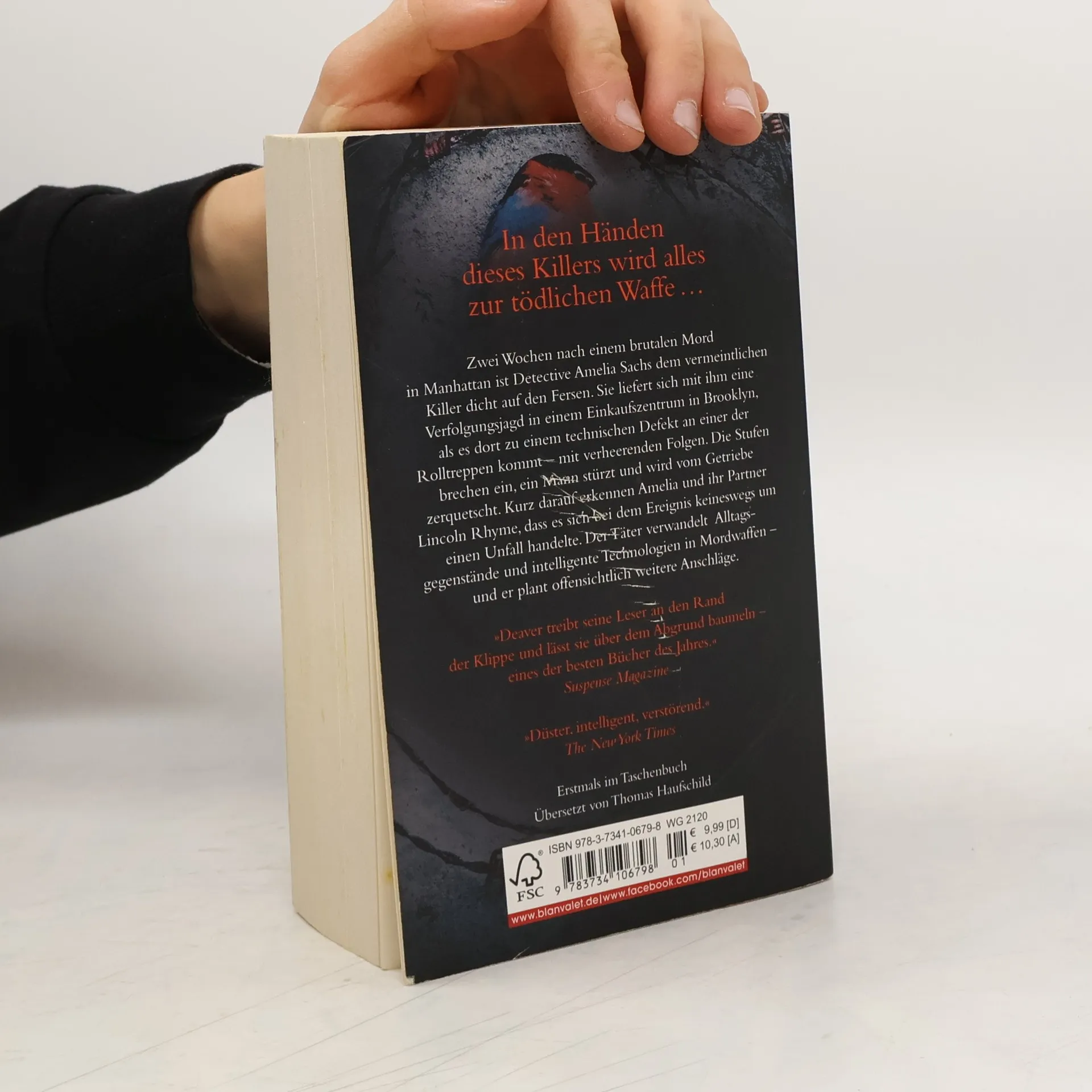 Der 12. Fall für Lincoln Rhyme und Amelia Sachs. Zwei Wochen nach einem brutalen Mord in Manhattan ist Detective Amelia Sachs dem vermeintlichen Killer dicht auf den Fersen. Sie liefert sich mit ihm eine Verfolgungsjagd in einem Einkaufszentrum in Brooklyn, als es dort zu einem technischen Defekt an einer der Rolltreppen kommt – mit verheerenden Folgen. Die Stufen brechen ein, ein Mann stürzt und wird vom Getriebe zerquetscht. Kurz darauf erkennen Amelia und ihr Partner Lincoln Rhyme, dass es sich bei dem Ereignis keineswegs um einen Unfall handelte. Der Täter verwandelt Alltagsgegenstände und intelligente Technologien in Mordwaffen – und er plant offensichtlich weitere Anschläge.