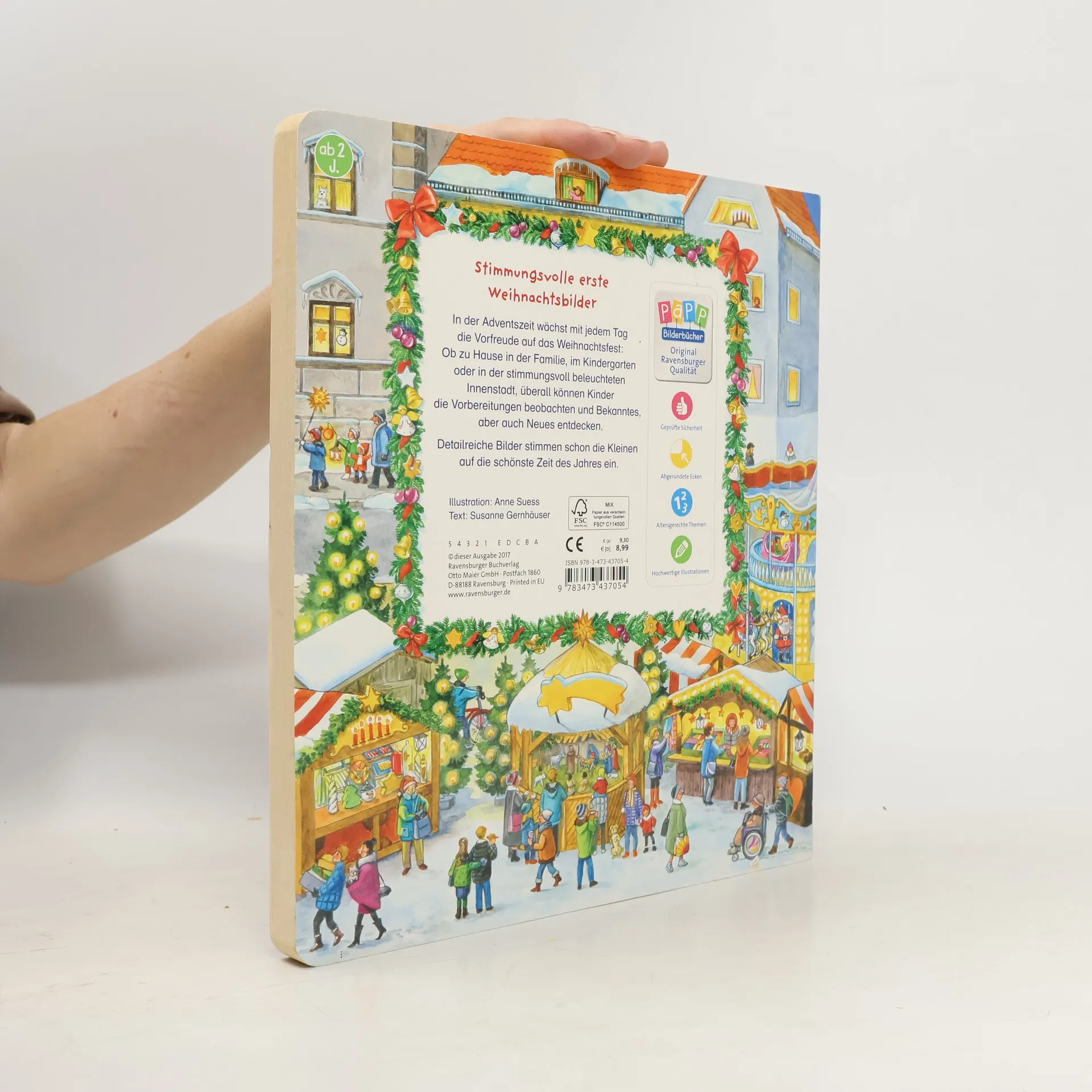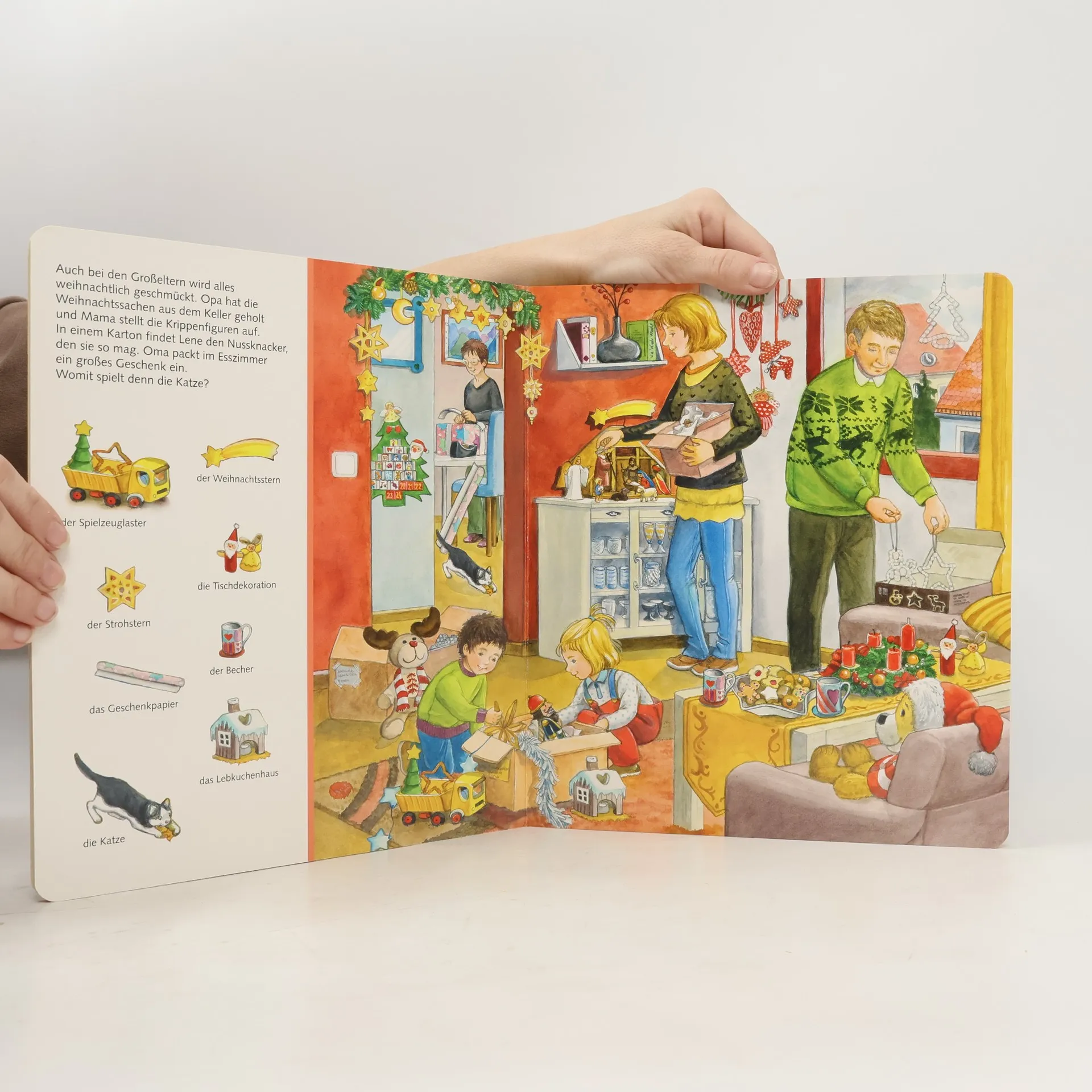 Großformatige, stimmungsvolle Weihnachtsbilder, seitlich ergänzt durch zahlreiche Suchvignetten, unterhalten die Kleinsten in der Vorweihnachtszeit.