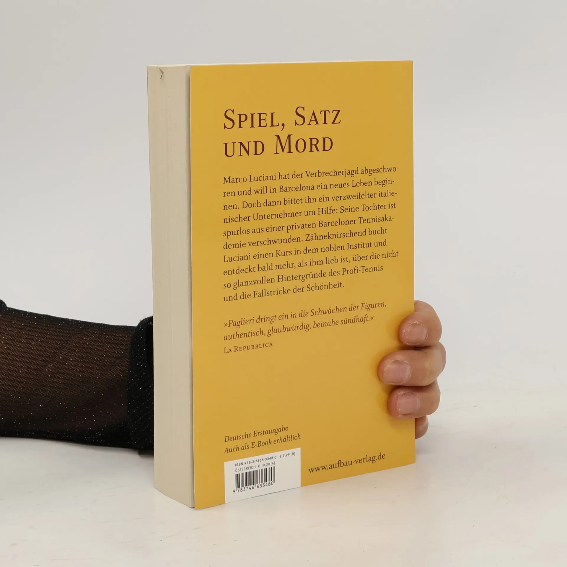 Spiel, Satz und Mord Marco Luciani hat der Verbrecherjagd abgeschworen und will in Barcelona ein neues Leben beginnen. Doch dann bittet ihn ein verzweifelter italienischer Unternehmer um Hilfe: Seine Tochter ist spurlos aus einer privaten Barceloner Tennisakademie verschwunden. Zähneknirschend bucht Luciani einen Kurs in dem noblen Institut und entdeckt bald mehr, als ihm lieb ist, über die nicht so glanzvollen Hintergründe des Profi-Tennis und die Fallstricke der Schönheit. „Paglieri dringt ein in die Schwächen der Figuren, authentisch, glaubwürdig, beinahe sündhaft.“ La Repubblica