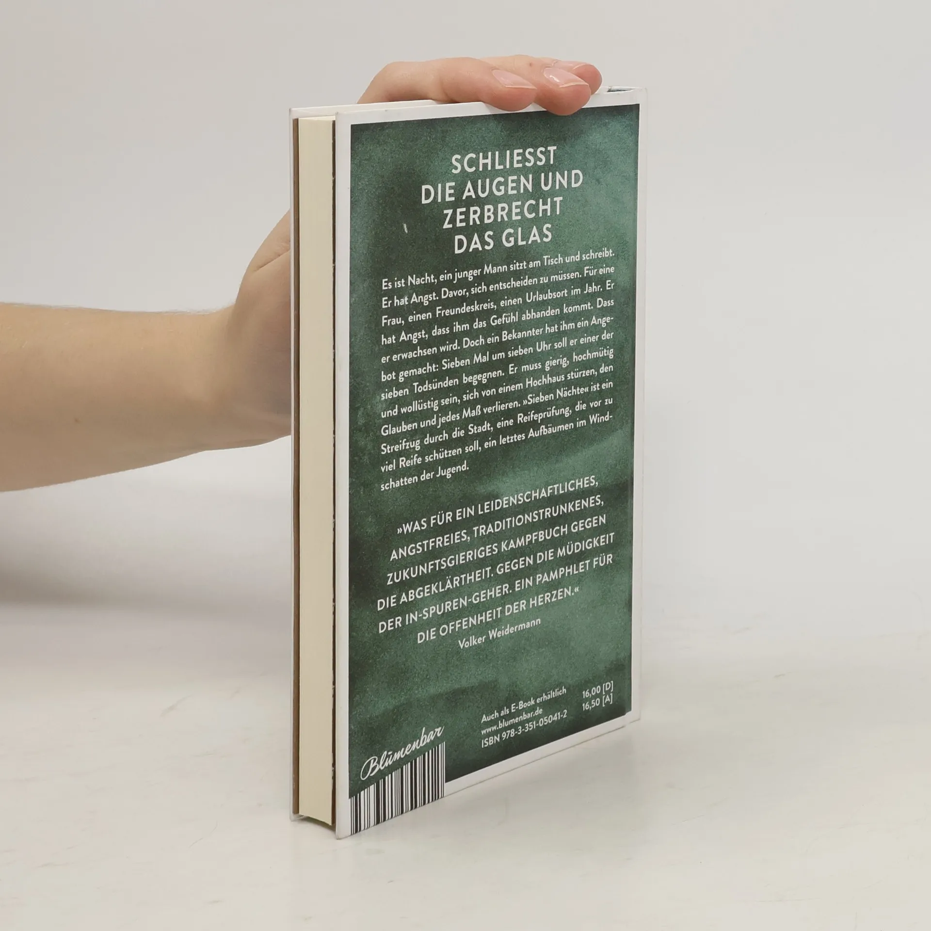 Schließt die Augen und zerbrecht das Glas Es ist Nacht, ein junger Mann sitzt am Tisch und schreibt. Er hat Angst. Davor, sich entscheiden zu müssen. Für eine Frau, einen Freundeskreis, einen Urlaubsort im Jahr. Er hat Angst, dass ihm das Gefühl abhandenkommt. Dass er erwachsen wird. Doch ein Bekannter hat ihm ein Angebot gemacht: Sieben Mal um sieben Uhr soll er einer der sieben Todsünden begegnen. Er muss gierig, hochmütig und wollüstig sein, sich von einem Hochhaus stürzen, den Glauben und jedes Maß verlieren. Sieben Nächte ist ein Streifzug durch die Stadt, eine Reifeprüfung, die vor zu viel Reife schützen soll, ein letztes Aufbäumen im Windschatten der Jugend. Simon Strauß erzählt von einem jungen Mann an der Schwelle, der alles aufbringt, um sich Gewohnheit und Tristesse zu verwehren. Er muss gierig, hochmütig und faul sein, neiden und wüten, Völlerei und Wollust treiben. Sich dem Leben preisgeben, um sich die Empfindung zu erhalten. Im Schutze der Nacht entwickelt er aus der Erfahrung der sieben Todsünden die Konturen einer besseren Welt, eines intensiveren Lebens. »Simon Strauß erzählt von einem, der auszog, um die ewige Jugend zu suchen – und schreibt ein Buch, das so klug und berührend ist, dass man ihm auf der Stelle folgen will.« Theresia Enzensberger »Was für ein leidenschaftliches, angstfreies, traditionstrunkenes, zukunftsgieriges Kampfbuch gegen die Abgeklärtheit. Gegen die Müdigkeit der In-Spuren-Geher. Der Lebenswiederholer. Ein Pamphlet für die Offenheit der Herzen!« Volker Weidermann