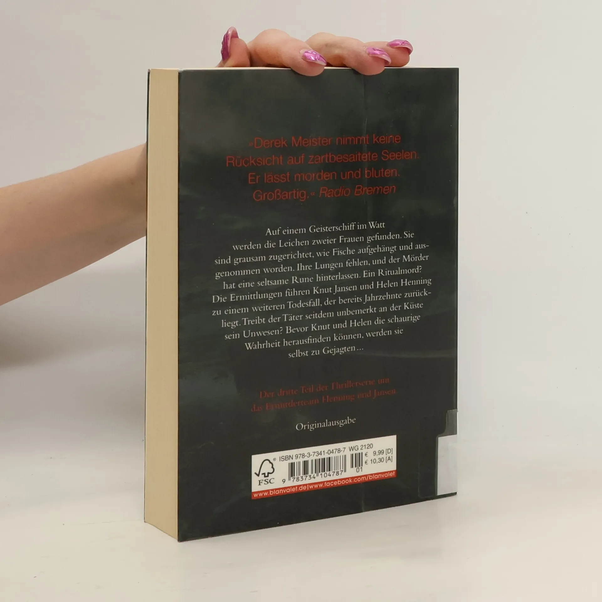 Auf einem Geisterschiff im Watt werden die Leichen zweier Frauen gefunden. Sie sind grausam zugerichtet, wie Fische aufgehängt und ausgenommen worden. Ihre Lungen fehlen, und der Mörder hat eine seltsame Rune hinterlassen. Ein Ritualmord? Die Ermittlungen führen Knut und Helen zu einem weiteren Todesfall, der bereits Jahrzehnte zurückliegt. Treibt ihr Täter seitdem unbemerkt an der Küste sein Unwesen? Bevor Knut und Helen die schaurige Wahrheit herausfinden können, werden sie selbst zu Gejagten ... Der dritte Teil der Thrillerserie um das Ermittlerteam Henning und Jansen.