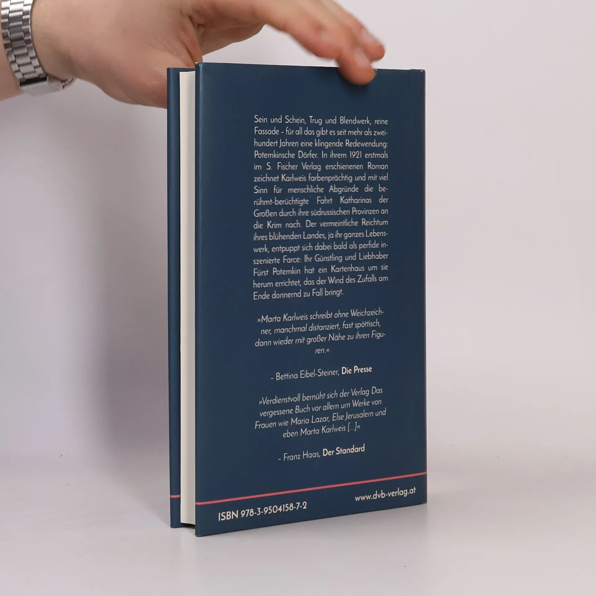 1921 erscheint im renommierten Verlag S. Fischer in Berlin Marta Karlweis‘ einziger historischer Roman. Das ungewöhnliche Buch behandelt die berühmte Fahrt der russischen Kaiserin Katharina der Großen durch ihr Reich. In ihrer Vorstellung sieht sie es in voller Blüte und will sich jetzt, auf dem Höhepunkt ihrer Macht, selbst ein genaues Bild davon machen. Um der Kaiserin den Reichtum und die Fortschrittlichkeit ihres Reiches vorzugaukeln, bedient sich ihr Günstling Potemkin eines perfiden Tricks. Er lässt schmucke Holzfassaden einiger Städte und Dörfer hinter ihr abbrechen und immer wieder neu vor ihr aufstellen, je weiter die Reise geht. Diese Maskerade lässt sich jedoch nicht ewig aufrechterhalten. Das Lebenswerk der Kaisern, das in ihren Augen dem russischen Volk Segen und Wohlstand hätte bringen sollen, bricht irgendwann wie ein großes Kartenhaus in sich zusammen.