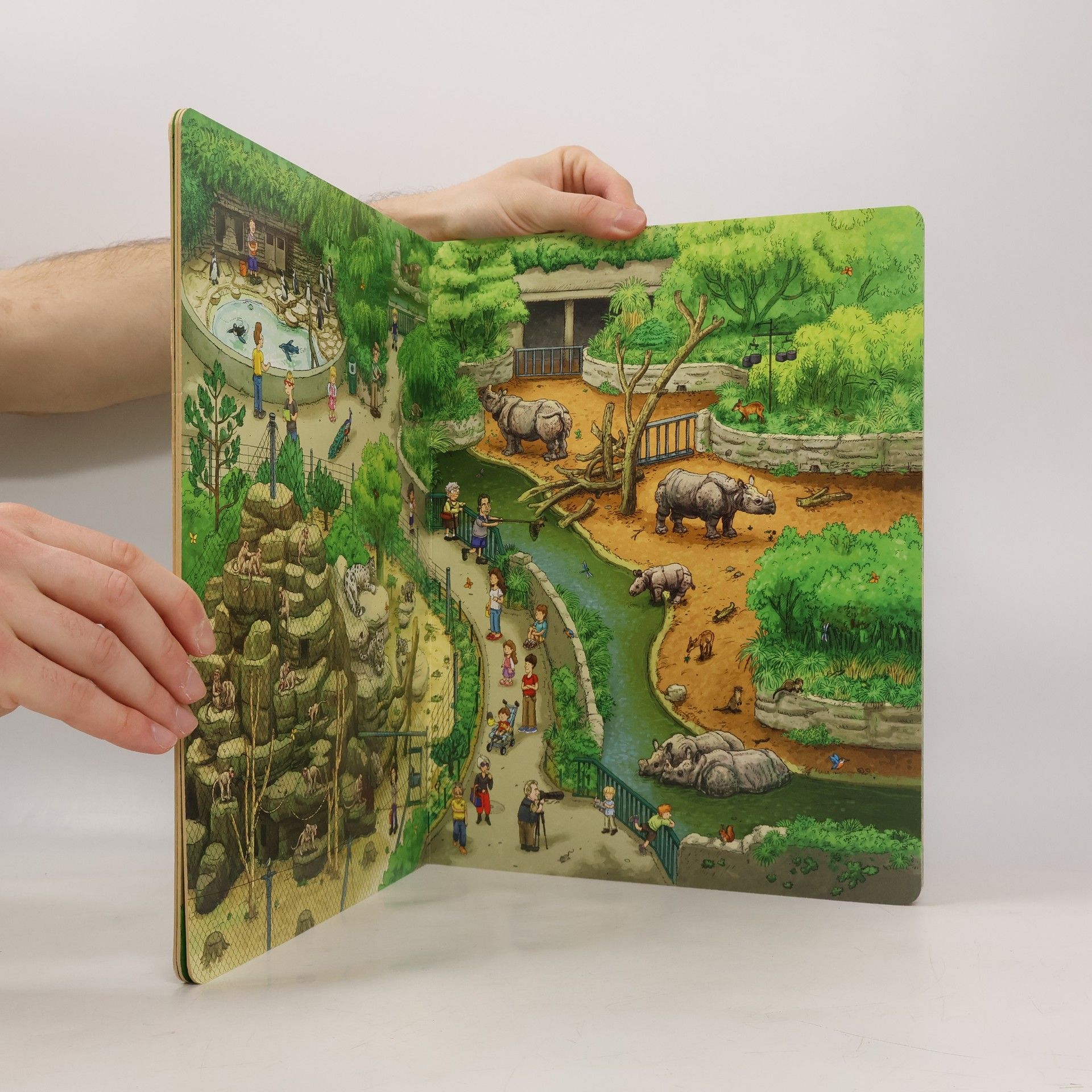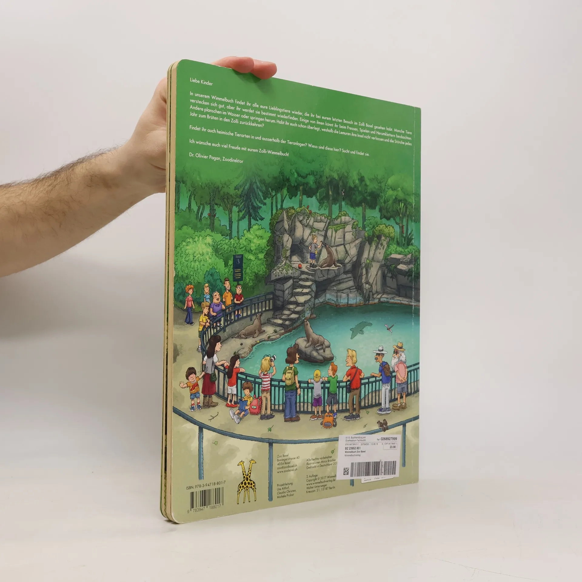 Liebe Kinder In unserem Wimmelbuch findet ihr alle eure Lieblingstiere wieder, die ihr bei eurem letzten Besuch im Zolli Basel gesehen habt. Manche Tiere verstecken sich gut, aber ihr werdet sie bestimmt wiederfinden. Einige von ihnen könnt ihr beim Fressen, Spielen und Herumklettern beobachten. Andere planschen im Wasser oder springen herum. Habt ihr euch schon überlegt, weshalb die Lemuren ihre Insel nicht verlassen und die Störche jedes Jahr zum Brüten in den Zolli zurückkehren? Findet ihr auch heimische Tierarten in und ausserhalb der Tieranlagen? Wieso sind diese hier? Sucht und findet sie. Ich wünsche euch viel Freude mit eurem Zolli-Wimmelbuch! Dr. Olivier Pagan, Zoodirektor