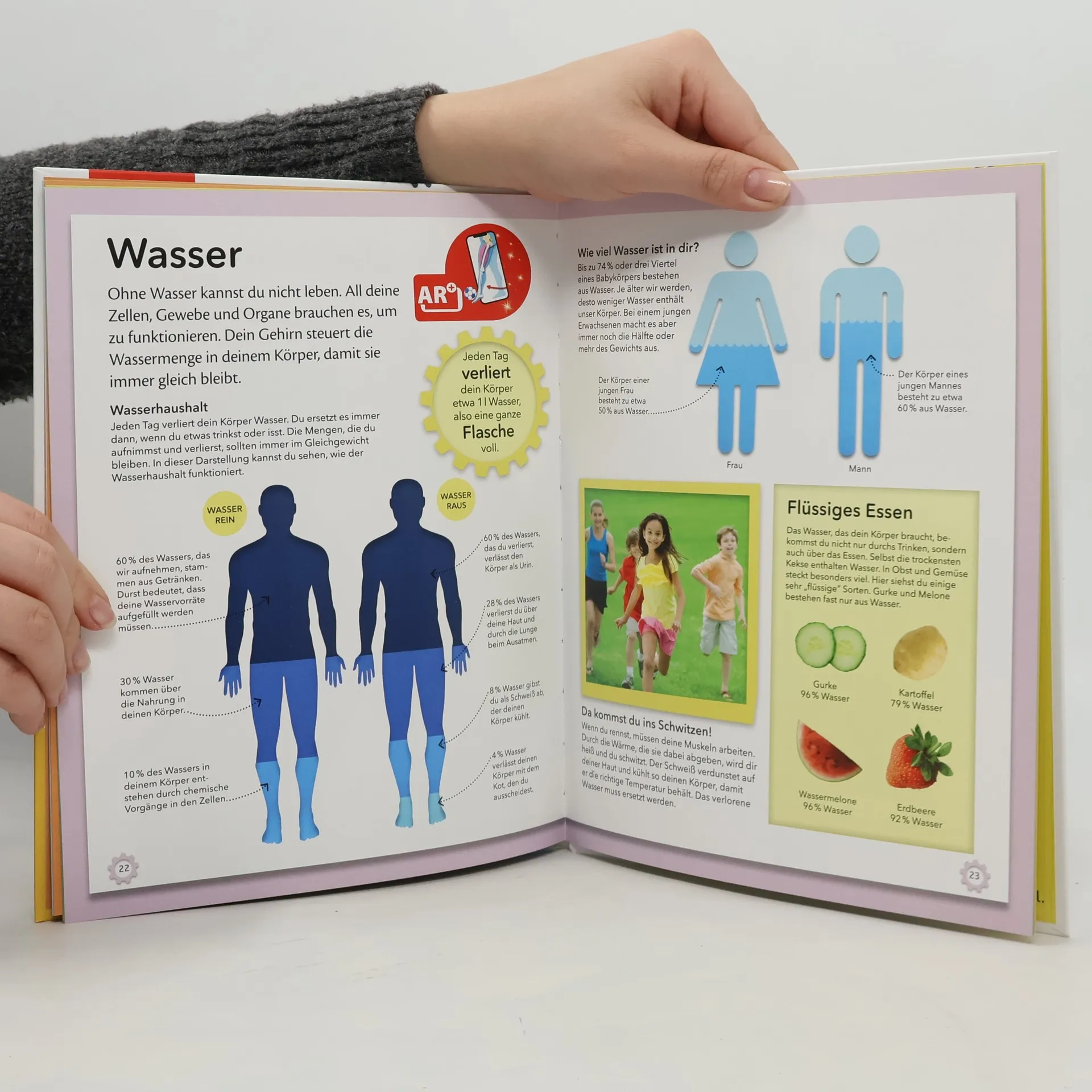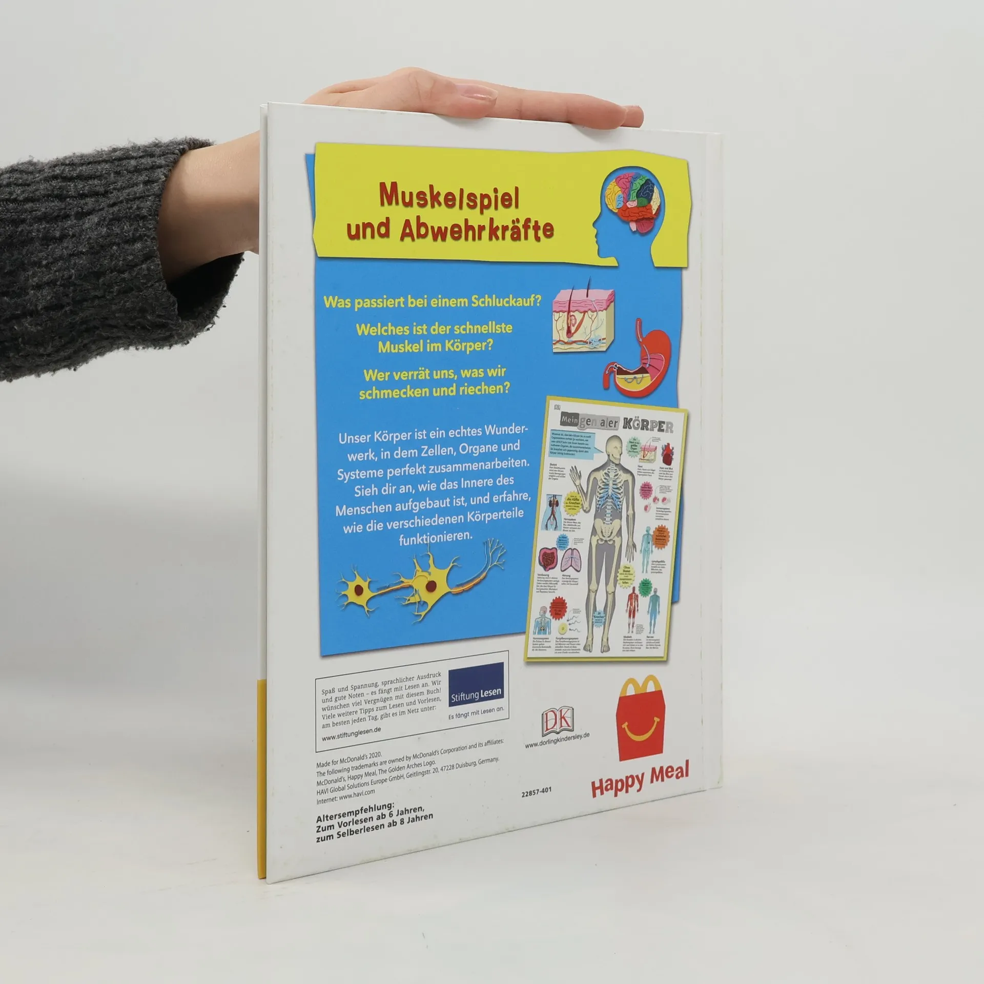 Ausgezeichnet als Wissensbuch des Jahres 2018 von Bild der Wissenschaft! Seid ihr bereit für eine spannende Entdeckungstour durch den menschlichen Körper? Dieses Buch nimmt die wichtigsten Organe und Funktionsweisen genau unter die Lupe – von den kleinsten Zellen über verschiedene Gewebe bis zu Gehirn, Herz und Lunge. Erforscht das wohl faszinierendste Wunderwerk der Natur! Was passiert, wenn wir schlafen? Warum müssen wir niesen? Wie wächst ein Baby im Bauch? Einzigartige plastische Illustrationen gewähren euch fantastische Einblicke in das menschliche Innere und zeigen euch, wie verschiedene Körperteile und Organe als System zusammenarbeiten. So erfahrt ihr, wie die Muskeln, Gelenke und Knochen im Bein zusammenwirken, wenn ihr einen Fußball schießt oder wie euer Gehirn funktioniert. Um euer Wissen zu festigen, gibt es außerdem ein riesiges Poster, mit dem ihr euch die gelernten Fakten nochmal visualisieren könnt. Wie gut ihr über den menschlichen Körper Bescheid wisst, könnt ihr anschließend in einem kniffligen Körper-Quiz testen. Hier bekommt ihr Wissen und Spaß in einem Paket! Dieses Buch ist bei Antolin. de verfügbar.