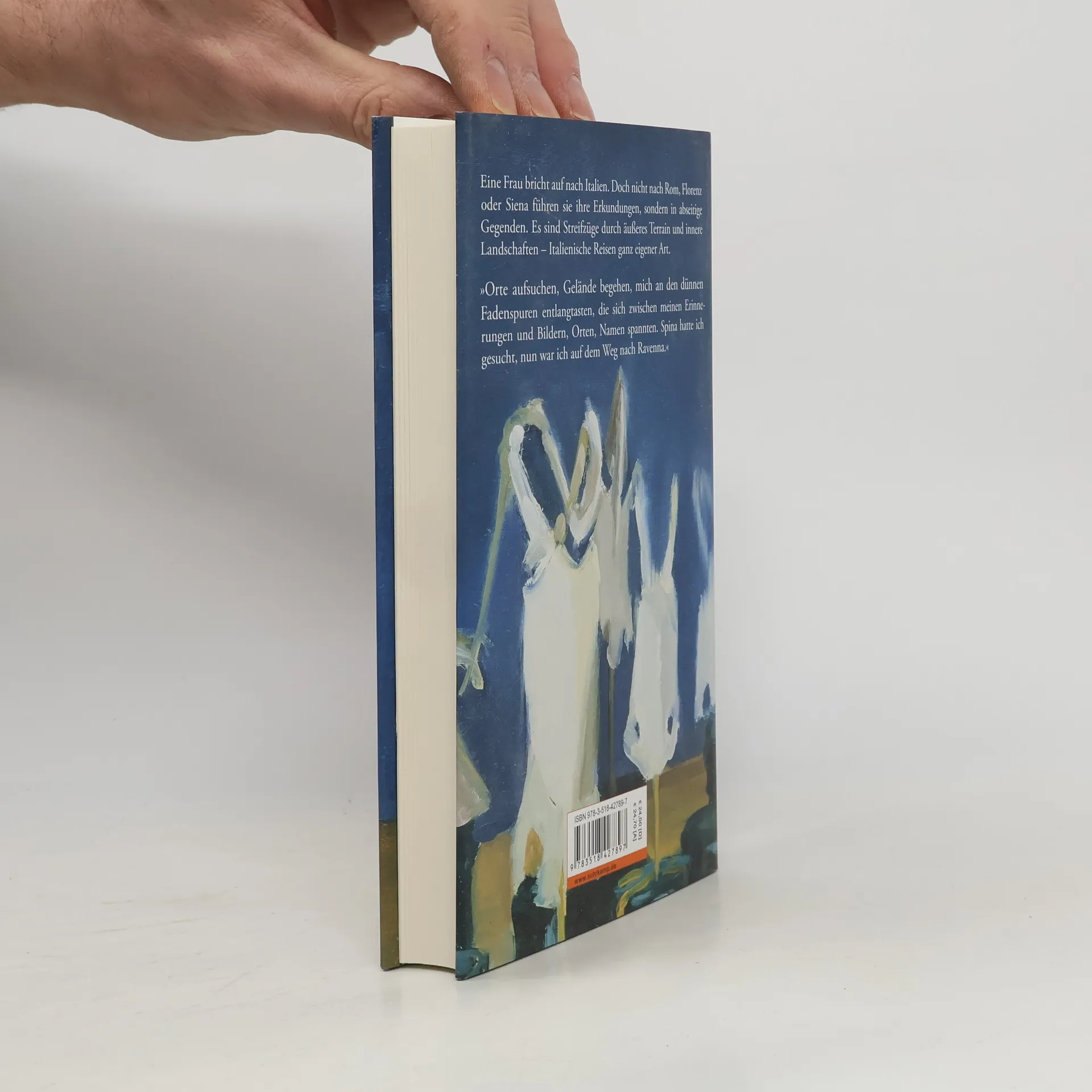 Drei Reisen unternimmt die Ich-Erzählerin in Esther Kinskys Geländeroman . Alle drei führen sie nach Italien, doch nicht an die bekannten, im Kunstführer verzeichneten Orte, nicht nach Rom, Florenz oder Siena, sondern in abseitige Landstriche und Gegenden – nach Olevano Romano etwa, einer Kleinstadt in den Hügeln nordöstlich der italienischen Hauptstadt gelegen, oder in die Valli di Comacchio, die Lagunenlandschaft im Delta des Po, halb von Vögeln beherrschte Wasserwelt, halb dem Wasser abgetrotztes Ackerland. Zwischen diesen beiden Geländeerkundungen im Gebirge und in der Ebene führt die dritte Reise die Erzählerin zurück in die Kindheit: Wie bruchstückhafte Filmsequenzen tauchen die Erinnerungen an zahlreiche Fahrten durch das Italien der Siebzigerjahre auf, dominiert von der Figur des Vaters. Esther Kinskys Streifzüge und Wanderungen – im Gedächtnis ebenso wie gehend oder fahrend in der Gegenwart – sind Italienische Reisen eigener Art. Sie erkunden mit allen Sinnen äußeres Terrain und führen doch ins Innere, zu Abbrüchen der Trauer und des Schmerzes und zu Inseln des Trostes. Der einfühlsame, präzise Blick der Reisenden entlockt jedem Gelände, was eigentlich im Verborgenen liegt: Geheimnis und Schönheit.