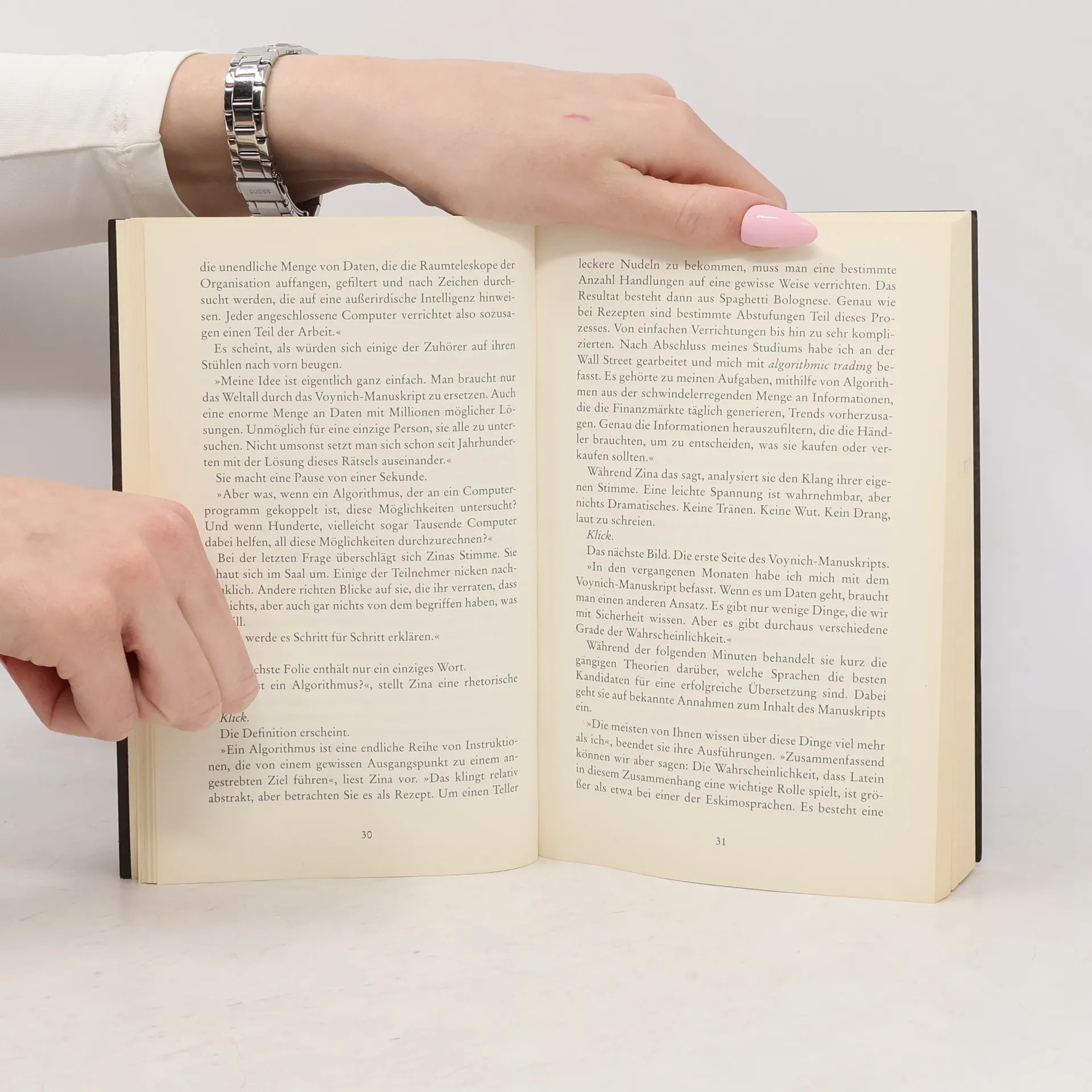 Der preisgekrönten niederländischen Thriller-Autor Donald Nolet geht in seinem Spannungsroman „Kryptogramm“ einem der größten ungelösten Rätsel der Menschheit nach: Das circa 600 Jahre alte Voynich-Manuskript, verfasst in einer unbekannten Schrift und Sprache, versehen mit sorgfältig angefertigten, teils unheimlichen Illustrationen – welches Wissen oder welchen Wahnsinn mag es enthalten? Als die brillante junge Mathematikerin Zina Welter auf einer Fachtagung von Voynich-Experten bekannt gibt, das Manuskript demnächst mit einem von ihr entwickelten Algorithmus entschlüsseln zu können, wird sie über Nacht zum Ziel verschiedenster Interessengruppen. Eine Hetzjagd quer durch Europa beginnt, doch je näher Zina der Wahrheit kommt, desto weniger weiß sie, wem sie noch trauen kann.