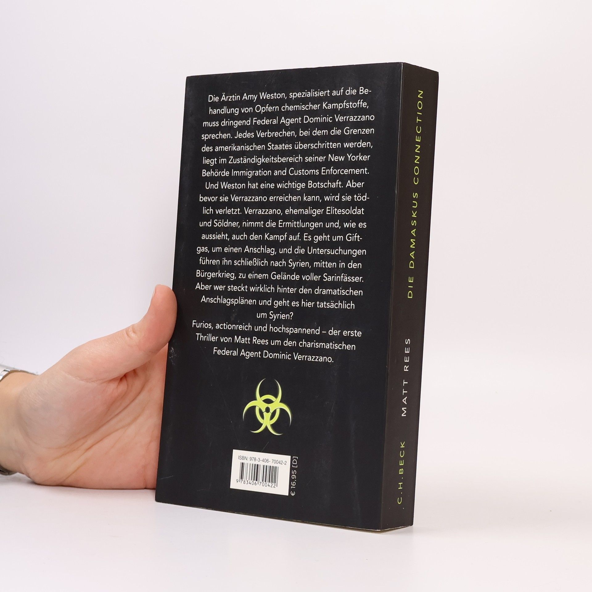 Die Ärztin Amy Weston, spezialisiert auf die Behandlung von Opfern chemischer Kampfstoffe, hat es eilig. Sie muss dringend Federal Agent Dominic Verrazzano sprechen, den man ihr empfohlen hat. Jedes Verbrechen, bei dem die Grenzen des amerikanischen Staates überschritten werden, liegt im Zuständigkeitsbereich seiner New Yorker Behörde Immigration and Customs Enforcement. Und Weston hat eine wichtige Botschaft. Aber bevor sie Verrazzano erreichen kann, wird sie tödlich verletzt, kann ihm nur noch einen kryptischen Zettel geben. Verrazzano, ehemaliger Elitesoldat und Söldner, nimmt die Ermittlungen und, wie es aussieht, auch den Kampf auf. Es geht um Giftgas, um einen Anschlag, und die Untersuchungen führen ihn und seine Kollegen schließlich nach Syrien, mitten in den Bürgerkrieg, zu einem Gelände voller Sarinfässer. Aber wer steckt wirklich hinter den dramatischen Anschlagsplänen und geht es hier tatsächlich um Syrien? Furios, voll komplexer Charaktere und überraschender Wendungen, actionreich und hochspannend – der erste Thriller von Matt Rees um den charismatischenFederal Agent Dominic Verrazzano.