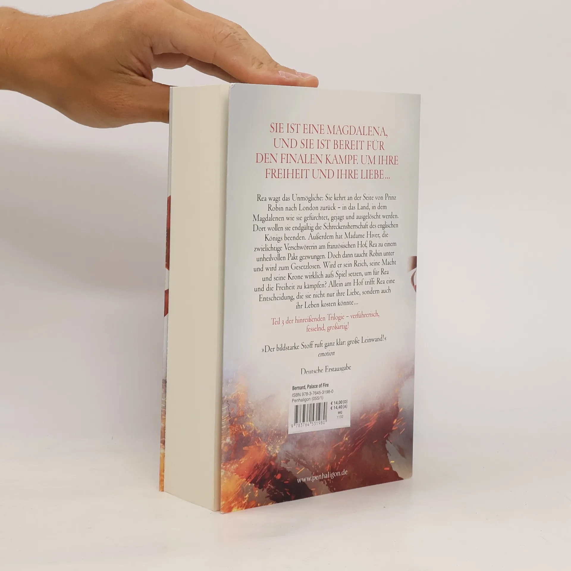 Sie ist eine Magdalena, und sie ist bereit für den finalen Kampf: um ihre Freiheit und ihre Liebe ... Rea wagt das Unmögliche: Sie kehrt an der Seite von Prinz Robin nach London zurück – in das Land, in dem Magdalenen wie sie gefürchtet, gejagt und ausgelöscht werden. Doch Rea hat Robins Antrag, seine Frau und damit Königin von England zu werden, abgelehnt: Eine Zukunft mit ihm ist für sie undenkbar, wenn sie ihre wahre Identität geheimhalten muss. Außerdem hat Madame Hiver, die zwielichtige Verschwörerin am französischen Hof, Rea zu einem unheilvollen Pakt gezwungen. Doch dann taucht Robin unter und wird zum Gesetzlosen. Wird er sein Reich, seine Macht und seine Krone aufs Spiel setzen, um für Rea und die Freiheit zu kämpfen? Alle Bücher der »Palace-Saga«: Palace of Glass. Die Wächterin Palace of Silk. Die Verräterin Palace of Fire. Die Kämpferin Palace of Blood. Die Königin Eine Kämpferin, die eine verbotene Gabe besitzt. Ein Prinz, dessen Leben auf dem Spiel steht. Ein gläserner Palast, in dem eine tödliche Intrige gesponnen wird. Diese hinreißende Tetralogie werden die Fans von Sarah J. Maas, Kiera Cass und Erin Watt lieben. Das Debüt einer hochbegabten deutschen Autorin.