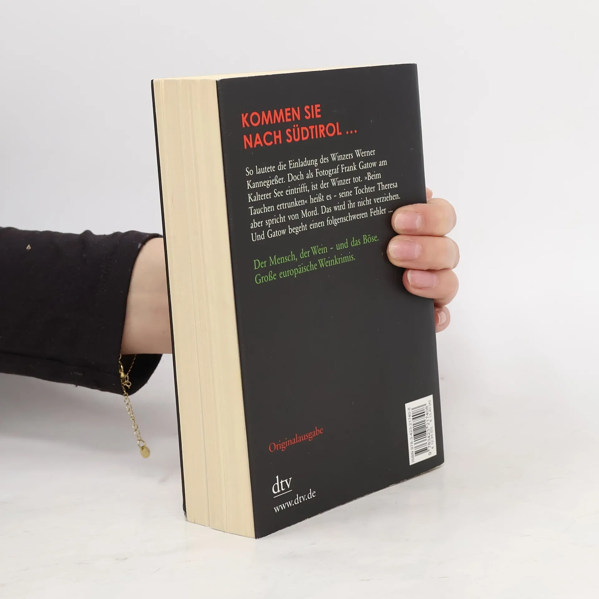 Der Mensch, der Wein – und das Böse »Kommen Sie zu uns nach Südtirol!« Mit diesen Worten lädt Winzer Werner Kannegießer den Fotografen Frank Gatow auf sein Weingut ein. Doch als der Hamburger in Südtirol eintrifft, um Weinberge und modernste Kellereien zu fotografieren, ist der Winzer tot. Er soll beim Tauchen in der Karibik ertrunken sein. »Angeblich«, wie seine Tochter Theresa meint. Sie bezweifelt die Version vom Herzschlag unter Wasser. Aber dafür fehlt ihr jeglicher Beweis. Und für einen Mord in der Karibik sind die Bozener Carabinieri nicht zuständig. Erst auf Theresas Drängen hin stellt Gatow halbherzig Ermittlungen an. Schon bald stolpert er über zahlreiche Ungereimtheiten, und auf einmal scheint ihm der Mordverdacht gar nicht mehr so abwegig. Doch dann begeht er einen folgenschweren Fehler …