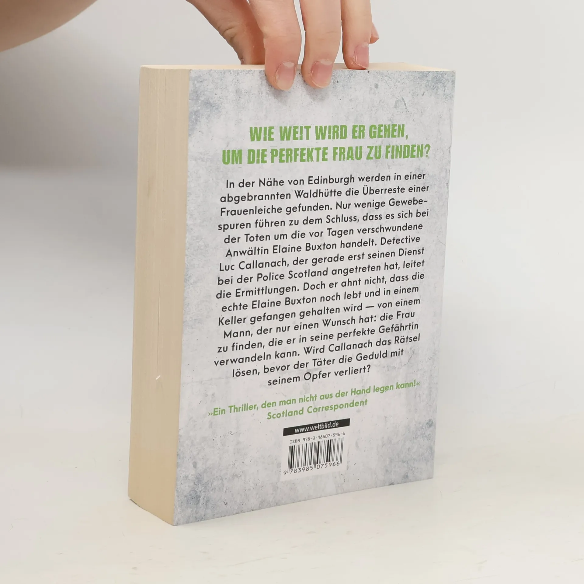 WIE WEIT WIRD ER GEHEN, UM DIE PERFEKTE FRAU ZU FINDEN? ... In der Nähe von Edinburgh werden in einer abgebrannten Waldhütte die Überreste einer Frauenleiche gefunden. Nur wenige Gewebespuren führen zu dem Schluss, dass es sich bei der Toten um die vor Tagen verschwundene Anwältin Elaine Buxton handelt. Detective Luc Callanach, der gerade erst seinen Dienst bei der Police Scotland angetreten hat, leitet die Ermittlungen. Doch er ahnt nicht, dass die echte Elaine Buxton noch lebt und in einem Keller gefangen gehalten wird — von einem Mann, der nur einen Wunsch hat: die Frau zu finden, die er in seine perfekte Gefährtin verwandeln kann. Wird Callanach das Rätsel lösen, bevor der Täter die Geduld mit seinem Opfer verliert? ... »Ein Thriller, den man nicht aus der Hand legen kann!« Scotland Correspondent