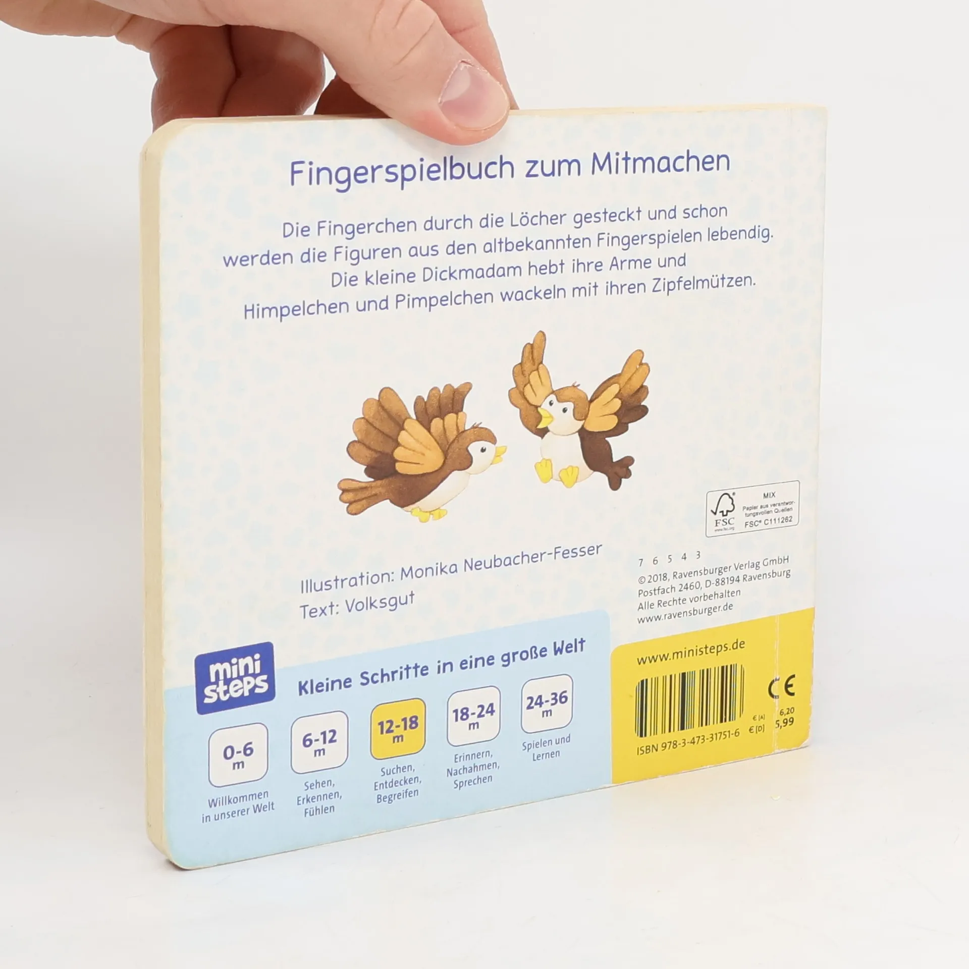Schon Kleinkinder lieben Fingerspiele! Mit diesem Buch wird es ganz leicht, die Zappelmänner und Tiere aus den bekannten Fingerspielen zum Leben zu erwecken: Einfach die Finger durch die Löcher stecken und schon fangen Zipfelmützen an zu zappeln, Schwänzchen an zu wackeln und Flügel an zu schlagen. Davon können die Kleinen gar nicht genug bekommen. Vertrauen schenken. Das Leben entdecken. Babys und Kleinkinder wollen mit allen Sinnen die Welt entdecken. ministeps begleitet die Kleinen auf ihren ersten Schritten ins Leben. Die vielfältigen ministeps Bücher, Spiele und Spielsachen bieten für jedes Kind die optimalen Sinnesanreize. Sie fördern das Erkennen von Farben, Formen und Bildern, sie laden zum (Be-) Greifen ein und ermutigen zum Krabbeln und Sprechen. Alle ministeps Produkte sind von höchster Ravensburger Qualität. Und das spüren nicht nur die Kleinen. Auch die Großen haben die Sicherheit, den Kindern immer ideale Anreize zu bieten.