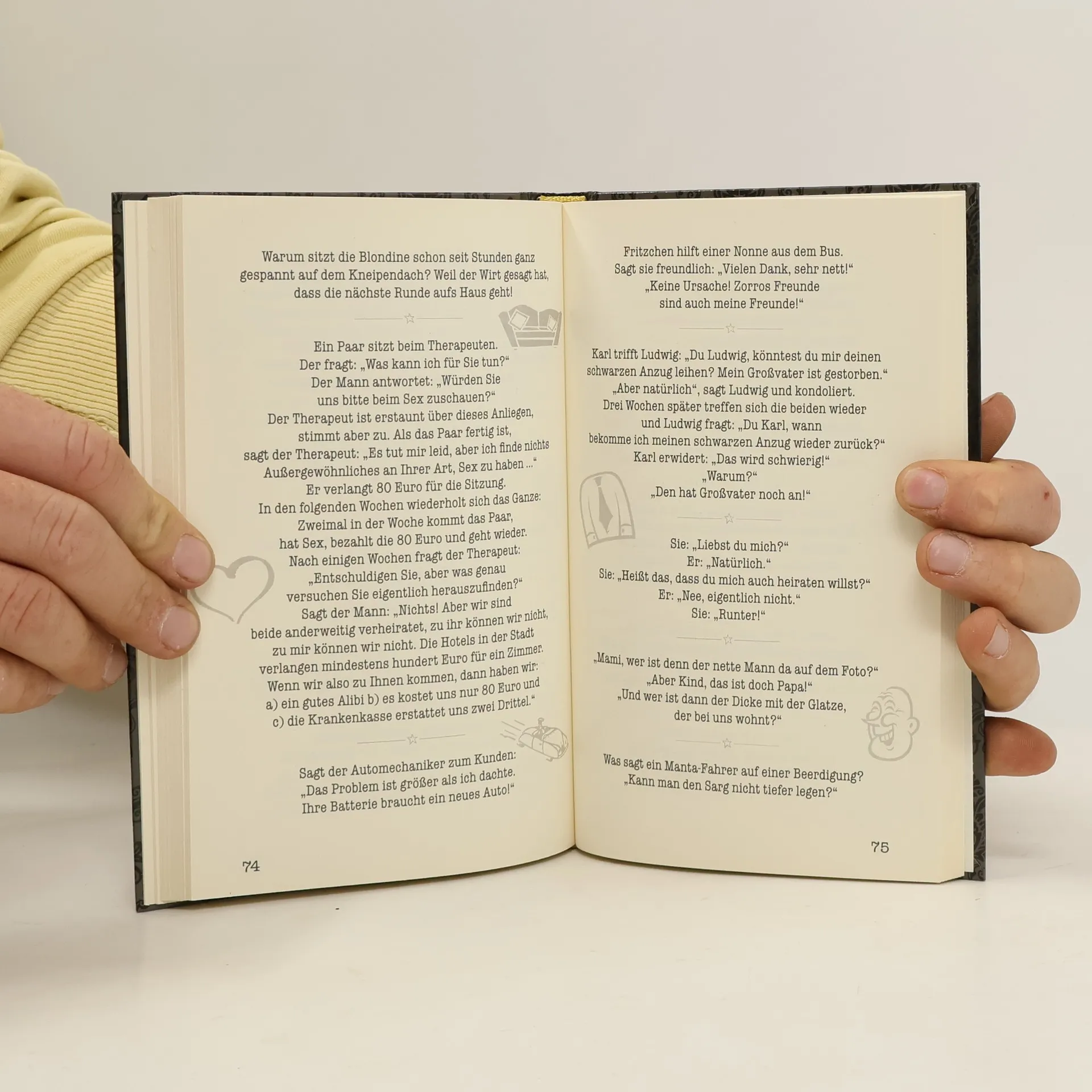 So schlecht, dass sie schon wieder gut sind Er: „Liebling, sag mir doch endlich die drei Worte, die uns für immer verbinden werden!“ Sie: „Ich bin schwanger!“ Richter: „Ich kenn´ Sie doch, Sie waren schon hundert Mal hier; Sie sind doch vorbestraft?“ Angeklagter: „Nein, Herr Richter, Sie irren sich; ich bin der Türsteher vom Eros-Center!“ Auf einem Waldweg treffen sich zwei Schnecken. „Um Himmels willen“, sagt die eine, „wo hast du denn dein blaues Auge her?“ - „Ich kann dir sagen! Ich war gestern auf dem Heimweg, da schoss plötzlich ein Pilz aus dem Boden.„ Laufen zwei Tiere durch den Wald, fragt das eine: “Was bist du eigentlich für ein Tier„? Dieses antwortet: “Ein Wolfshund„. Fragt das erste Tier: “Wie geht denn das?„ “Na ja, meine Mutter war ein Hund und mein Vater ein Wolf!„ Eine Weile ist Ruhe, dann fragt der Wolfshund: “Und was bist du für ein Tier?„ “Ein Ameisenbär" „Ach komm, hör auf mit dem Scheiß…“