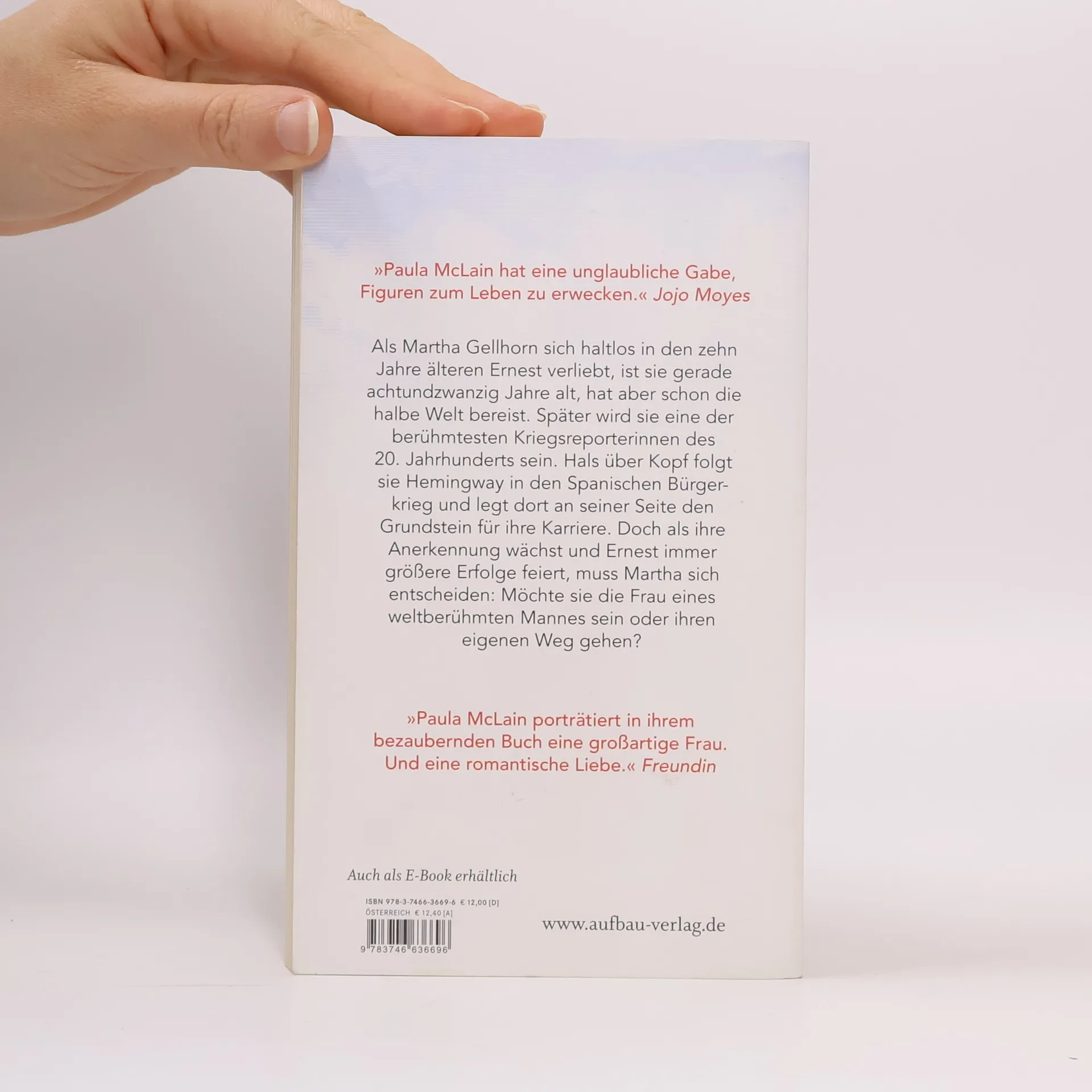 „Paula McLain hat eine unglaubliche Gabe, Figuren zum Leben zu erwecken.“ Jojo Moyes. Als Martha Gellhorn sich haltlos in den zehn Jahre älteren Ernest verliebt, ist sie gerade achtundzwanzig Jahre alt, hat aber schon die halbe Welt bereist. Später wird sie eine der berühmtesten Kriegsreporterinnen des 20. Jahrhunderts sein. Hals über Kopf folgt sie Hemingway in den Spanischen Bürgerkrieg und legt dort an seiner Seite den Grundstein für ihre Karriere. Doch als ihre Anerkennung wächst und Ernest immer größere Erfolge feiert, muss Martha sich entscheiden: Möchte sie die Frau eines weltberühmten Mannes sein oder ihren eigenen Weg gehen? Eine große Liebe vor der bedrohlichen Kulisse des Zweiten Weltkriegs. Ein faszinierendes Panorama, mitreißend und einfühlsam erzählt. „Paula McLain porträtiert in ihrem bezaubernden Buch eine großartige Frau. Und eine romantische Liebe.“ Freundin