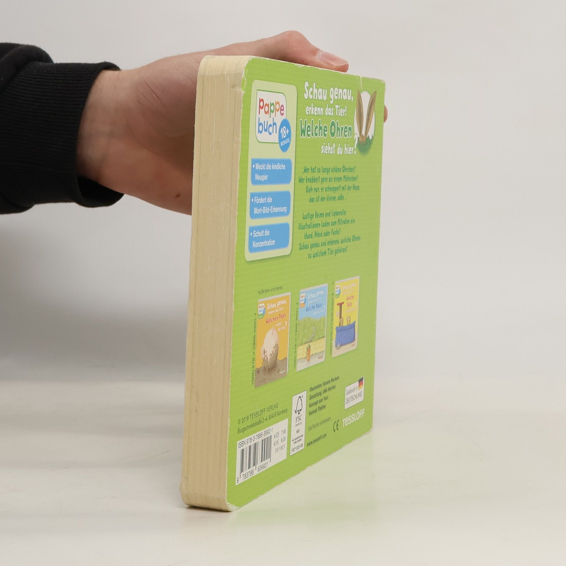 Lustige, kindgerechte Reime und liebevolle Illustrationen laden Kinder ab 18 Monaten zum Mitraten ein. Hund, Pferd oder Elefant? Schau genau und erkenne welche Ohren zu welchem Tier gehören! Die Welt mit allen Sinnen zu erleben, dazu lädt die Reihe „Pappebuch von Tessloff“ ein. Sie erscheint seit Januar 2017, steht für robuste Bücher aus heimischer Produktion, die hohen qualitativen Ansprüchen genügen und spielerisch die Entwicklung der Kinder unterstützen. Wer alle Ohren richtig zugeordnet hat kann sich an Nasen, Popos und Füßen versuchen.
