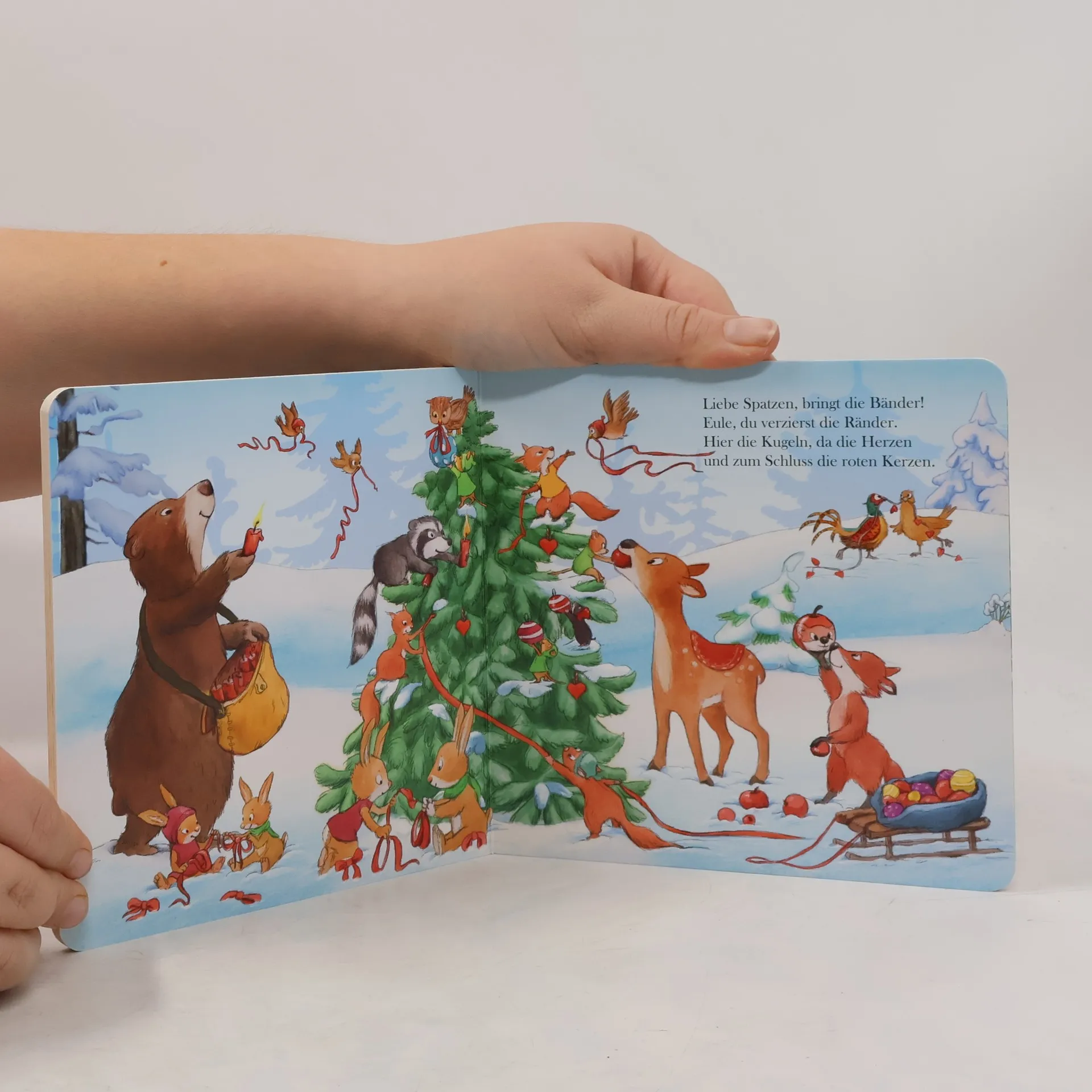 Alle Jahre wieder treffen sich die Waldtiere, um gemeinsam den schönsten Baum im Wald weihnachtlich zu schmücken. Dazu gibt es Zimtpunsch und Plätzchen. Das lockt sogar den Weihnachtsmann an. Hat er wohl etwas mitgebracht? Eine erste gereimte Weihnachtsgeschichte für die Kleinsten.
