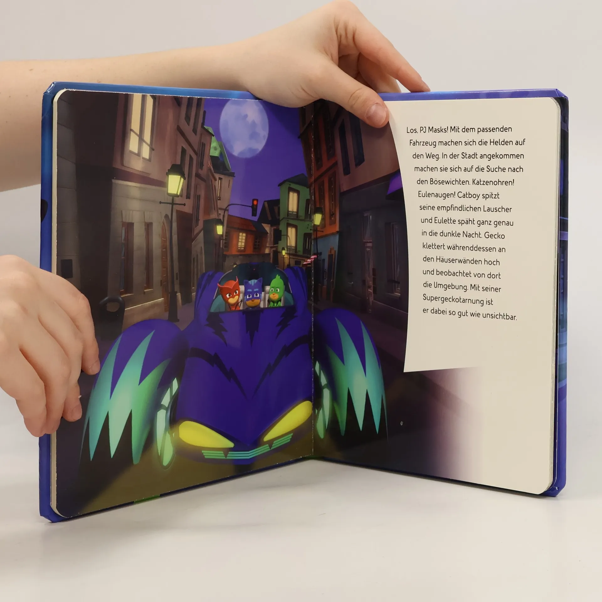 Lerne die drei Helden der PJ Masks kennen! Ein spannendes Vorlesebuch mit den beliebten Figuren Catboy, Eulette und Gecko Ein tolles Geschenk für alle Fans der Serie Pappbilderbuch mit wattiertem Einband und Fensterstanzung Entdecke die spannende Welt der PJ Masks und begleite sie auf ihren Abenteuern durch die Nacht. Die drei Freunde Connor, Amaya und Greg verwandeln sich bei Sonnenuntergang in die Helden Catboy, Eulette und Gecko. In ihrem Hauptquartier spüren sie mit Stadtplänen und Live-Kameras die Bösewichte auf. Schnell wählen sie ein Fahrzeug aus und eilen zum Ort des Vergehens. Jetzt müssen sie ihre Kräfte einsetzen: Katzenohren, Eulenaugen, Supergeckotarnung! Nur gemeinsam können sie die Bösewichte besiegen. Wird es ihnen gelingen gegen Romeo, Nacht-Ninja und Luna Girl zu bestehen? Finde es heraus! Die kurzen, spannenden Texte eignen sich perfekt zum Vorlesen für Kinder ab 4 Jahren.