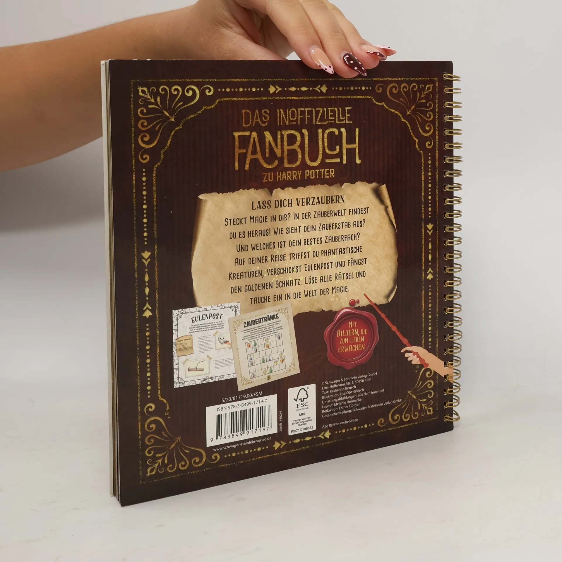 Tritt ein – eine magische Welt erwartet dich! Rätseln, Basteln, Malen und Quizzen rund um die Zauberwelt 80 bunt illustrierte Seiten für kleine und große Fans Mit Lösungen zu allen Rätseln Beginne deine Reise und entdecke die magischen Kräfte tief in dir! Zauberei ist gar nicht so schwierig. Mit deinem eigenen Zauberstab und ein wenig Übung gelingen dir phantastische Wunder! In diesem Buch betrittst du eine magische Welt, triffst sagenhafte Wesen und lernst alles, was begabte Zauberschüler und Hexen brauchen. Bastle mit einfachen Mitteln deinen eigenen Zauberstab, versende wichtige Eulenpost und baue einen Koffer für deine magischen Kreaturen. Auf 80 bunten Seiten warten knifflige Rätsel, lustige Aufgaben sowie unterschiedlichste Bastelanleitungen und Rezepte auf dich und deine Zauberkräfte. Deiner Phantasie sind keine Grenzen gesetzt. Wie sieht dein eigener aufgemotzter Besen aus? Was erkennst du im Nebel der Kristallkugel? Kannst du alle versteckten Fabelwesen finden? Und wie kommst du unbeschadet durch den Verbotenen Wald? Bündele deine Magie und meistere alle Herausforderungen auf deiner Reise durch die Zauberwelt.