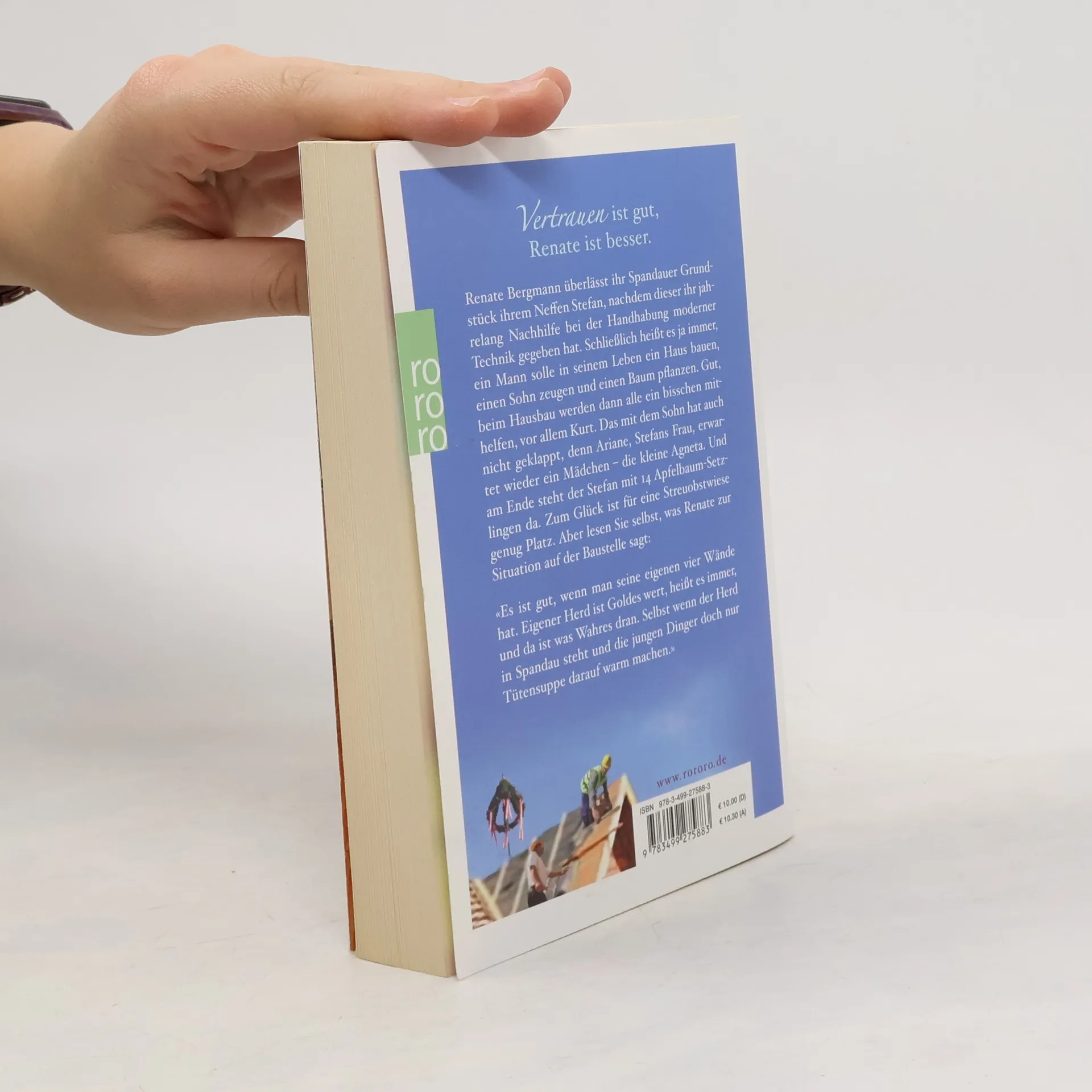 Vertrauen ist gut, Renate ist besser Renate Bergmann überlässt ihr Spandauer Grundstück Neffen Stefan, nachdem dieser ihr jahrelang Nachhilfe bei der Handhabung moderner Technik gegeben hat. Schließlich heißt es ja immer, ein Mann solle in seinem Leben ein Haus bauen, einen Sohn zeugen und einen Baum pflanzen. Gut, beim Hausbau werden dann alle ein bisschen mithelfen, vor allem Kurt. Das mit dem Sohn hat auch nicht geklappt, denn Ariane, Stefans Frau, erwartet wieder ein Mädchen - die kleine Agneta. Und am Ende steht der Stefan mit 14 Apfelbaum-Setzlingen da. Zum Glück ist für eine Streuobstwiese genug Platz. Aber lesen Sie selbst, was Renate zur Situation auf der Baustelle sagt: «Es ist gut, wenn man seine eigenen vier Wände hat. Eigener Herd ist Goldes wert , heißt es immer, und da ist was Wahres dran. Selbst, wenn der Herd in Spandau steht und die jungen Dinger doch nur Tütensuppe darauf warmmachen.»