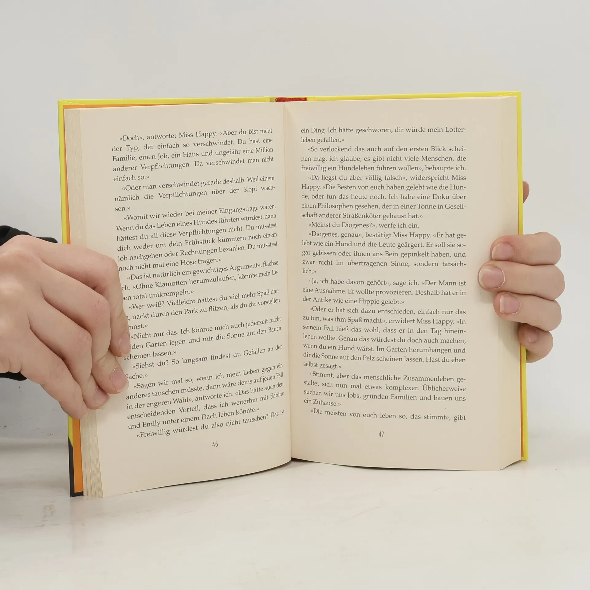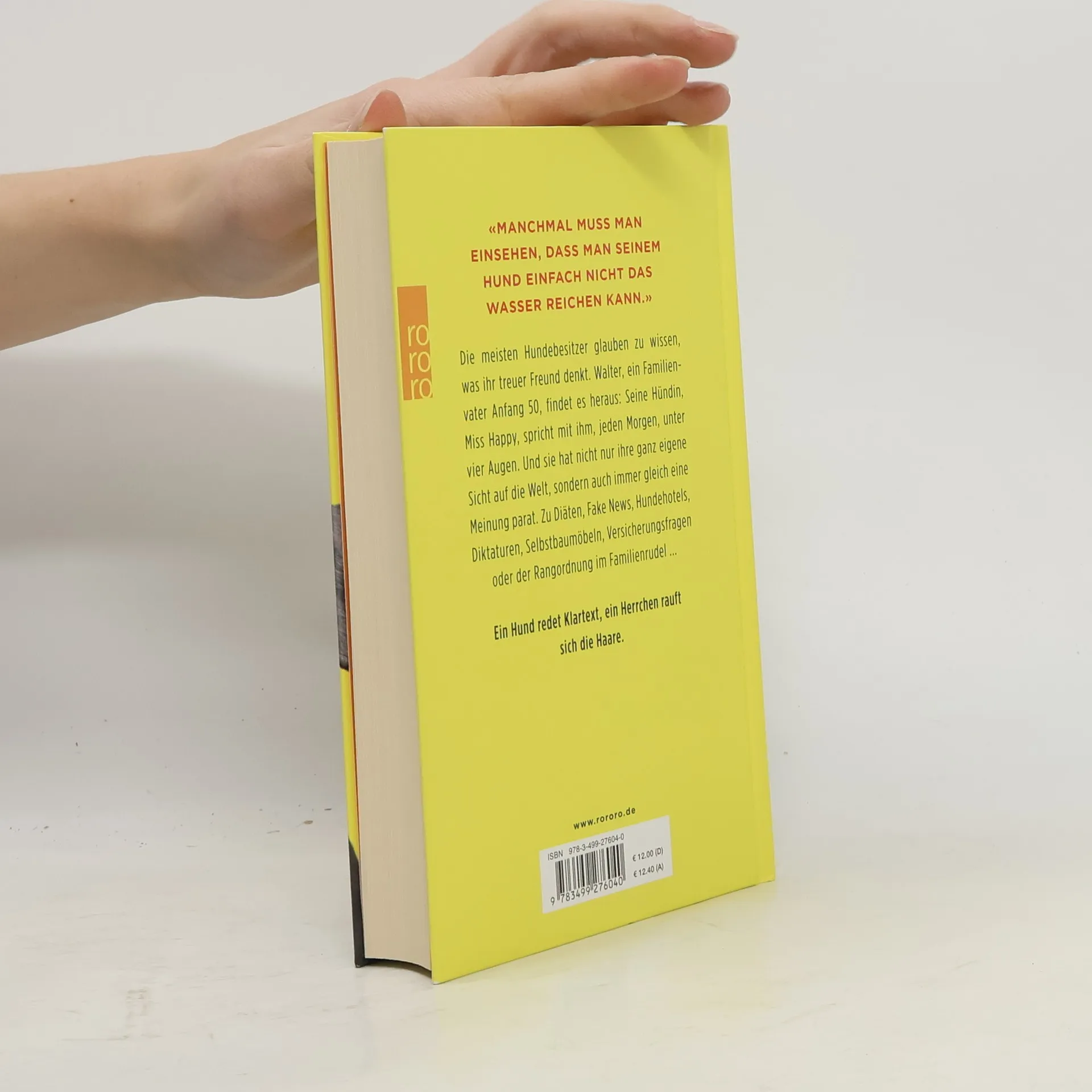 Ein Hund redet Klartext, ein Herrchen rauft sich die Haare. Die meisten Hundebesitzer glauben zu wissen, was ihr treuer Freund denkt. Walter, ein Familienvater Anfang 50, findet es heraus: Seine Hündin, Miss Happy, spricht mit ihm, jeden Morgen, unter vier Augen. Und sie hat nicht nur ihre ganz eigene Sicht auf die Welt, sondern auch immer gleich eine Meinung parat. Zu Diäten, Fake News, Hundehotels, Diktaturen, Selbstbaumöbeln, Versicherungsfragen oder der Rangordnung im Familienrudel …