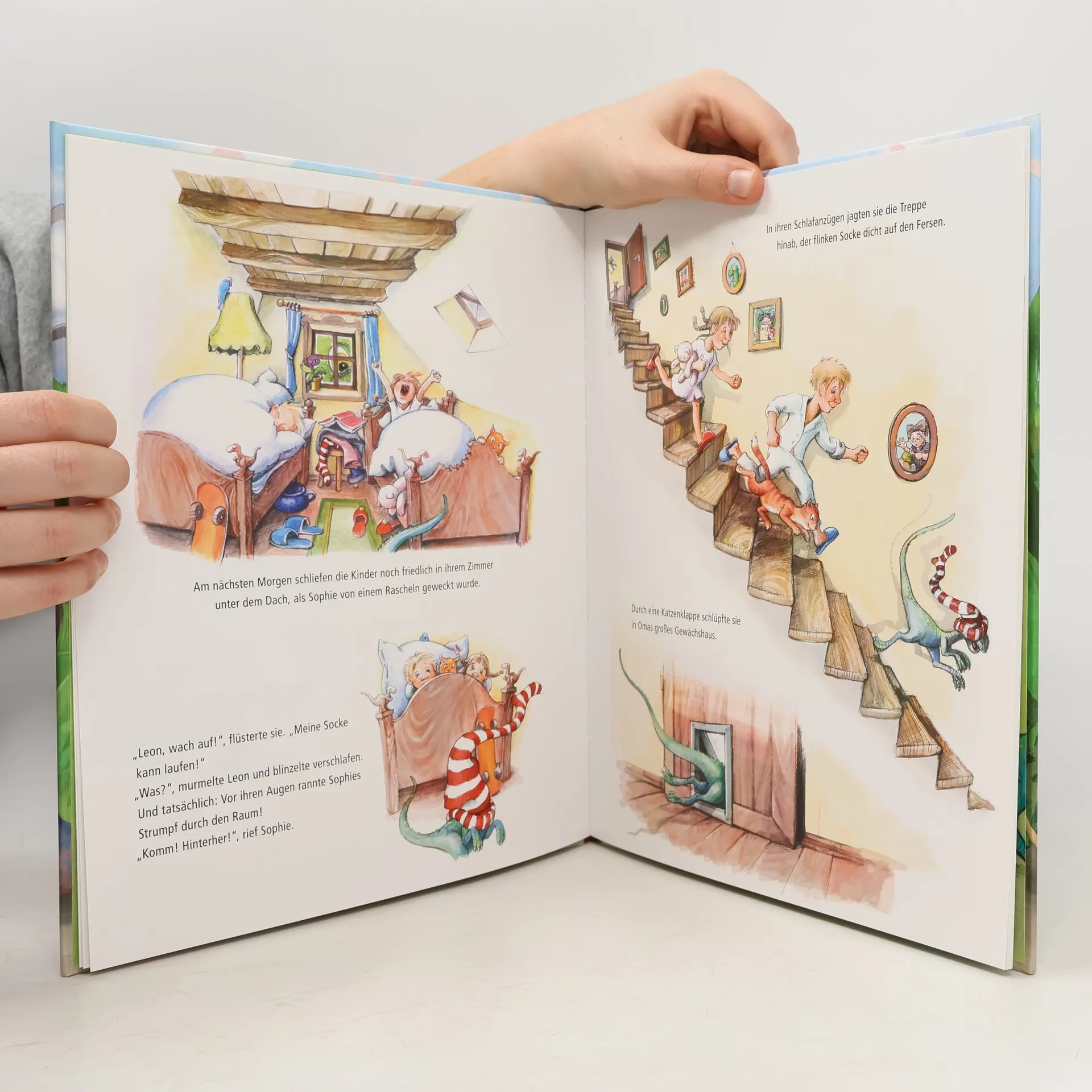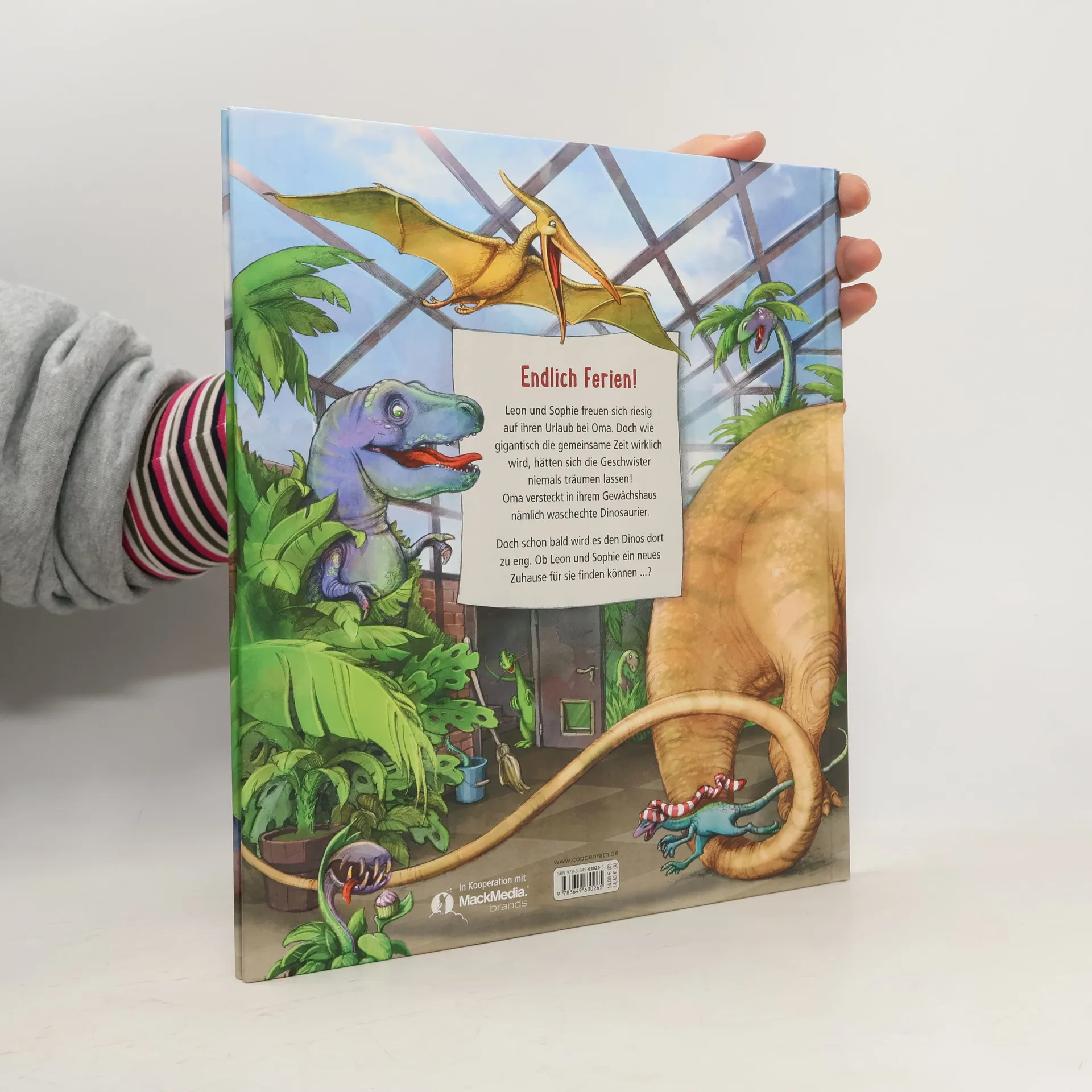 Leon und Sophie freuen sich riesig auf die Ferien bei ihrer Oma. Doch wie GIGANTISCH die gemeinsame Zeit wirklich wird, hätten sich die Geschwister niemals träumen lassen: Oma versteckt in ihrem Gewächshaus nämlich waschechte Dinosaurier. Die Dinos sind Omas beste Freunde und super Spielkameraden – auch wenn man mit einem riesigen Stegosaurus nur schwer verstecken spielen kann. Für Leon und Sophie ist bald klar: Die Dinos haben nicht genug Platz. Doch wo sollen sie nur hin? Das Buch entstand in Kooperation mit dem Europa-Park Rust: https://www. europapark. de/de/attraktionen/madame-freudenreich-curiosites
