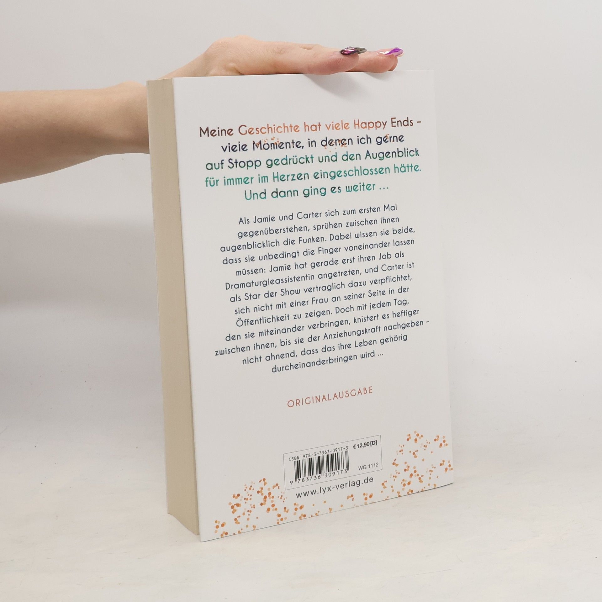 Meine Geschichte hat viele Happy Ends - viele Momente, in denen ich gerne auf Stopp gedrückt und den Augenblick für immer im Herzen eingeschlossen hätte. Und dann ging es weiter ... Als Jamie und Carter sich zum ersten Mal gegenüberstehen, sprühen zwischen ihnen augenblicklich die Funken. Dabei wissen sie beide, dass sie unbedingt die Finger voneinander lassen müssen: Jamie hat gerade erst ihren Job als Dramaturgieassistentin angetreten, und Carter ist als Star der Show vertraglich dazu verpflichtet, sich nicht mit einer Frau an seiner Seite in der Öffentlichkeit zu zeigen. Doch mit jedem Tag, den sie miteinander verbringen, knistert es heftiger zwischen ihnen, bis sie der Anziehungskraft nachgeben - nicht ahnend, dass das ihre Leben gehörig durcheinanderbringen wird ...