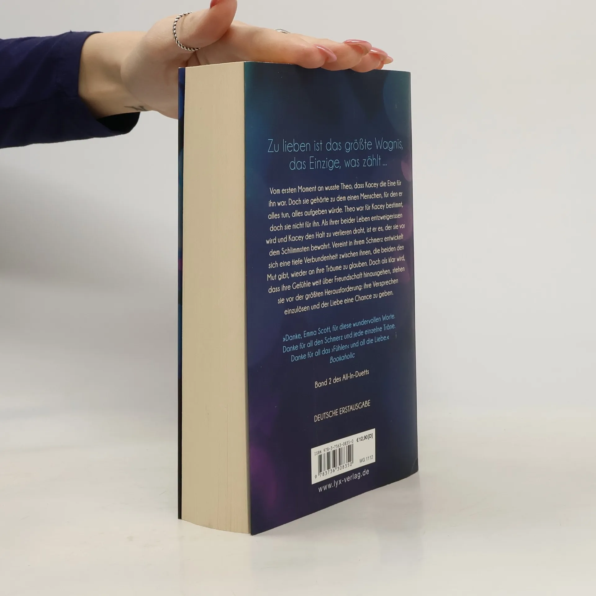 Zu lieben ist das größte Wagnis, das Einzige, was zählt ... Vom ersten Moment an wusste Theo, dass Kacey die Eine für ihn war. Doch sie gehörte zu dem einen Menschen, für den er alles tun, alles aufgeben würde. Theo war für Kacey bestimmt, doch sie nicht für ihn. Als ihrer beider Leben entzweigerissen wird und Kacey den Halt zu verlieren droht, ist er es, der sie vor dem Schlimmsten bewahrt. Vereint in ihrem Schmerz entwickelt sich eine tiefe Verbundenheit zwischen ihnen, die beiden den Mut gibt, wieder an ihre Träume zu glauben. Doch als klar wird, dass ihre Gefühle weit über Freundschaft hinausgehen, stehen sie vor der größten Herausforderung: ihre Versprechen einzulösen und der Liebe eine Chance zu geben. „Danke Emma Scott für diese wundervollen Worte. Danke für all den Schmerz und jede einzelne Träne. Danke für all das “Fühlen„ und all die Liebe.“ Bookaholic Band 2 des All-In-Duetts