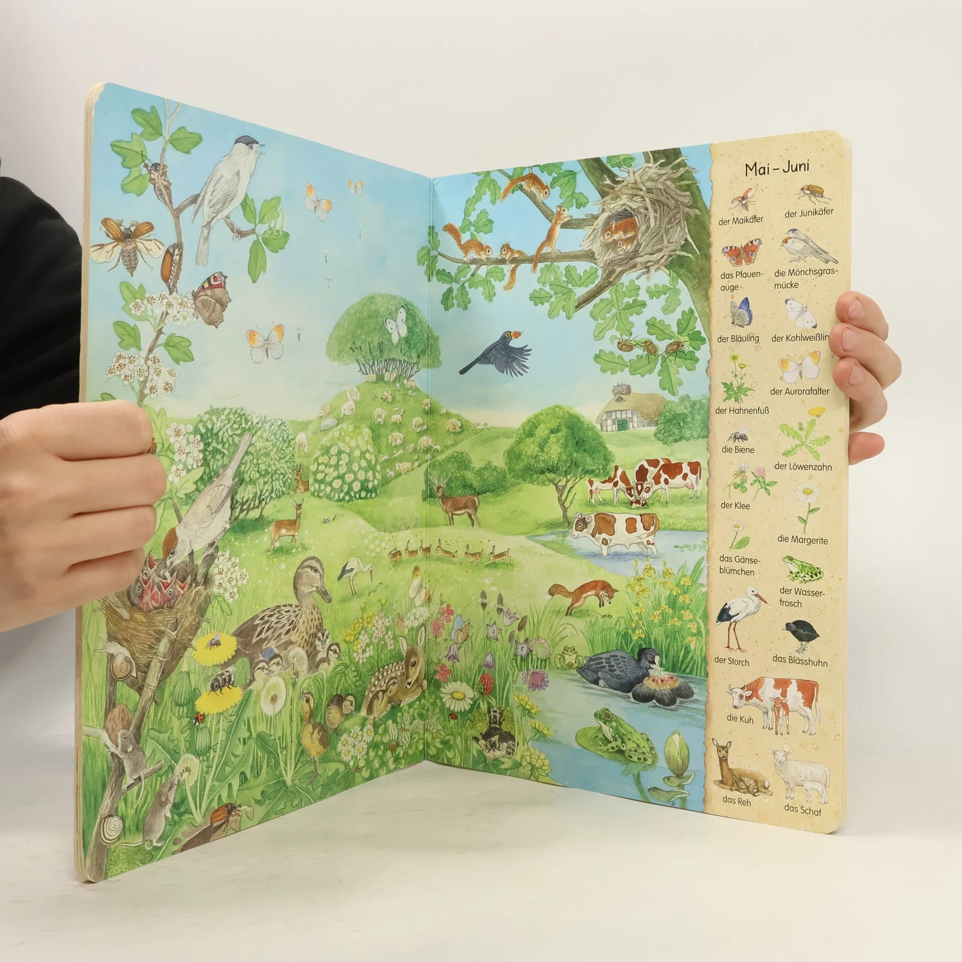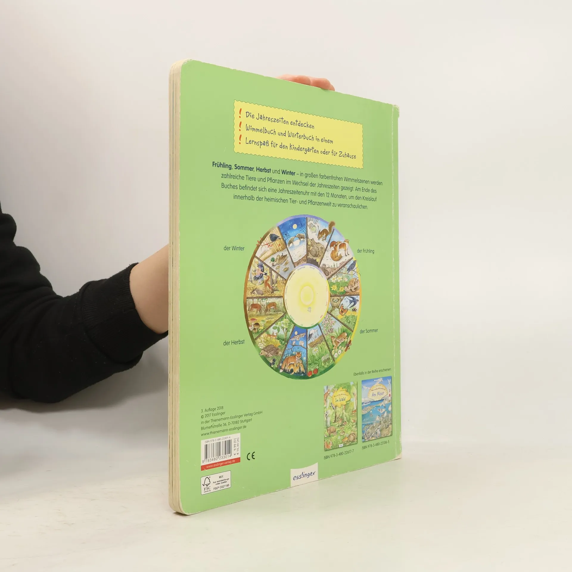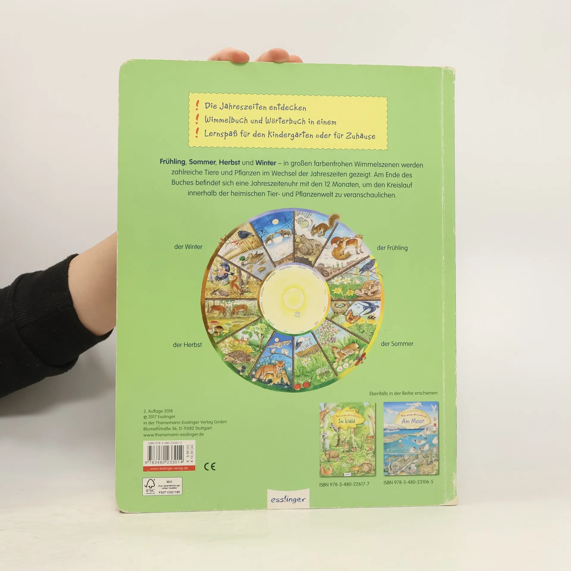 Frühling, Sommer, Herbst und Winter – jede Jahreszeit ist anders und Kinder lieben es, die Natur neu zu entdecken. In großen farbenfrohen Wimmelszenen werden zahlreiche Tiere und Pflanzen im Wechsel der Jahreszeiten gezeigt. Am Ende des Buches befindet sich eine Jahreszeitenuhr mit den 12 Monaten, um den Kreislauf innerhalb der heimischen Tier- und Pflanzenwelt zu veranschaulichen.