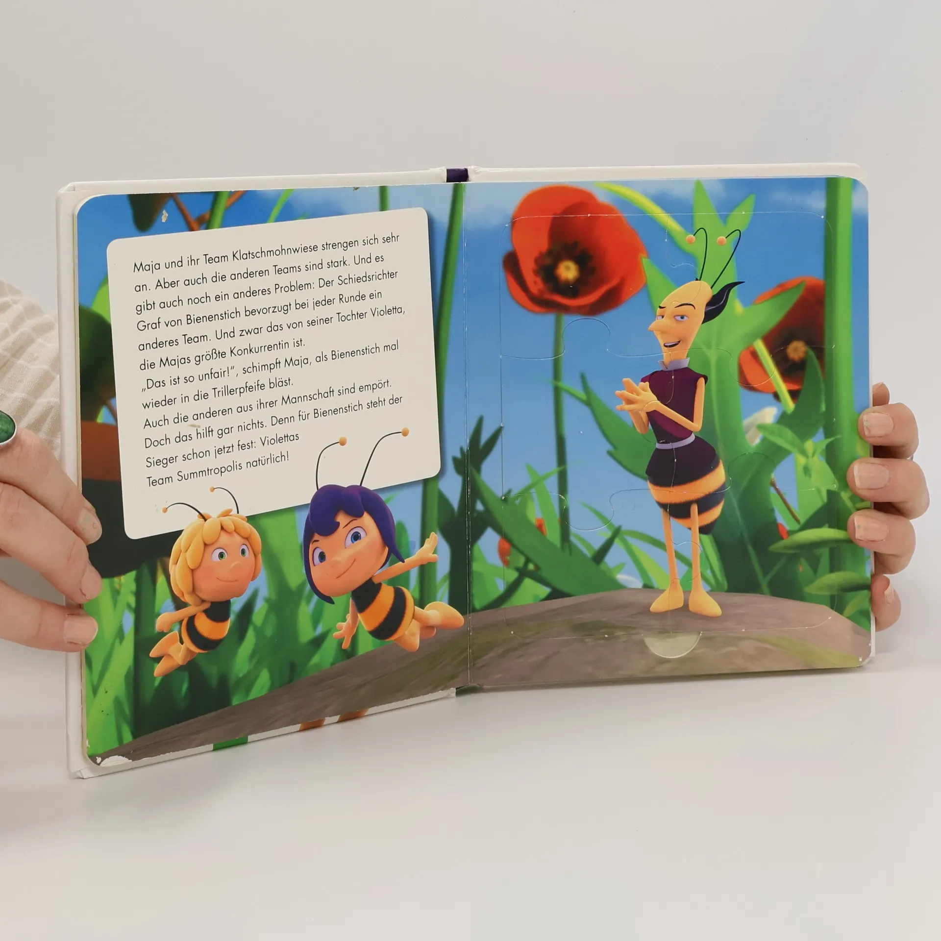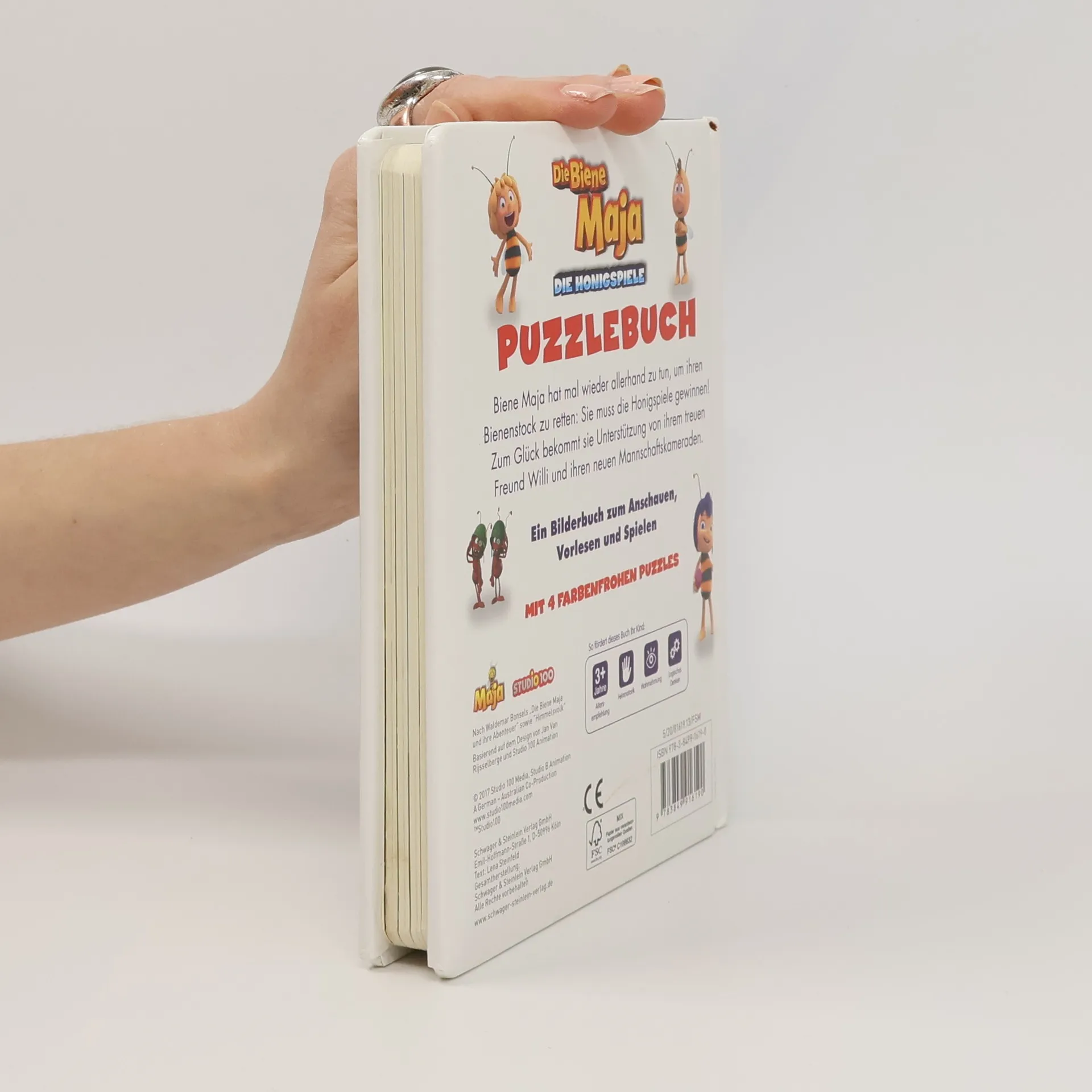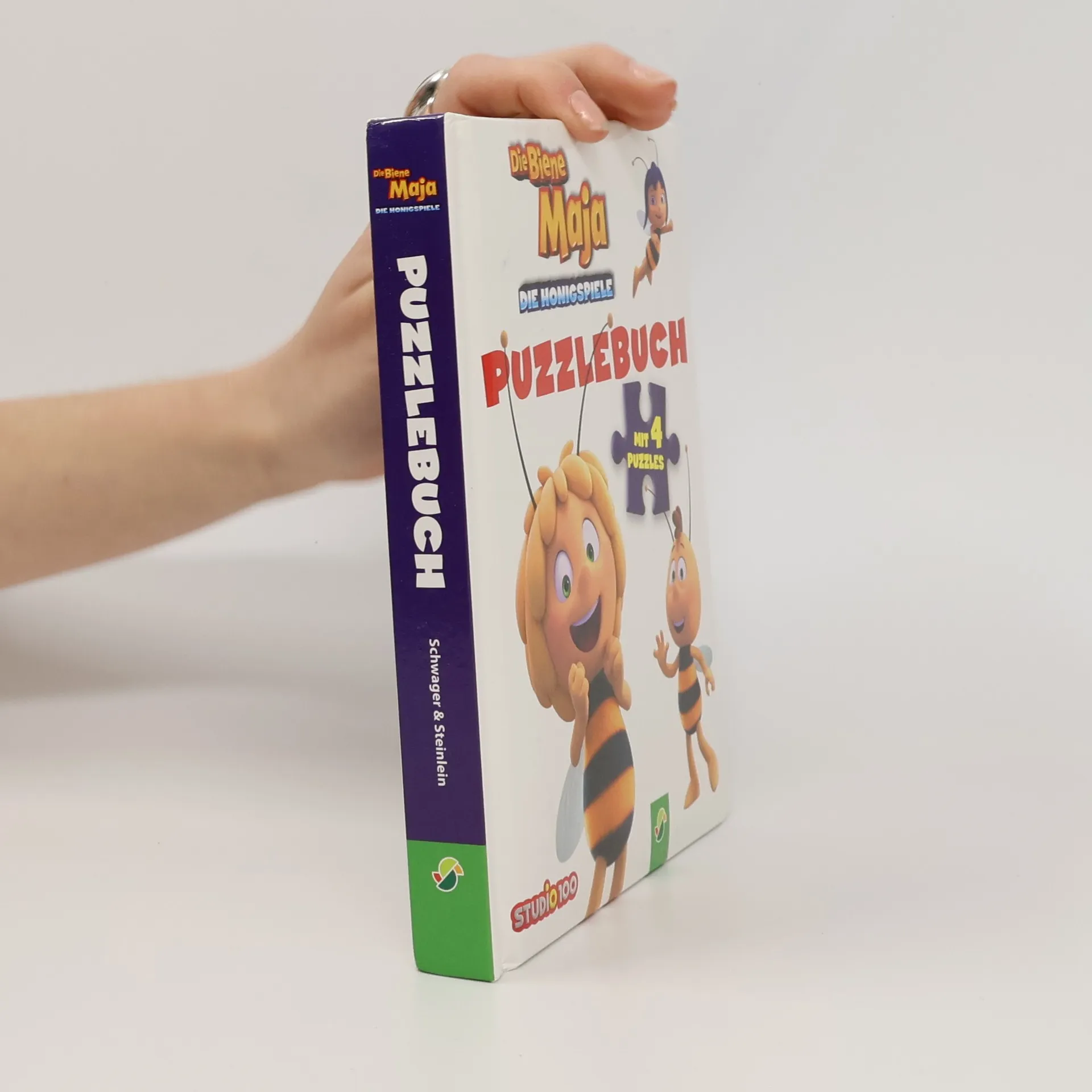 Das Puzzlebuch zum neuen Biene Maja Kinoabenteuer • Ein neues Abenteuer mit der schlauen Biene Maja, ihrem besten Freund Willi und allen anderen lustigen Krabblern • Mit den Bildern und den Figuren aus dem Kinofilm „Die Biene Maja - Die Honigspiele“ • Fördert die Feinmotorik, Wahrnehmung und das logischen Denken Die schlaue Biene Maja hat mal wieder allerhand zu tun, um ihren Bienenstock zu retten: Sie muss die Honigspiele gewinnen, damit die Bewohner der Klatschmohnwiese ihren Honig behalten dürfen! Zum Glück bekommt sie Unterstützung von ihrem treuen Freund Willi und ihren neuen Mannschaftskameraden. In diesem Puzzlebuch werden die Figuren aus dem Film „Die Biene Maja - Die Honigspiele“ vorgestellt: Maja, Willi, Violetta und alle ihre Freunde sind mit dabei. Fünf liebevoll gestaltete Doppelseiten mit den Original-Bildern laden zur spielerischen Beschäftigung mit den beliebten Filmhelden ein. Das Puzzeln schult die Geschicklichkeit und die Kombinationsgabe. Jedes der vier Puzzles hat 6 stabile Teile und eine praktische Griffhilfe, um die Puzzleteile einfach zu entnehmen. Zusätzlich gibt es unter jedem Puzzle eine Frage, die zum weiteren Erzählen anregt und die Konzentration und Aufmerksamkeit fördert. Ein Bilderbuch zum Anschauen, Spielen, Vor- und Mitlesen für Kinder ab 3 Jahren.