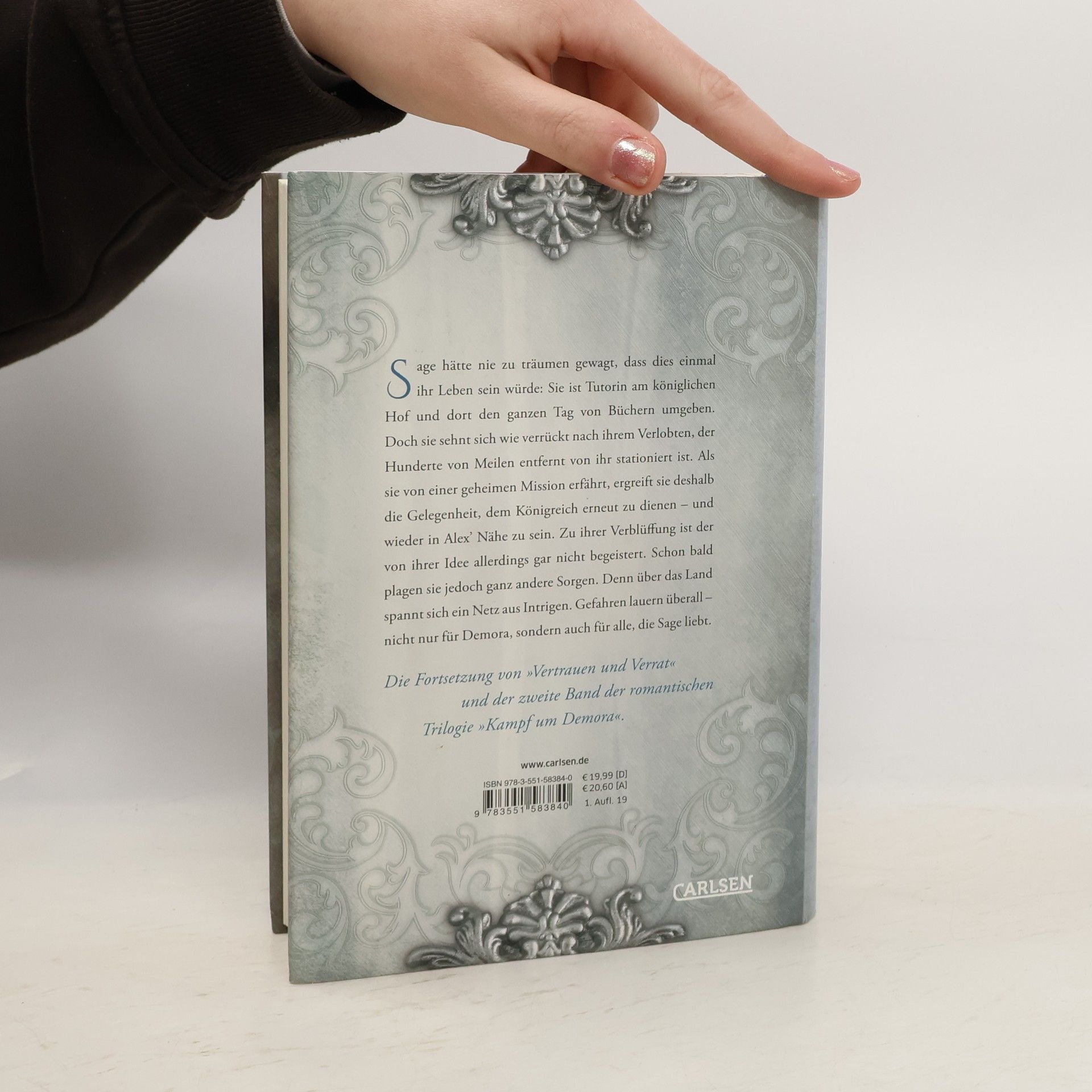 Sage hätte nie zu träumen gewagt, dass dies einmal ihr Leben sein würde: Sie ist Tutorin am königlichen Hof und dort den ganzen Tag von Büchern umgeben. Doch sie sehnt sich wie verrückt nach ihrem Verlobten, der Hunderte von Meilen entfernt stationiert ist. Als sie beauftragt wird, seinen Soldaten das Lesen und Schreiben beizubringen, ergreift sie die Chance, wieder in Alex’ Nähe zu sein. Aber über das Land spannt sich ein Netz aus Intrigen. Gefahren lauern überall – nicht nur für Demora, sondern auch für alle, die Sage liebt. Dies ist der zweite Band der romantischen Serie »Kampf um Demora«. Alle Bände der Serie mit Suchtgefahr: Vertrauen und Verrat (Band 1) Liebe und Lügen (Band 2) Gefühl und Gefahr (Band 3)