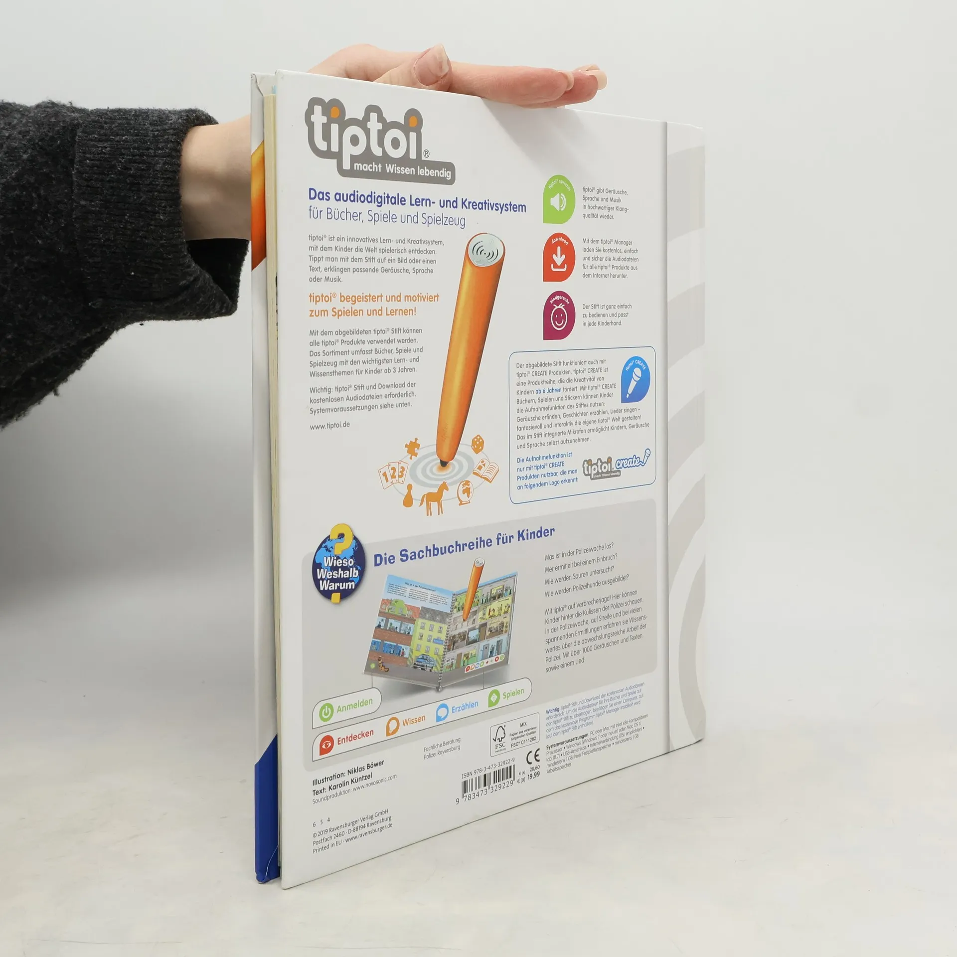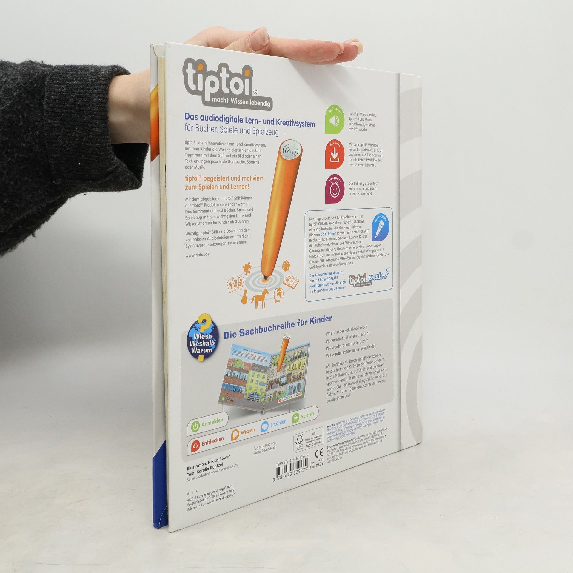 Wissenswertes und Spannendes über die Polizei! Sirenen heulen, Streifenwagen brausen zum Einsatz, spannende Ermittlungen werden geführt und die wichtigsten Kinderfragen beantwortet. Mit diesem Buch können Kinder selbstständig hinter die Kulissen des spannenden Berufs schauen. Los geht es in der Polizeiwache. Danach folgen spannende Einsätze von Spurensicherung und SEK. Auch die Kriminal- und Verkehrspolizei wird begleitet. Tolle Bilder und spannende Geräusche machen den Titel zu einem Muss für jeden kleinen Nachwuchspolizisten. Was macht der Traktor auf dem Feld? Wann kommt die Feuerwehr? Wie groß wird ein Pony? Die interaktive Sachbuchreihe tiptoi Wieso? Weshalb? Warum? beantwortet wichtige Kinderfragen auf Augenhöhe. Auf den liebevoll illustrierten Seiten tauchen die Kinder in eine Welt ein, die durch zahlreiche authentische Geräusche lebendig wird. Das Sachwissen wird altersgerecht erklärt und ist fachlich geprüft. Die Kinder können sich dank der einfachen und intuitiven Nutzung mit dem tiptoi-Stift das Wissen selbst erschließen. Sie lernen, Zusammenhänge zu begreifen und erfahren spannende Informationen über ihren Alltag und ihre Umwelt. Tolle Geschichten, Lieder und unterhaltsame Spiele laden dabei immer wieder zum selbstständigen Entdecken und Erforschen ein. tiptoi-Stift nicht enthalten. Muss separat erworben werden.
