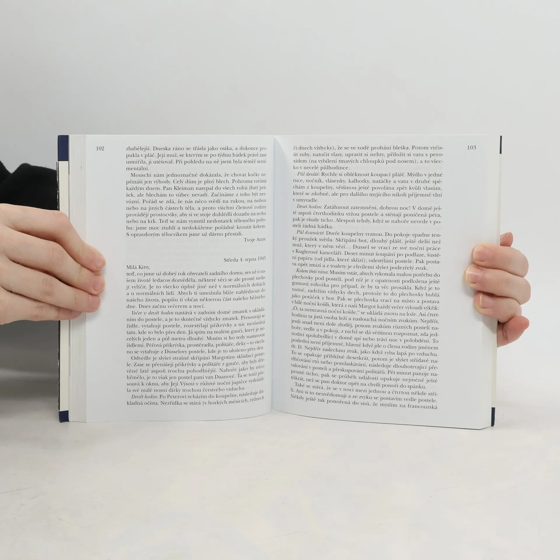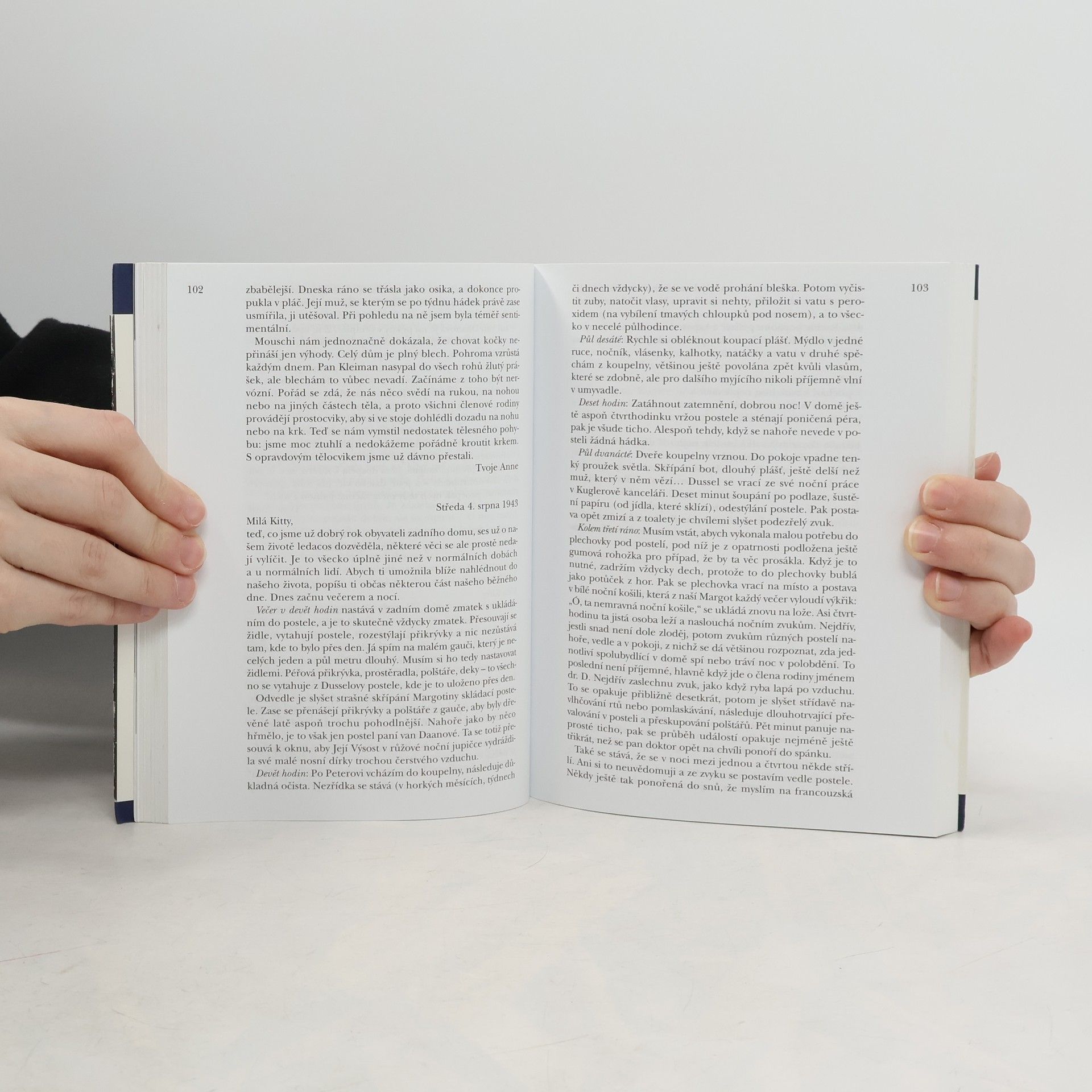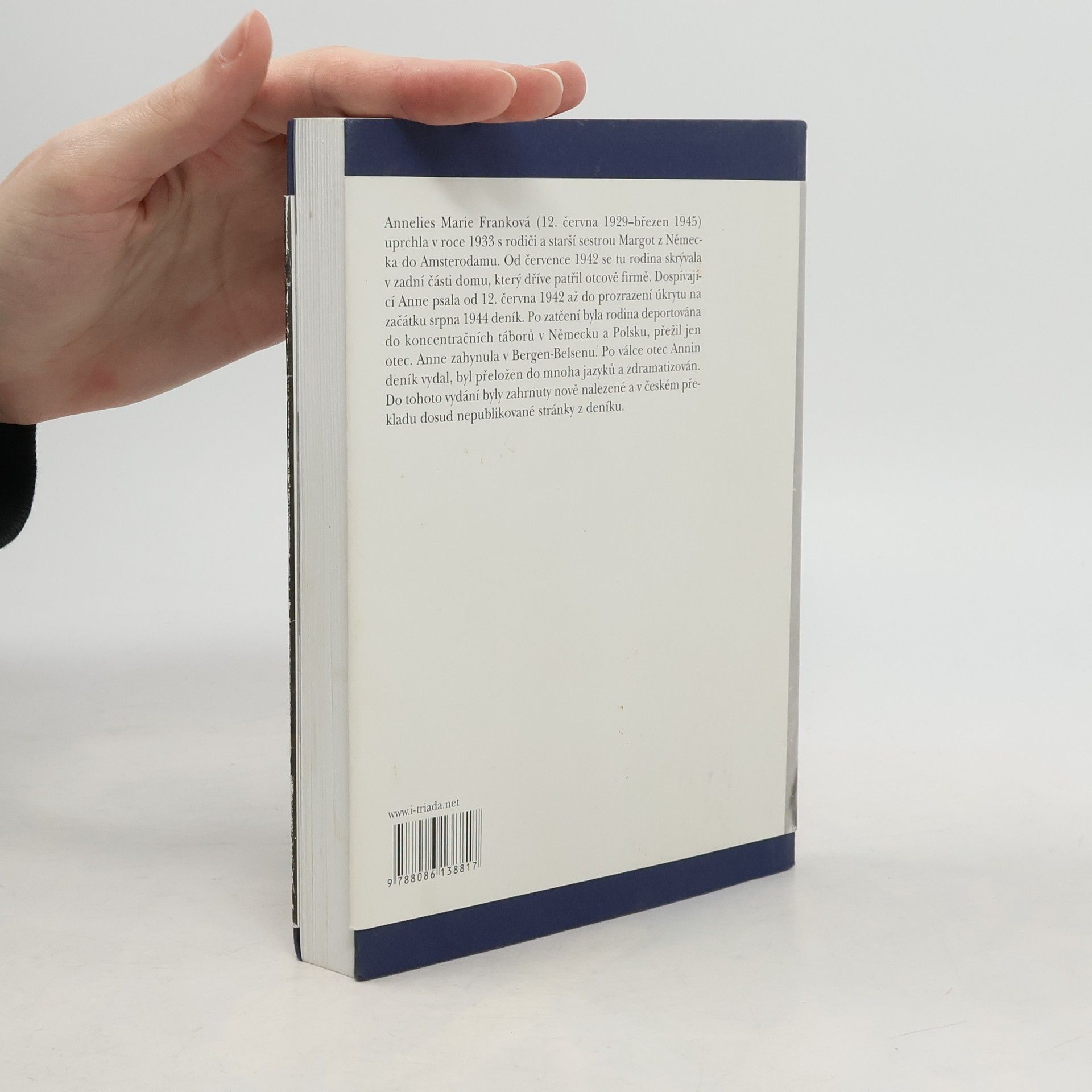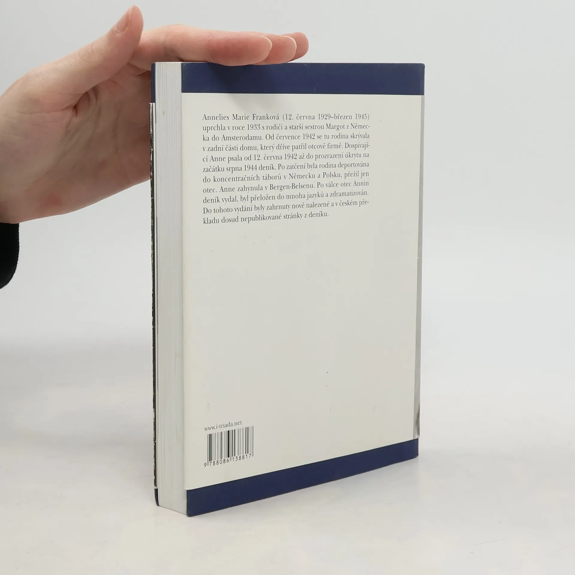 Dospívající Anne psala od 12. června 1942 do 4. srpna 1944 deník. Po prozrazení skrýše byla rodina odvezena do koncentračních táborů v Německu, přežil jen otec. Anne zahynula v Bergen-Belsenu. Po válce otec deník vydal, byl přeložen do mnoha jazyků a zdramatizován. Toto české vydání obsahuje poprvé nově nalezené a dosud nepublikované stránky.
