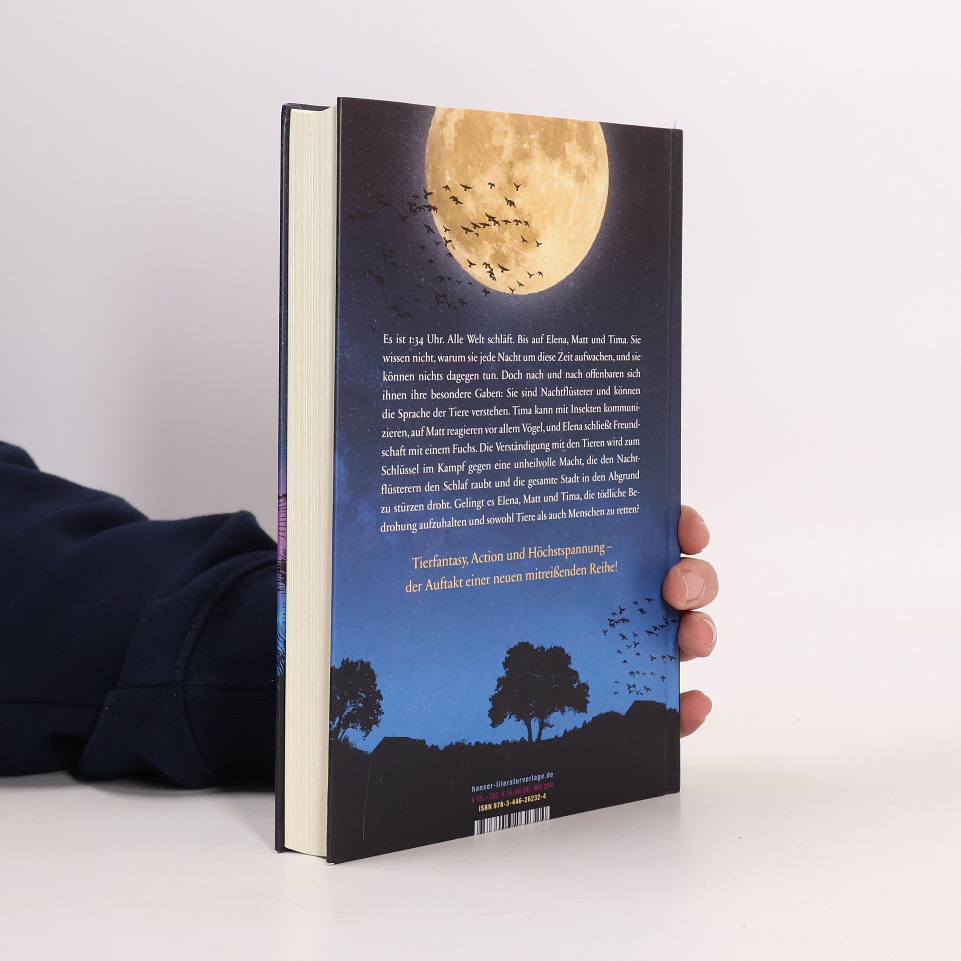 Tier-Fantasy, Action und Höchstspannung – der Auftakt einer neuen mitreißenden Reihe! Es ist 1:34 Uhr in der Nacht. Alle Welt schläft. Bis auf Elena, Matt und Tima. Sie wissen nicht, warum sie jede Nacht um diese Zeit aufwachen, und sie können nichts dagegen tun. Doch nach und nach offenbaren sich ihnen besondere Gaben: Sie sind Nachtflüsterer und können die Sprache der Tiere verstehen. Tima kann mit Insekten kommunizieren, auf Matt reagieren vor allem Vögel, und Elena schließt Freundschaft mit einem Fuchs. Die Verständigung mit den Tieren wird zum Schlüssel im Kampf gegen eine unheilvolle Macht, die die gesamte Stadt in den Abgrund zu stürzen droht. Gelingt es Elena, Matt und Tima, die tödliche Bedrohung aufzuhalten?