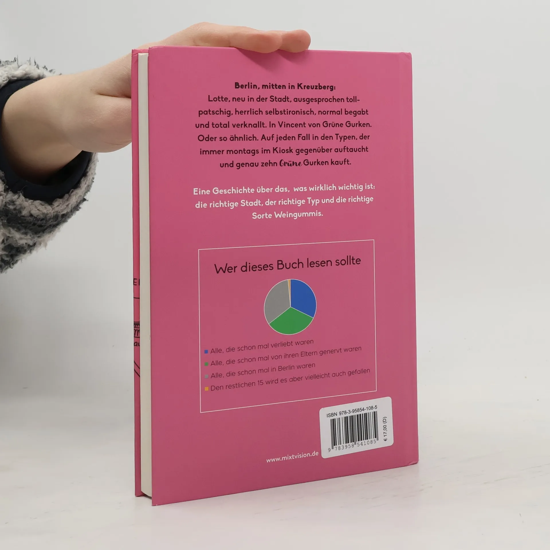 Wie grüne Weingummis das Leben eines Mädchens komplett auf den Kopf stellen! Lotte hat es nicht leicht: Sie zieht mit ihren Eltern aus ihrem geliebten Heimatdorf nach Berlin Kreuzberg. Als sie sich aus der neuen Wohnung aussperrt, landet sie im Späti gegenüber und übernimmt den Laden. Es geht Schlag auf Schlag: Der erste Job, der erste Kuss und die erste Liebe folgen. Kreuzberg – Kotti – Küsse im Späti – Berlin findet einen Platz in Lottes Herz. Die Geschichte thematisiert das Gefühlschaos eines Teenagers in der Pubertät, das Erwachsenwerden und erste Verantwortung. Das Jugendbuch feiert das Verliebtsein und die Jugendliebe in einer Zeit, in der die Hormone verrückt spielen. Lena Hach trifft den Ton eines verliebten Mädchens, während Katja Berlin originelle Infografiken gestaltet. Mit Antolin-Quizfragen ist es ideal für die Schule geeignet. Regional und klimafreundlich – das Buch wurde in Deutschland gedruckt und erhielt den Leipziger Lesekompass 2019. „Ein zuckersüßer und doch gehaltvoller Berlinroman – zum Verlieben. Für alle, die auf moderne Großstadtromanzen und Tortendiagramme stehen. Herz erwärmende Freizeitlektüre, die auch kreative Impulse für den Umgang mit Text und Bild bietet…“ (Leipziger Lesekompass 2019)