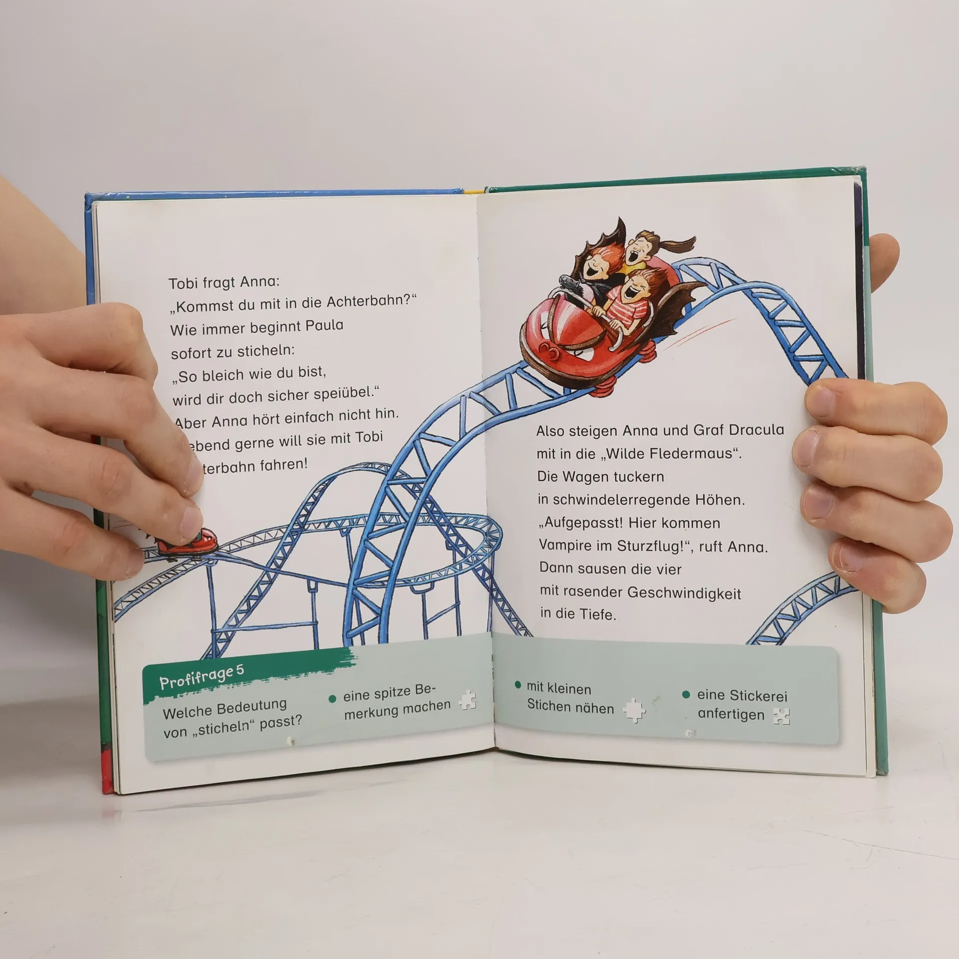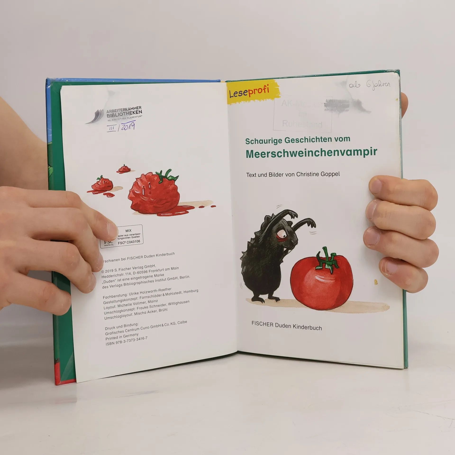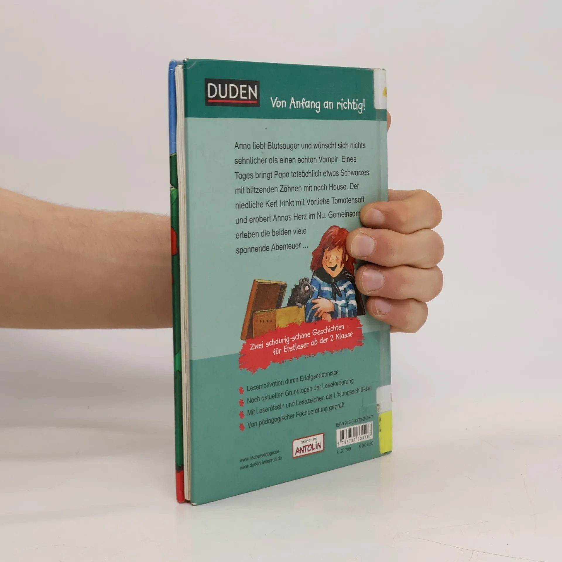 Duden – von Anfang an richtig! Lesenlernen leicht gemacht: Erstlesespaß für Kinder ab der 2. Klasse Anna liebt Blutsauger und wünscht sich nichts sehnlicher als einen echten Vampir. Eines Tages bringt Papa etwas Schwarzes mit blitzenden Zähnen mit nach Hause – und Anna ist selig! Der kleine Graf Dracula, seines Zeichens Meerschweinchenvampir, ernährt sich mit Vorliebe von Tomatensaft. Der niedliche Kerl erobert Annas Herz im Nu, und gemeinsam erleben die beiden viele spannende Abenteuer. 2 lustige Geschichten in einem Band – für doppeltes Lesevergnügen! So geht zeitgemäße Leseförderung: Diese spannende und mit viel Liebe zum Detail illustrierte Erstlesegeschichte aus der Reihe „Leseprofi“ von FISCHER Duden Kinderbuch sorgt garantiert für Lesespaß. Der Text ist genau auf die Bedürfnisse der Jungen und Mädchen zugeschnitten. So erleben sie schnell motivierende Erfolge. Kleine, abwechslungsreiche Rätsel zur Sicherung des Textverständnisses begleiten beim Lesen. Ein interaktives Lesezeichen dient als Lösungsschlüssel. Alle Titel der Reihe werden bei Antolin gelistet und von einer pädagogischen Fachberatung geprüft.