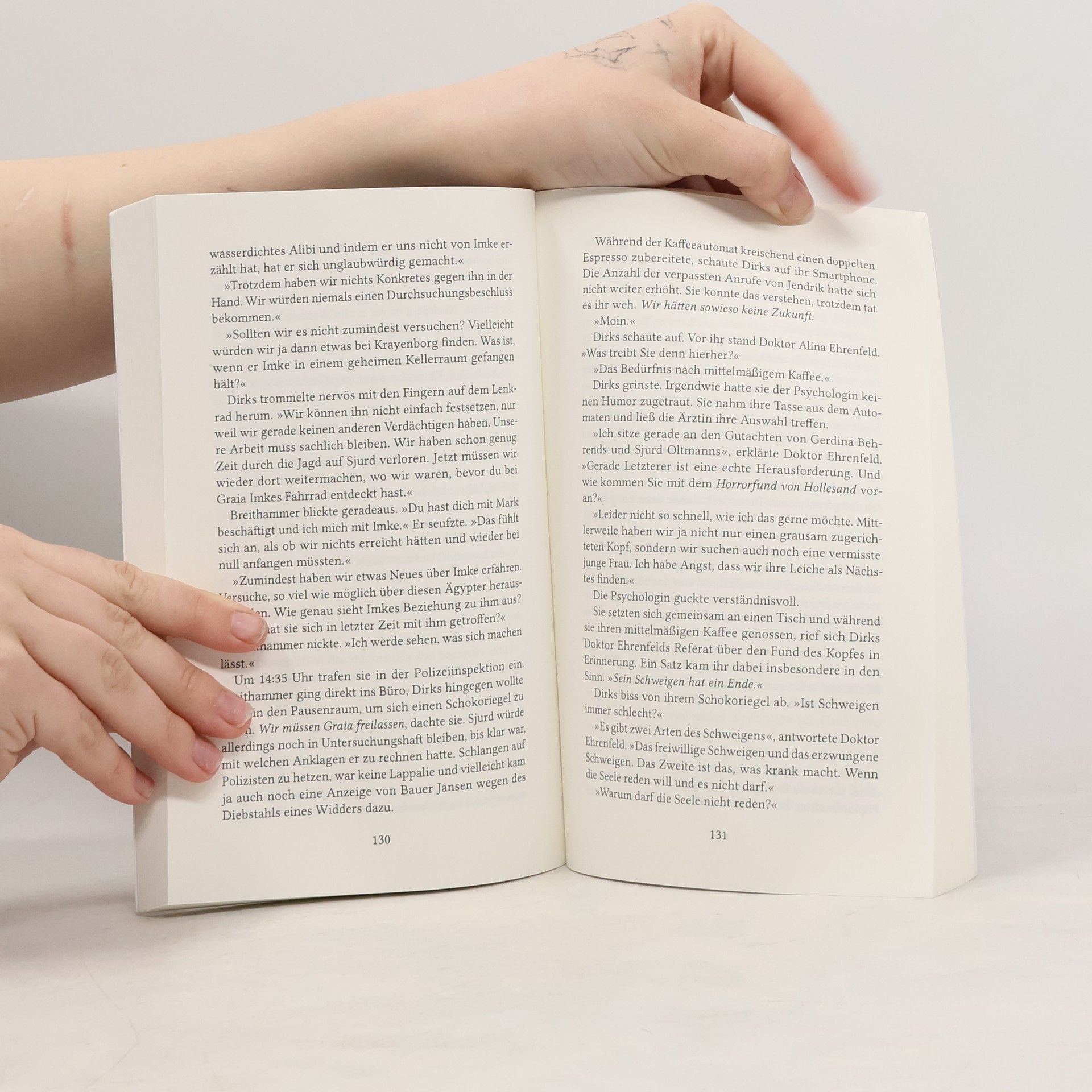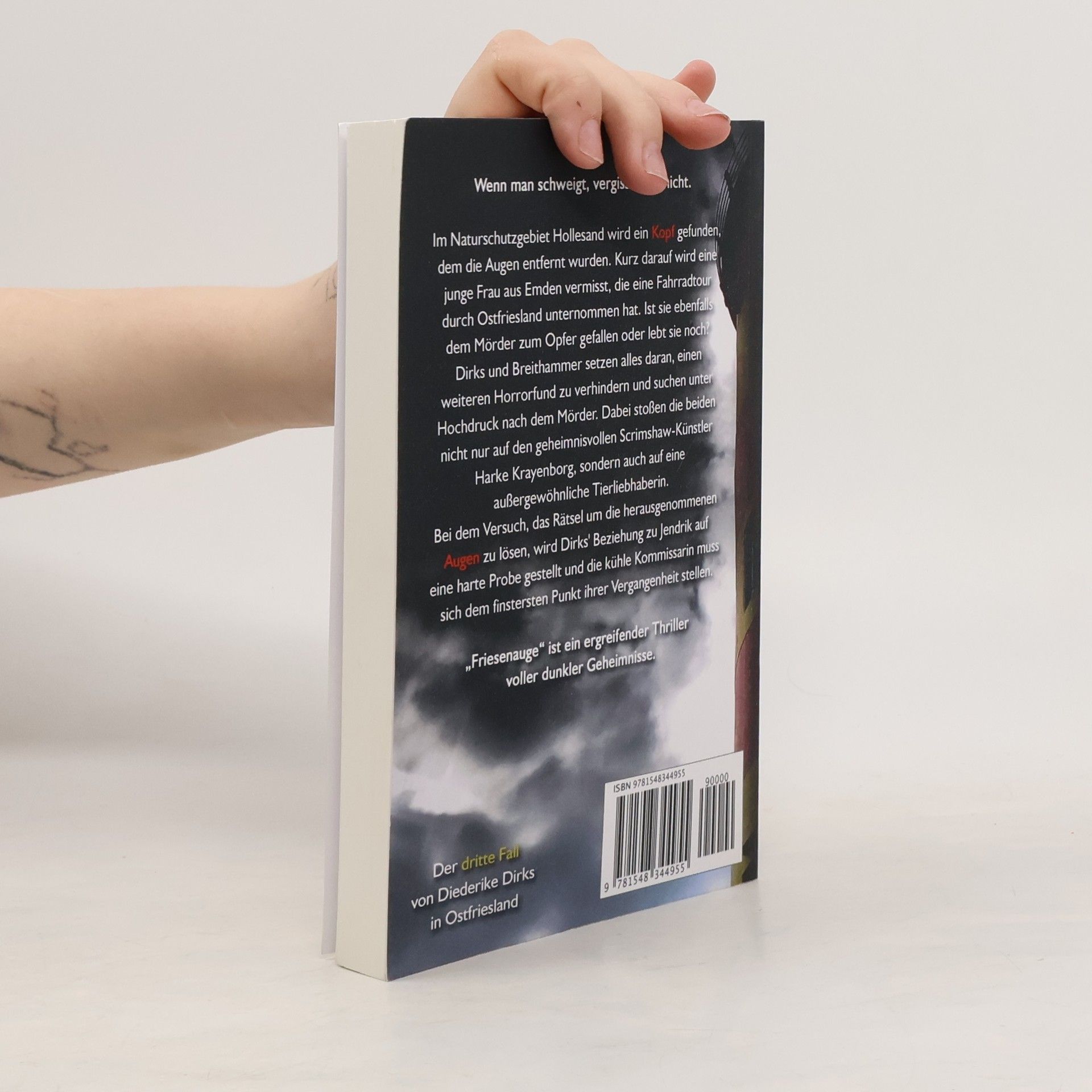 Wenn man schweigt, vergisst man nicht. Im Naturschutzgebiet Hollesand wird ein Kopf gefunden, dem die Augen entfernt wurden. Kurz darauf wird eine junge Frau aus Emden vermisst, die eine Fahrradtour durch Ostfriesland unternommen hat. Ist sie ebenfalls dem M�rder zum Opfer gefallen oder lebt sie noch? Dirks und Breithammer setzen alles daran, einen weiteren Horrorfund zu verhindern und suchen unter Hochdruck nach dem M�rder. Dabei sto�en die beiden nicht nur auf den geheimnisvollen Scrimshaw-K�nstler Harke Krayenborg, sondern auch auf eine au�ergew�hnliche Tierliebhaberin. Bei dem Versuch, das R�tsel um die herausgenommenen Augen zu l�sen, wird Dirks' Beziehung zu Jendrik auf eine harte Probe gestellt und die k�hle Kommissarin muss sich dem finstersten Punkt ihrer Vergangenheit stellen. Friesenauge" ist ein ergreifender Thriller voller dunkler Geheimnisse. Leserstimmen Ein Kopfkino der ganz besonderen Art." Eine geradezu intelligente und spannende Lekt�re." Spannende Storyline gespickt mit herrlichem Humor."