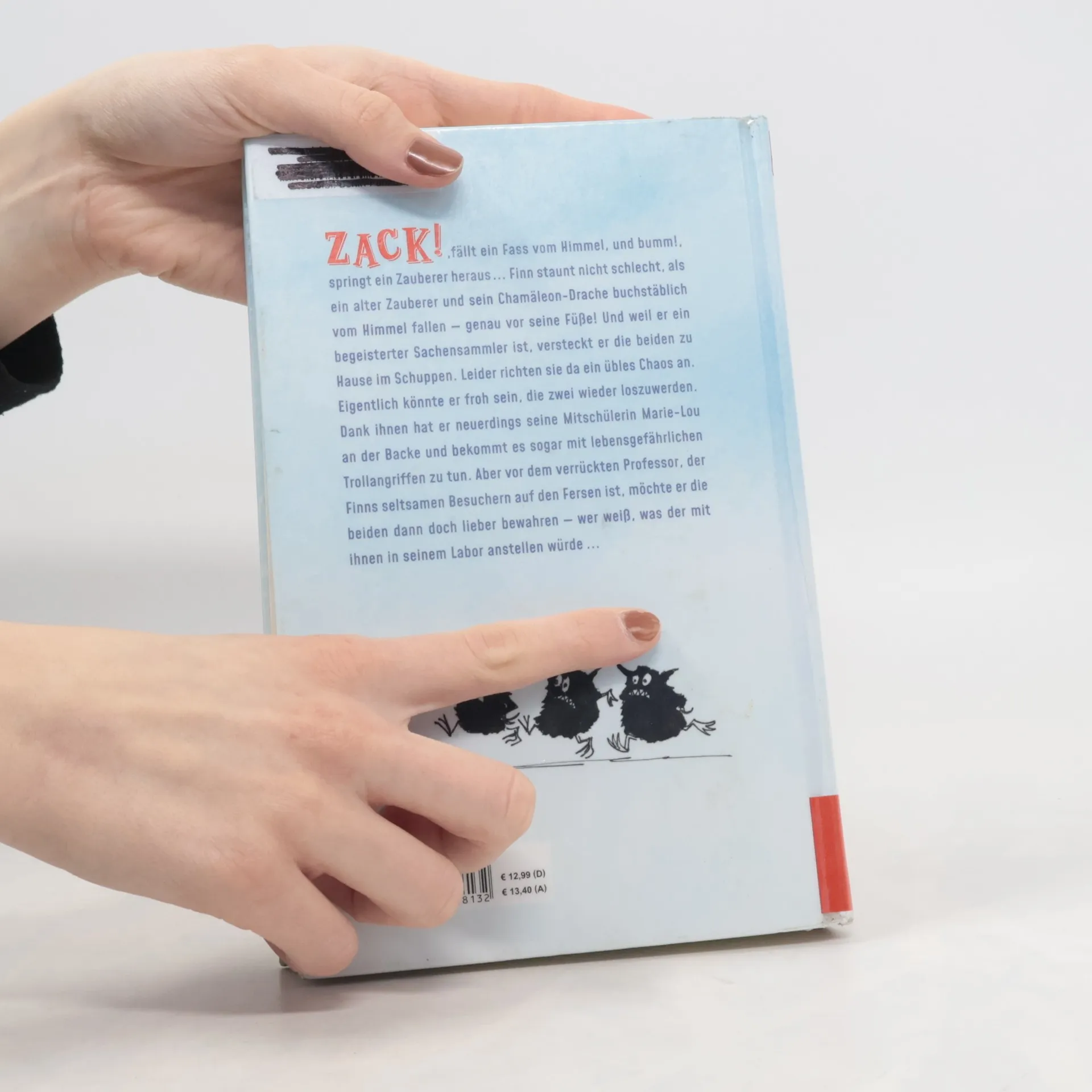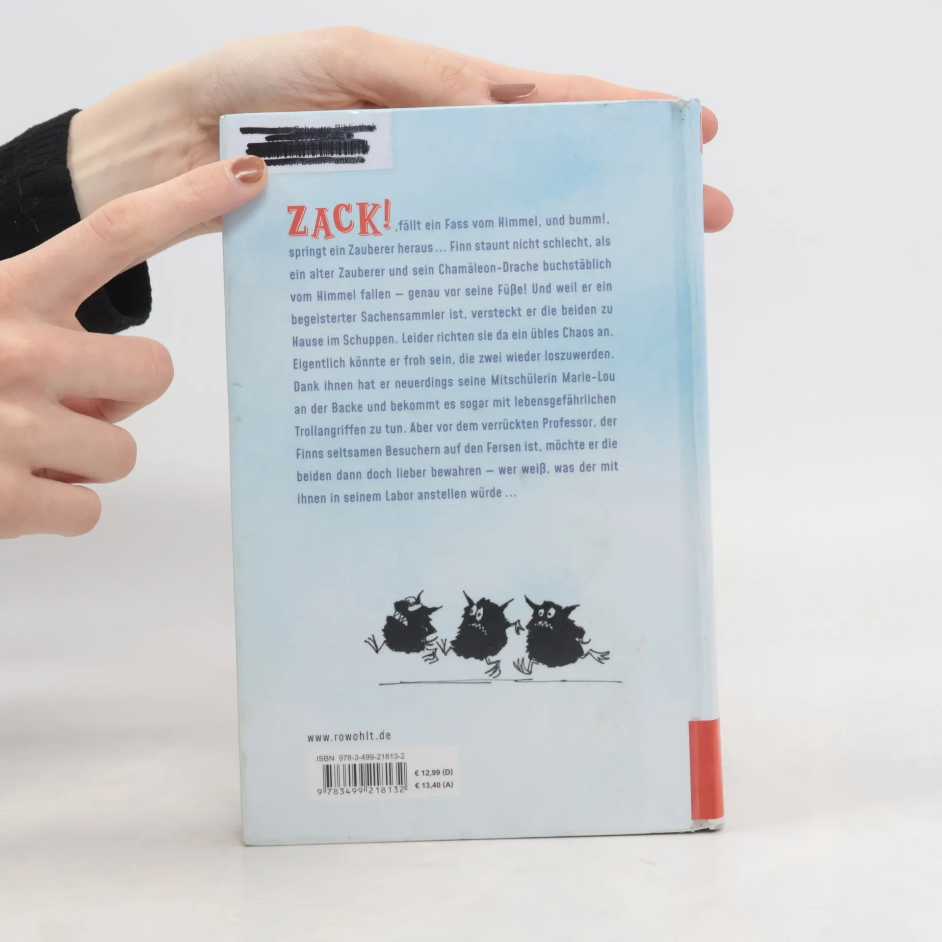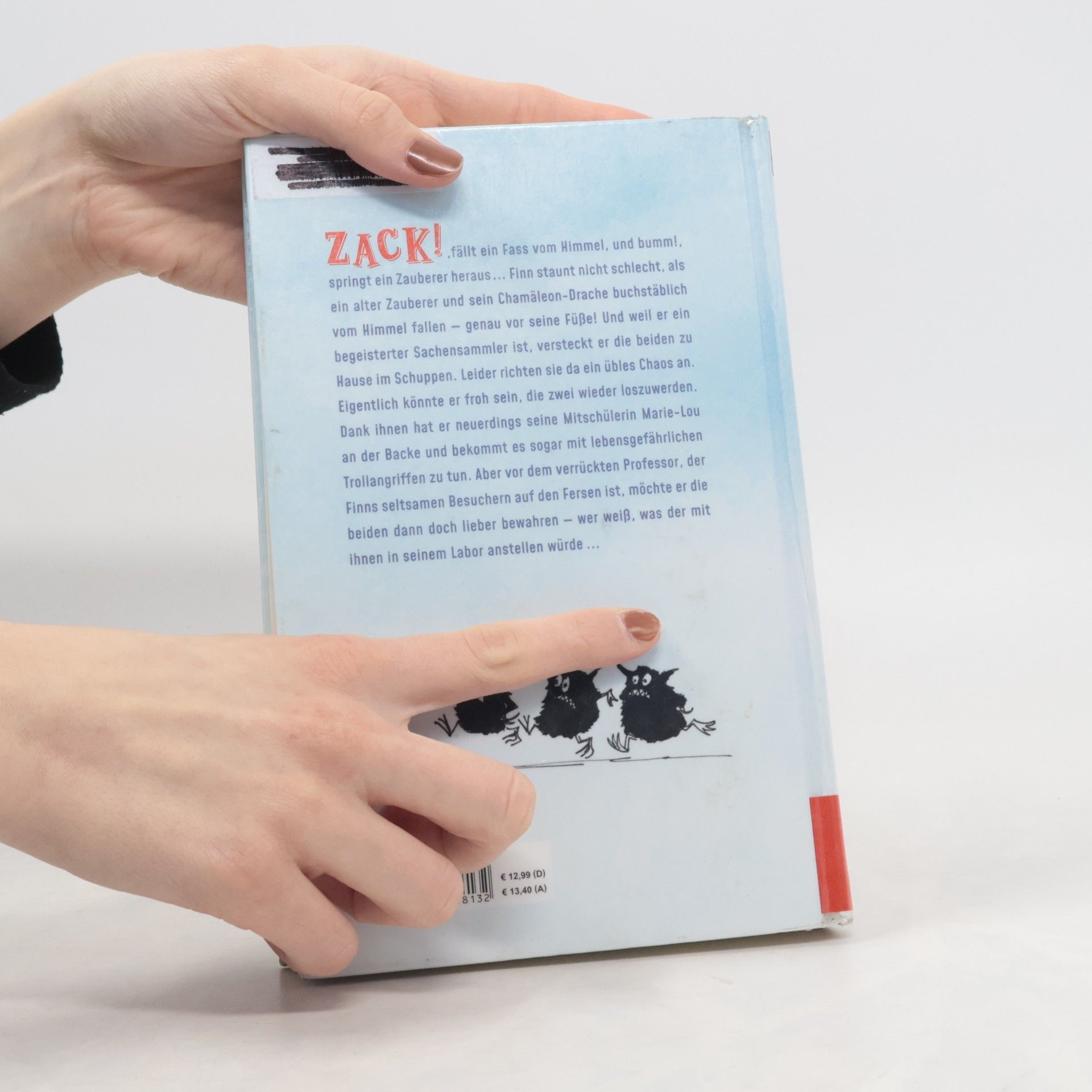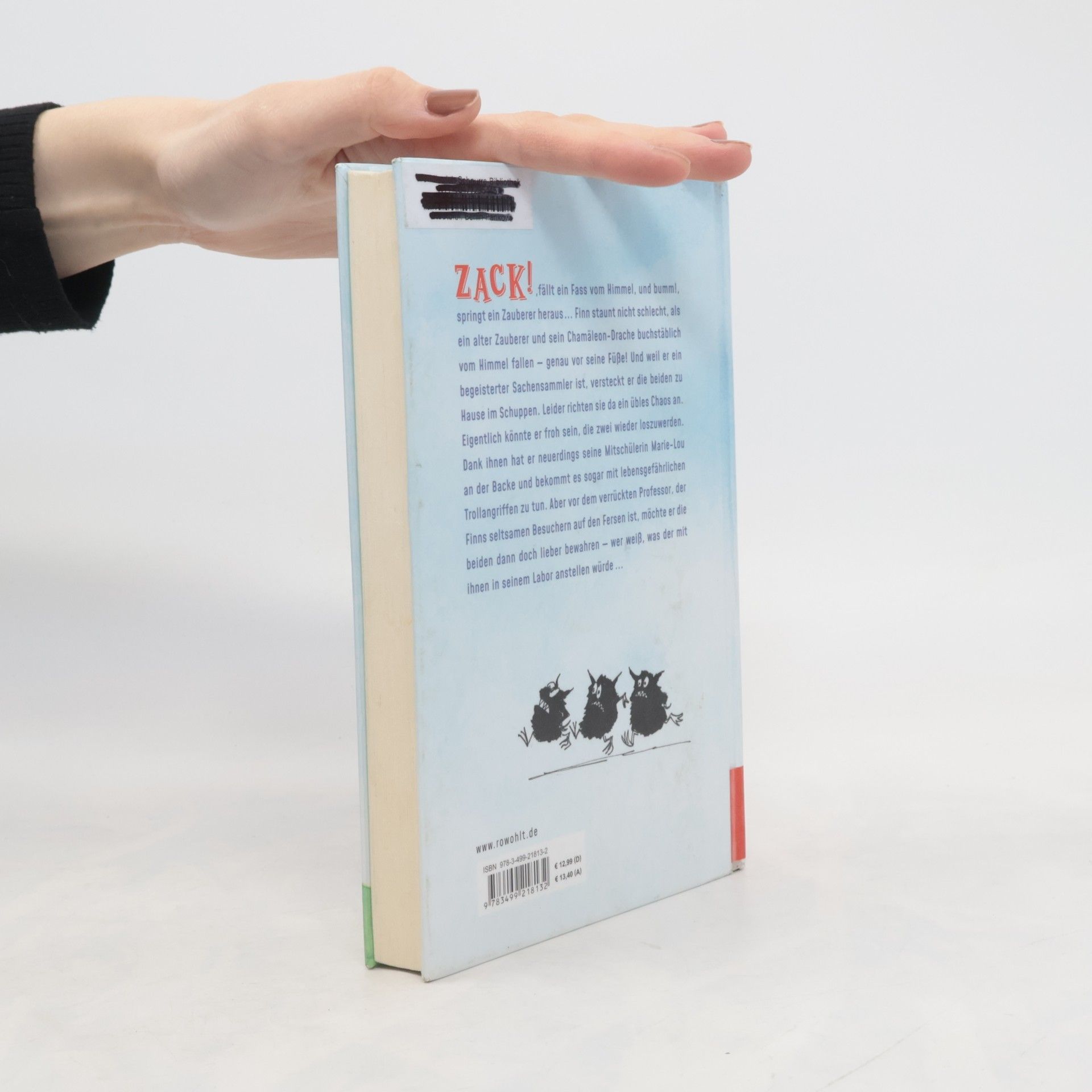 Zack!, fällt ein Fass vom Himmel, und huch!, rollt ein Zauberer heraus … Finn staunt nicht schlecht, als ein alter Zauberer und sein Chamäleon-Drache buchstäblich vom Himmel fallen – genau vor seine Füße! Und weil er ein begeisterter Sachensammler ist, versteckt er die beiden zuhause im Schuppen. Leider richten sie da ein übles Chaos an. Eigentlich könnte er froh sein, die zwei wieder loszuwerden. Dank ihnen hat er neuerdings seine Mitschülerin Marie-Lou an der Backe und bekommt es sogar mit lebensgefährlichen Trollangriffen zu tun. Aber vor dem verrückten Professor, der Finns seltsamen Besuchern auf den Fersen ist, möchte er die beiden dann doch lieber bewahren – wer weiß, was der mit ihnen in seinem Labor anstellen würde …