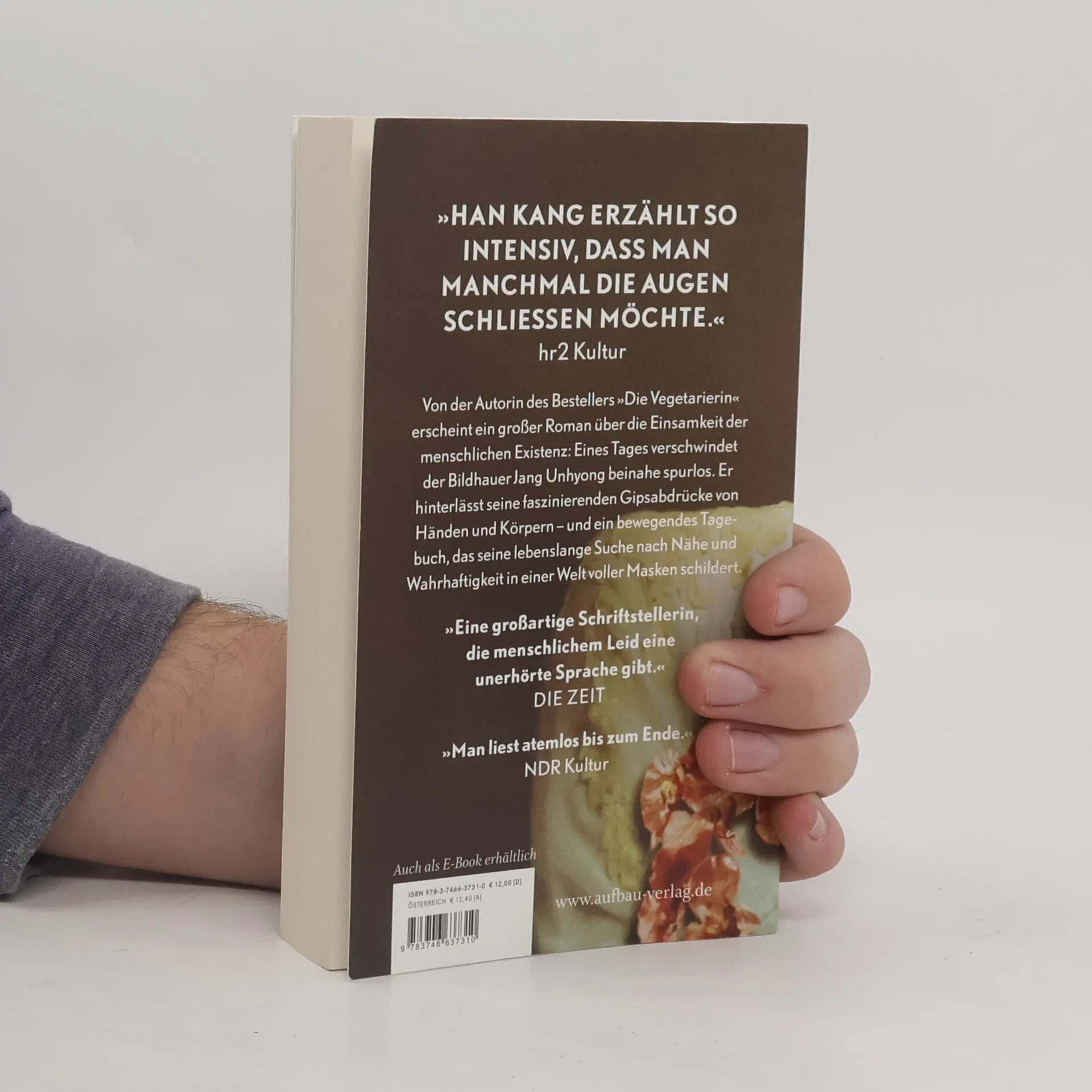 Nobelpreis für Literatur 2024 Von der Autorin des internationalen Bestsellers »Die Vegetarierin« Ein großer Roman über die Einsamkeit der menschlichen Existenz. Eines Tages verschwindet der Bildhauer Jang Unhyong beinahe spurlos. Er hinterlässt seine faszinierenden Gipsabdrücke von Händen und Körpern – und ein bewegendes Tagebuch, das seine lebenslange Suche nach Nähe und Wahrhaftigkeit in einer Welt voller Masken schildert. »Han Kang erzählt zugleich mit großer Brutalität und großer Poesie – eine Mischung, die nur wenigen Schriftstellern gelingt.« stern »Man kann sich dieser Stimme nicht entziehen.« Independent