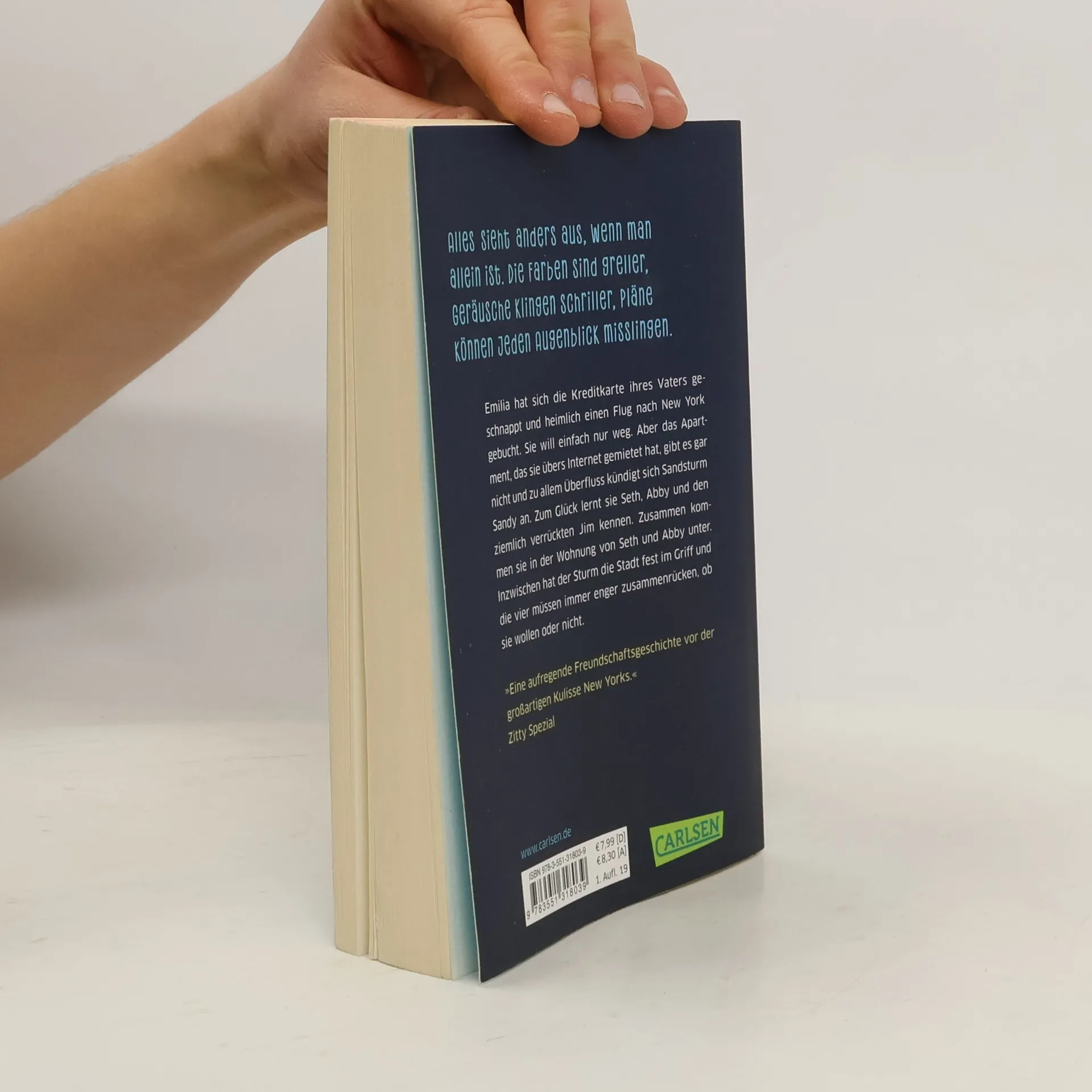 Eine spannende Coming-of-Age-Geschichte vor der einmaligen Kulisse von New York. Emilia hat sich die Kreditkarte ihres Vaters geschnappt und einen Flug nach New York gebucht. Sie will einfach nur weg. Aber das Apartment, das sie übers Internet gemietet hat, gibt es gar nicht und zu allem Überfluss kündigt sich Wirbelsturm Sandy an. Zum Glück lernt sie Seth, Abby und den ziemlich verrückten Jim kennen. Zusammen kommen sie in der Wohnung von Seth und Abby in SoHo unter. Inzwischen hat der Sturm die Stadt fest im Griff: das Haus beginnt zu wackeln, dann fällt der Strom aus. Die vier müssen immer enger zusammenrücken, ob sie wollen oder nicht.