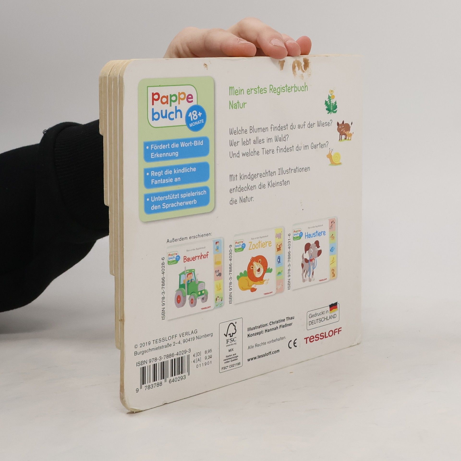 Welche Blumen findest du auf der Wiese? Wer lebt alles im Wald? Und welche Tiere findest du im Garten? Auf jeder Doppelseite des Bilderbuchs sind klar illustrierte Tiere, Insekten, Pflanzen und Lebensräume aus der Natur zu sehen, die die Kinder vielleicht schon kennen. Mit der Reihe „Mein erstes Registerbuch“ entdecken Kinder ab 18 Monaten den Bauernhof, Tiere im Zoo, die Natur und die Haustiere. Die hochwertigen Bücher aus extra dicker Pappe erscheinen innerhalb des Labels „Pappebuch von Tessloff“ und bieten mit ihren frischen und kreativen Illustrationen Unterhaltung für die Kleinsten auf hohem Niveau.