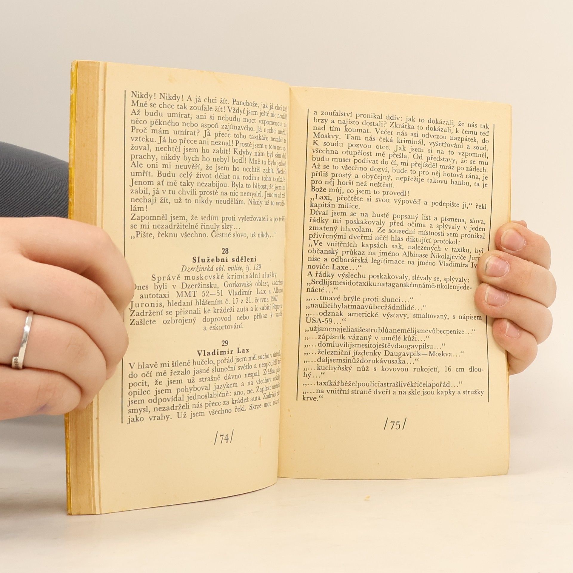 Obsahuje: Dva mezi lidmi ; Vražda naslepo. Dvě detektivní novely sovětských autorů, kteří usilují o spojení prvků detektivky a společenského románu. První, vytvořená z faktů a dokumentů, vypráví o vraždě taxikáře, druhá o vraždě novinářky, která vypátrala vrahovu minulost. První jekoncipována jako sled výpovědí účastníků, druhá jako průběh vyšetřování, vedeného pracovníky bezpečnosti Tichonovem a Šarapovem. (www.pitaval.cz)
