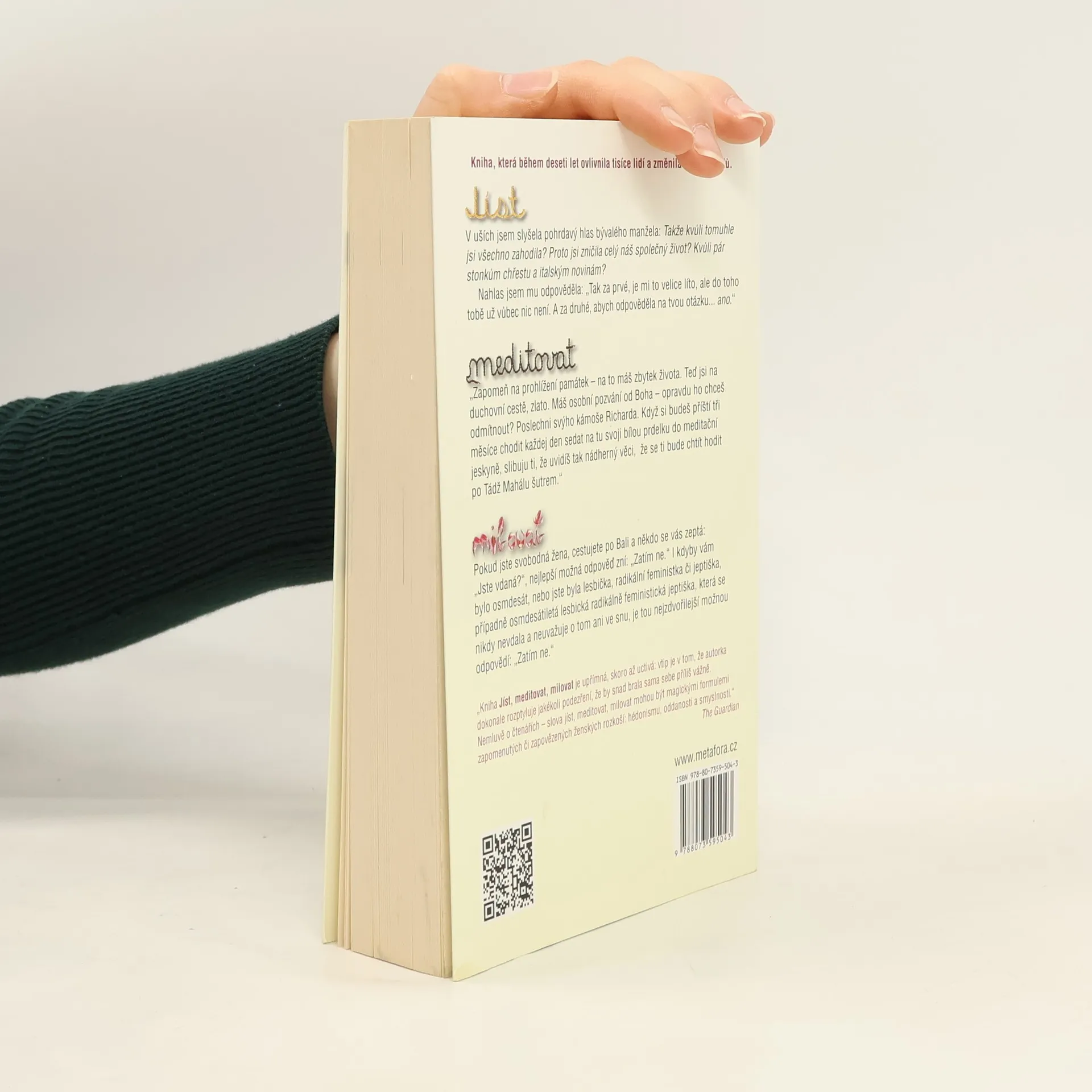 NOVĚ K 10. VÝROČÍ PRVNÍHO VYDÁNÍ. Pouť mladé dámy za pozemskými i duchovními rozkošemi napříč Itálií, Indií a Indonésií... Nové, doplněné vydání knižního (a filmového) bestselleru. Elizabeth má vše, co se od moderní Američanky očekává: manžela, dům a úspěšnou kariéru. Jenže místo aby se cítila šťastná, pohlcuje ji panika, zoufalství a zmatek. Odhodlá se tedy k radikálnímu kroku. Úplně sama se vydá na roční pouť kolem světa. V Itálii studuje umění rozkoše, flirtuje, nezřízeně hoduje a přibere deset nejšťastnějších kilogramů svého života. V Indii absolvuje čtyřměsíční duchovní cestu do vlastního nitra, na níž nechybí ani tak zdánlivé protiklady, jako je meditace, černý humor, mantry a vize. V Indonésii, kde se stane žačkou svérázného starého šamana, pak hledá svůj konečný cíl: rovnováhu a schopnost vybalancovat si život. JÍST... Kvůli pár stonkům chřestu a italským novinám jsi zničila náš společný život? MEDITOVAT... Uvidíš tak nádherný věci, že se ti bude chtít hodit po Tádž Mahálu šutrem. MILOVAT... Jste-li svobodná žena cestující po Bali, nejlepší odpověď na otázku „Jste vdaná?“, zní: „Zatím ne.“ Podle knihy vznikl rovněž úspěšný film s Julií Roberts v hlavní roli.