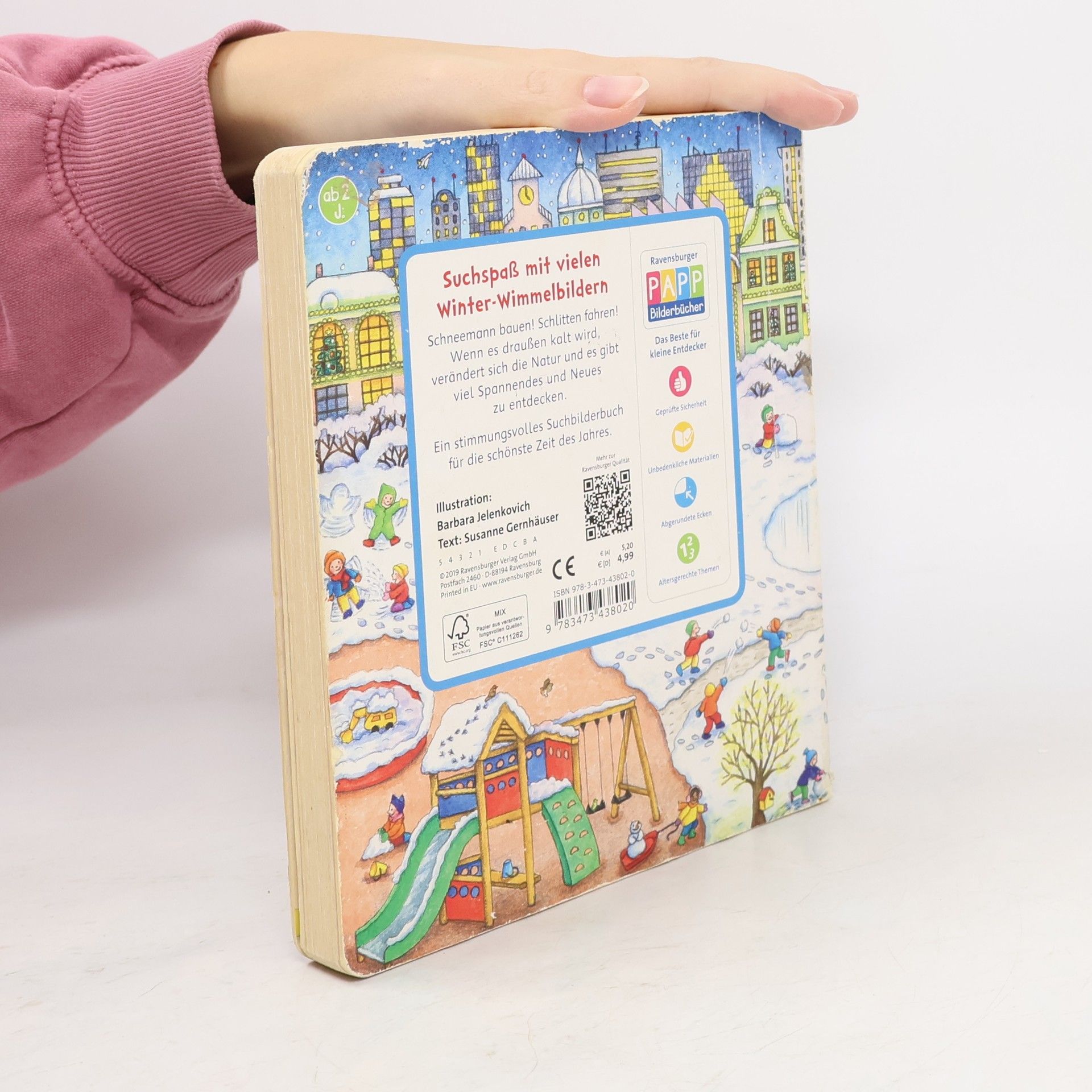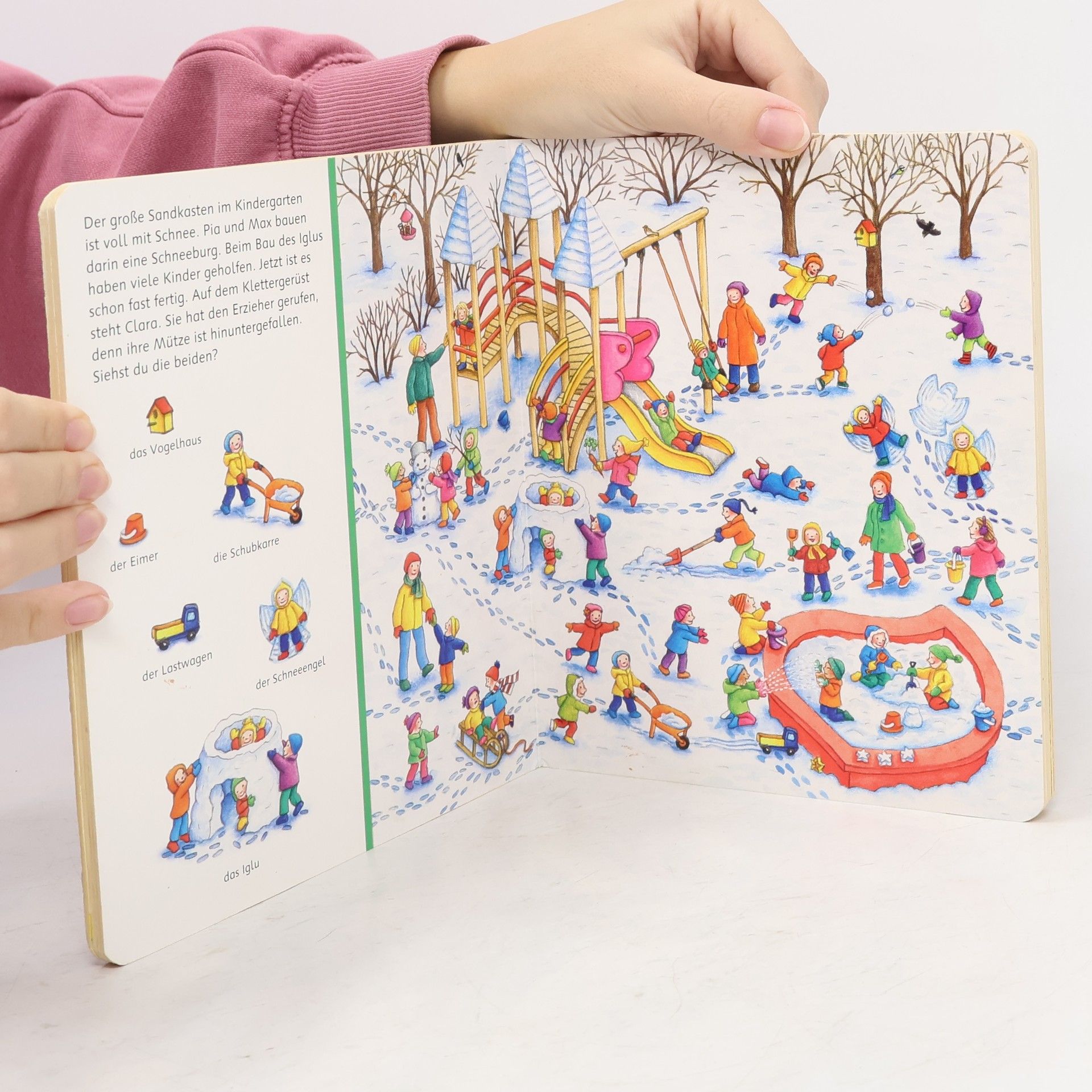 Mit dem ersten Schnee beginnt eine besondere Jahreszeit, die kleine Kinder mit großem Interesse erleben. Draußen müssen sie sich warm anziehen: Mütze, Schal und dicke Schuhe! Im Kindergarten basteln sie für Weihnachten, während Opa den Schlitten repariert. Zahlreiche Suchbilder laden dazu ein, sich intensiv mit der Winterzeit zu beschäftigen und typische Gegenstände wie Weihnachtsbaum und Schneeflocken zu benennen. Die beliebten Bücher aus der Reihe „Sachen suchen“ ermöglichen es Kindern ab 2 Jahren, spielerisch die Welt zu entdecken. Die Bücher behandeln wichtige Kinderthemen und fordern die Kleinen mit Suchbildern am Rand auf, Dinge zu erkennen und zu benennen. Das Wiederfinden der Objekte in den Wimmelbildern bietet erste Erfolgserlebnisse und stärkt das Selbstvertrauen. In diesem Buch können Kinder die Veränderungen in ihrer Umgebung und der Natur verfolgen. Auf elf Schaubildern gibt es viel zu entdecken: Im Garten bauen die Kinder einen Schneemann, im Kindergarten dekorieren sie saisonal, und zu Hause backen sie Weihnachtsplätzchen. Opa repariert den Schlitten für gemeinsame Ausflüge, und bei einem Spaziergang besuchen sie den zugefrorenen See. Auch die Adventsvorbereitungen für das Weihnachtsfest kommen nicht zu kurz.