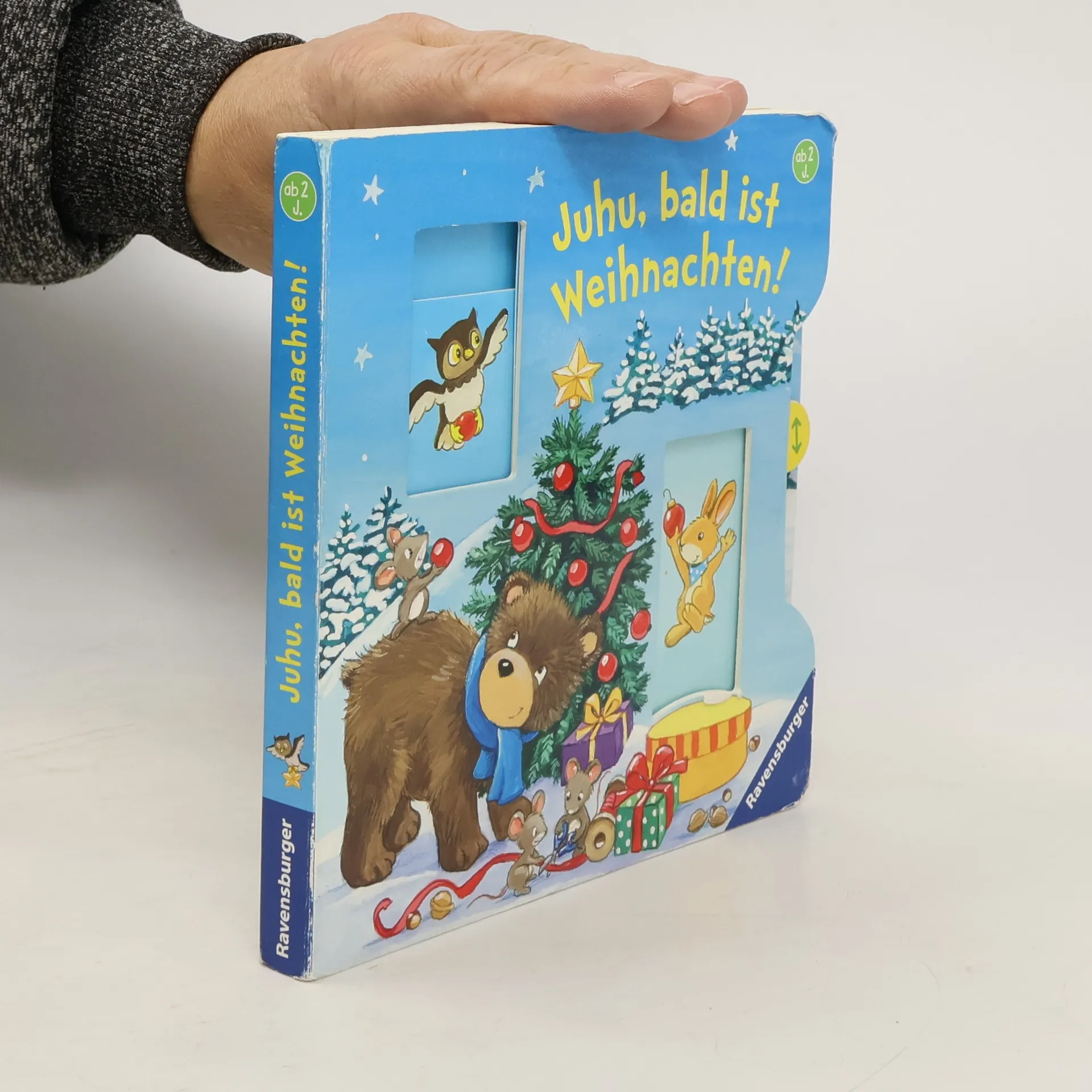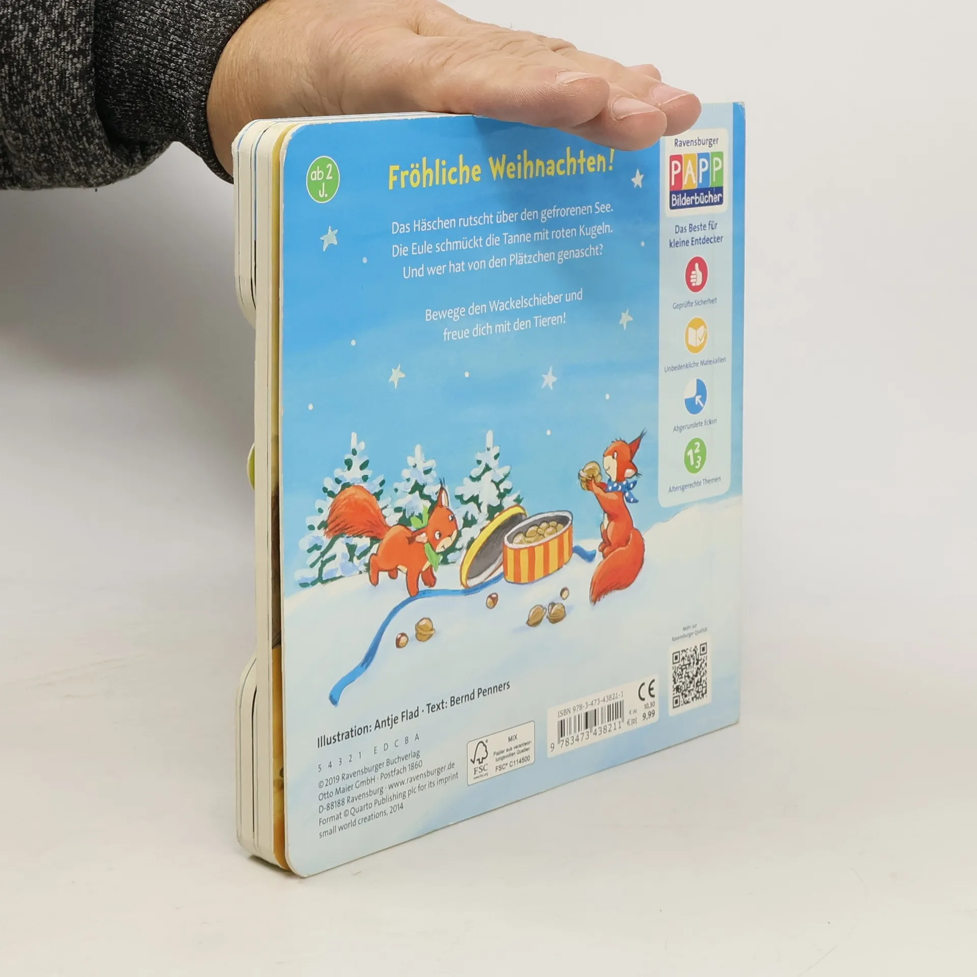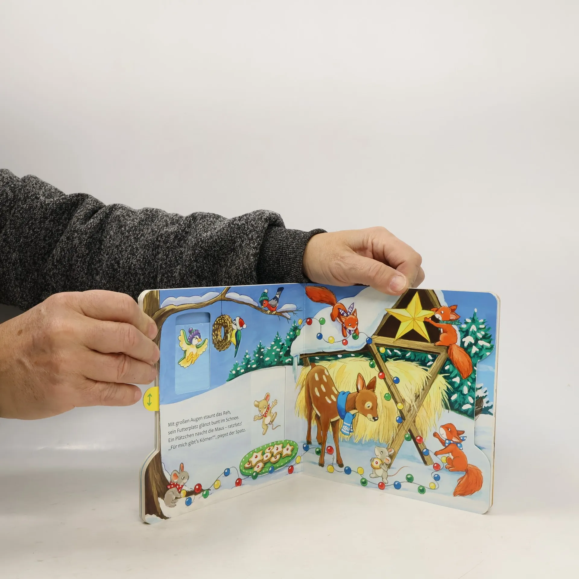 Fröhliche Weihnachten! Das Häschen rutscht über den gefrorenen See. Die Eule schmückt die Tanne mit roten Kugeln. Und wer hat von den Plätzchen genascht? Lustige Reime und ein spannender Bewegungseffekt, den schon kleine Kinderhände auslösen können, machen Spaß und verkürzen die Wartezeit auf Weihnachten. Auf fünf Doppelseiten bereiten sich die Tiere im Wald auf Weihnachten vor. Da wird gebacken, dekoriert, Geschenke gepackt und im Schnee gespielt. Neben schönen Texten, die sich zum Vorlesen eignen, enthält jede Seite einen stabilen Schieber. Schon kleine Kinderhänden bewegen ihn am Seitenrand spielend leicht hin und her und hauchen so den Tieren im Bild Leben ein. Ein stimmungsvolles Lieblingsbuch für den Advent und die Weihnachtszeit.
