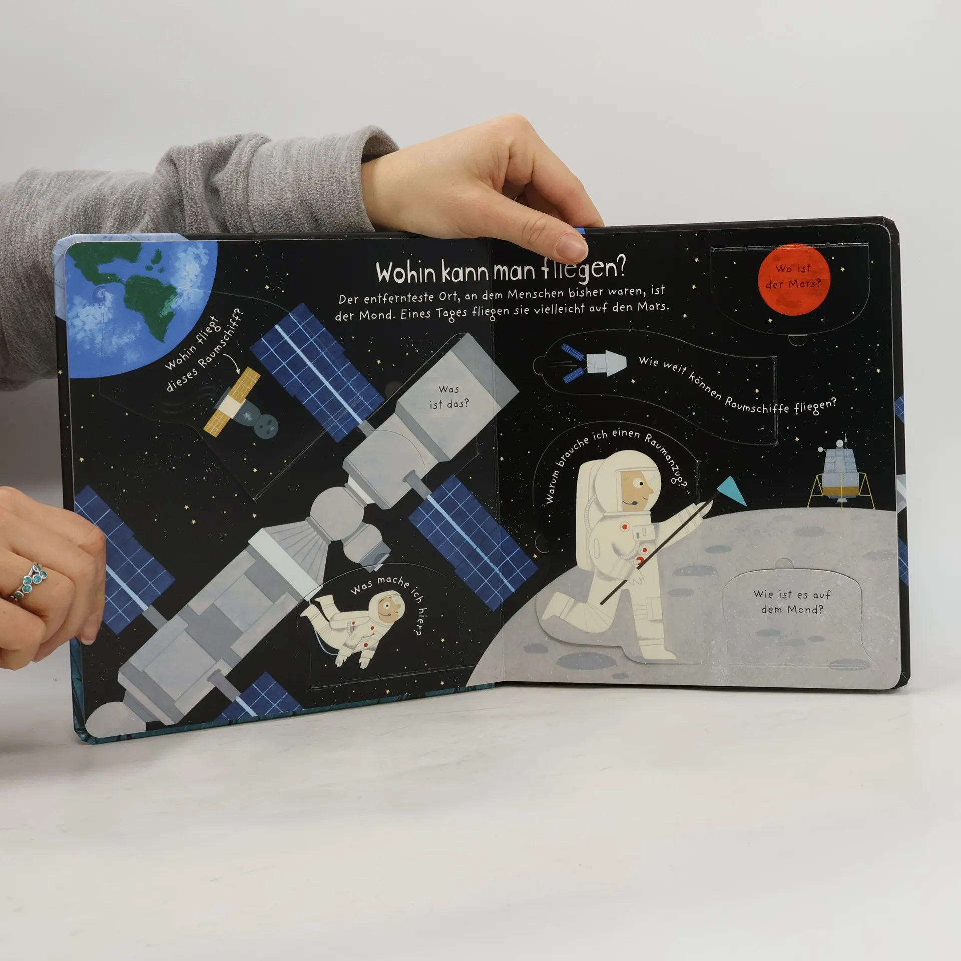Wie gelangt man in den Weltraum? Und was gibt es dort oben zu tun? Können Menschen den Mars besiedeln? Unter mehr als 40 Klappen erfährst du die Antworten auf diese spannenden Fragen.