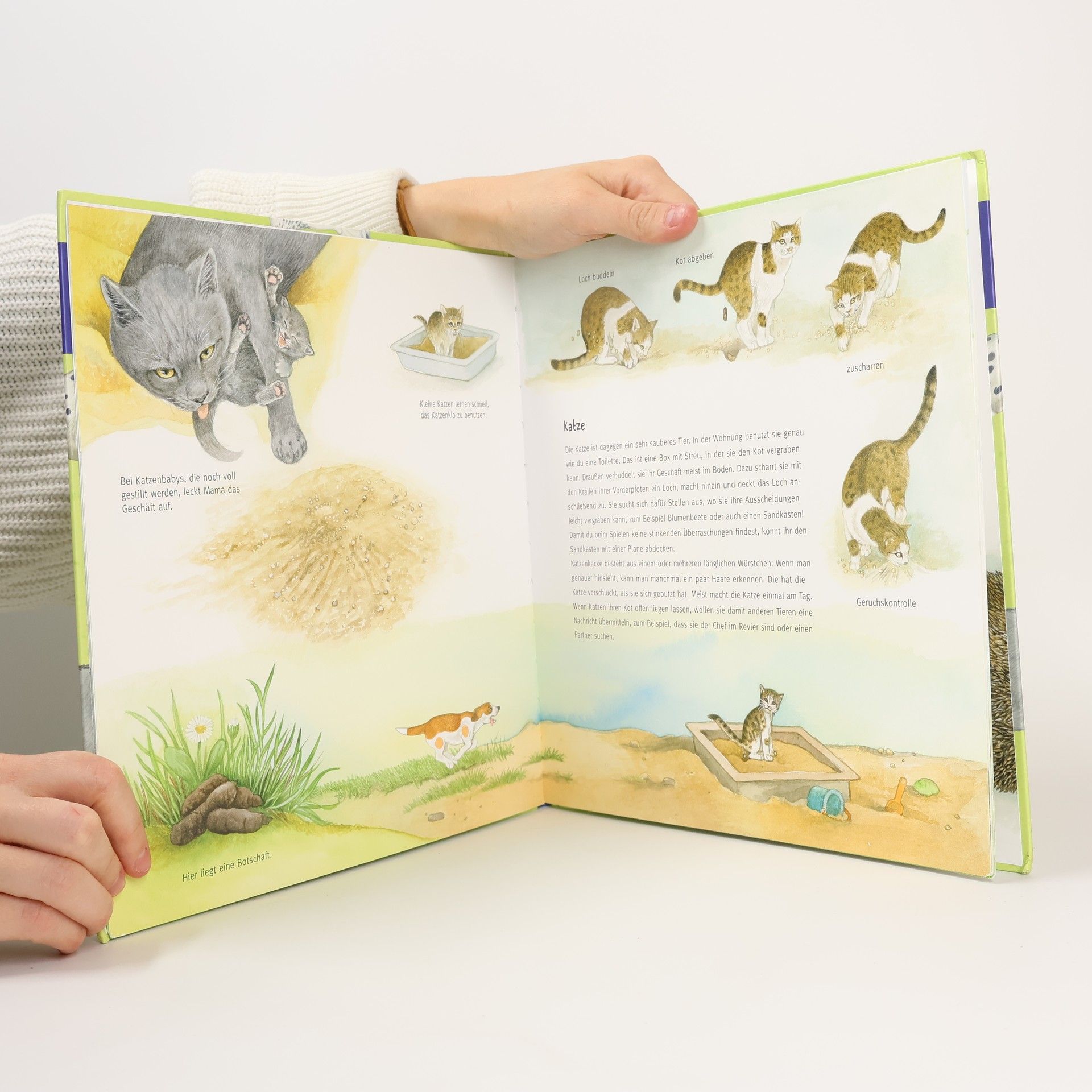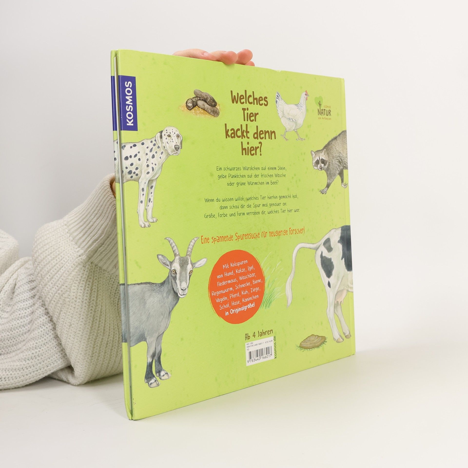 Kuhfladen, Pferdeäpfel, Hundehaufen – jedes Lebewesen scheidet Kot aus. Dieses Sachbilderbuch erklärt, wie das spannende Thema „Kacka machen“ bei Kuh, Pferd, Igel, Fledermaus und vielen weiteren heimischen Wild- und Haustieren abläuft. Anhand naturrealistischer Illustrationen lernen die Kinder, die Hinterlassenschaften zu erkennen und zuzuordnen. Lustige kleine Geschichten erzählen zu jedem Tier, wie, wo und wie oft es „muss“.