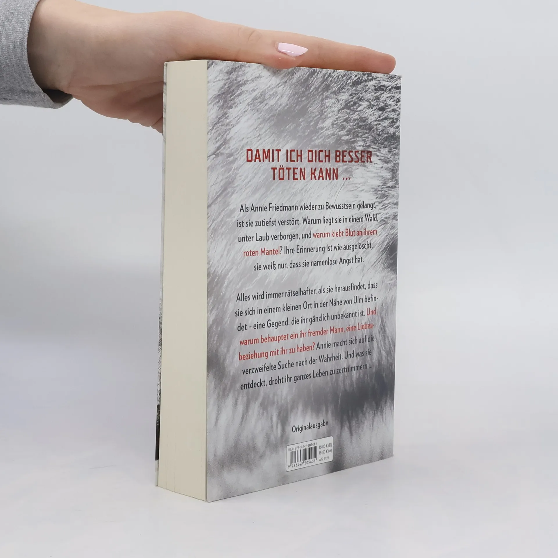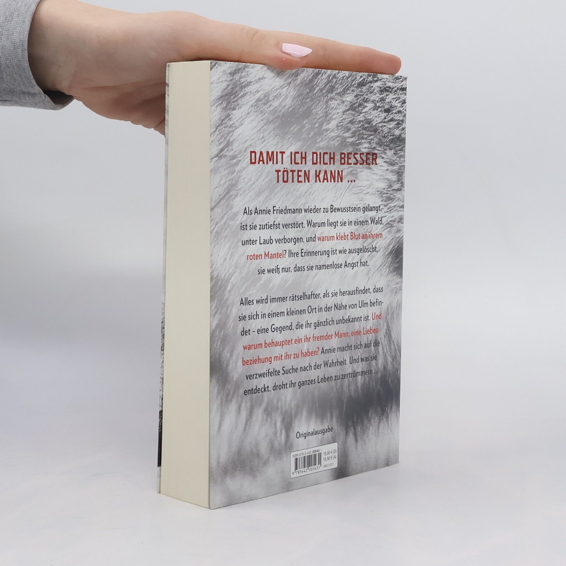 Als Annie Friedmann wieder zu Bewusstsein gelangt, ist sie zutiefst verstört. Warum liegt sie in einem Wald, unter Laub verborgen? Wie ist sie hierher gekommen, und warum klebt Blut an ihrem roten Mantel? Ihre Erinnerung ist wie ausgelöscht, sie weiß nur, dass sie namenlose Angst hat. Alles wird immer rätselhafter, als sie herausfindet, dass sie sich in einem kleinen Ort in der Nähe von Ulm befindet – eine Gegend, die ihr gänzlich unbekannt ist. Und warum behauptet ein ihr fremder Mann, eine Liebesbeziehung mit ihr zu haben? Annie macht sich auf die verzweifelte Suche nach der Wahrheit. Und was sie entdeckt, droht ihr ganzes Leben zu zertrümmern ...